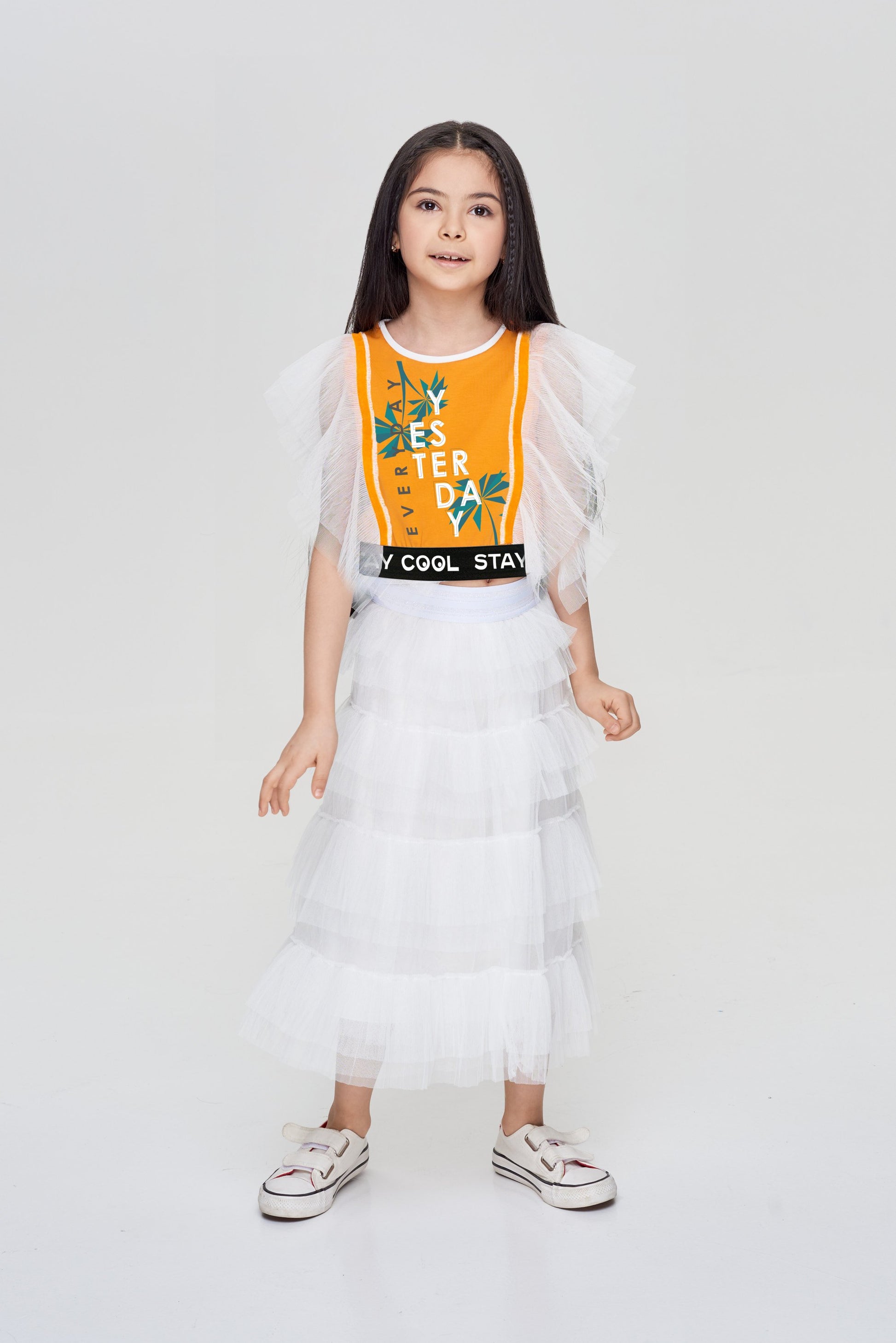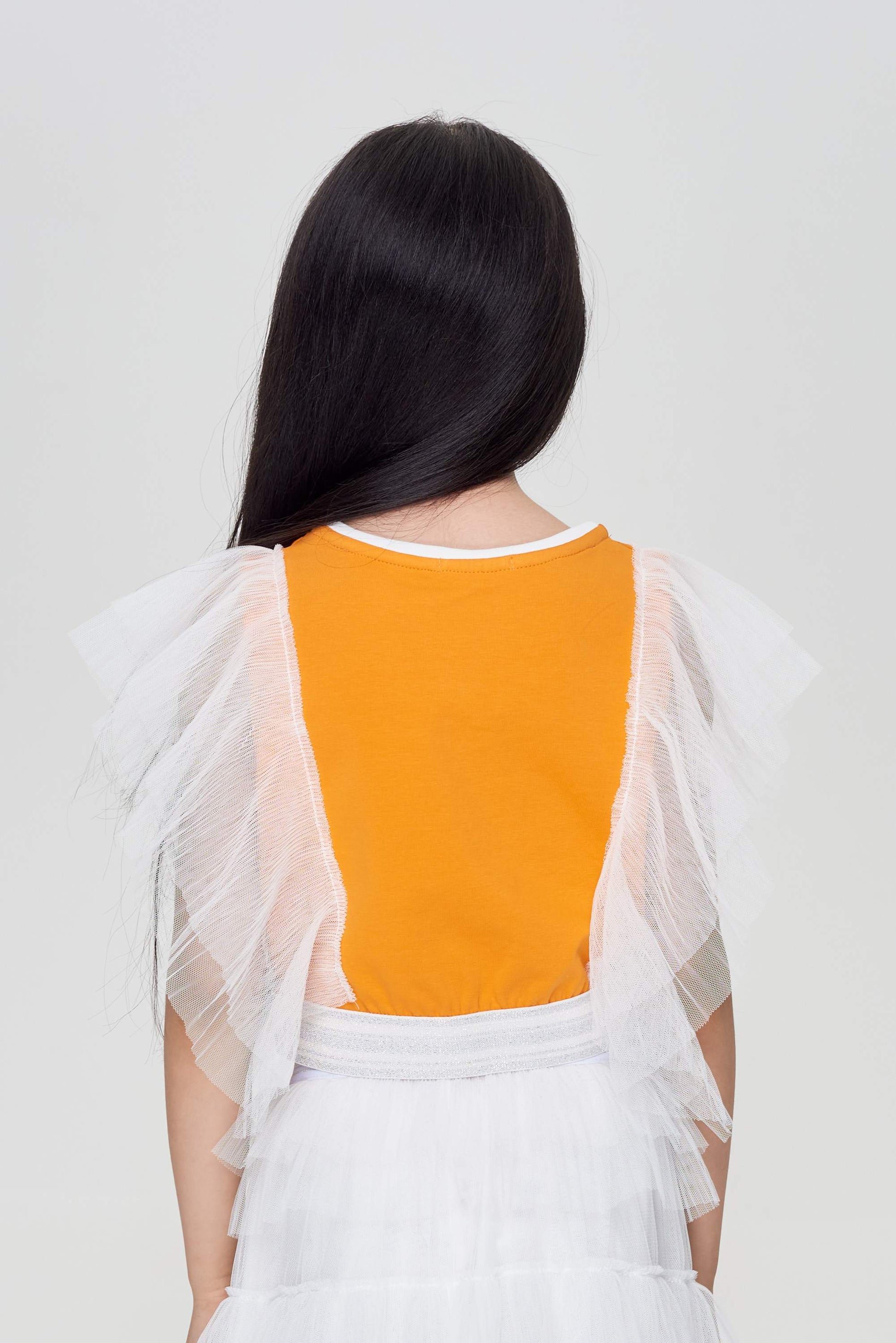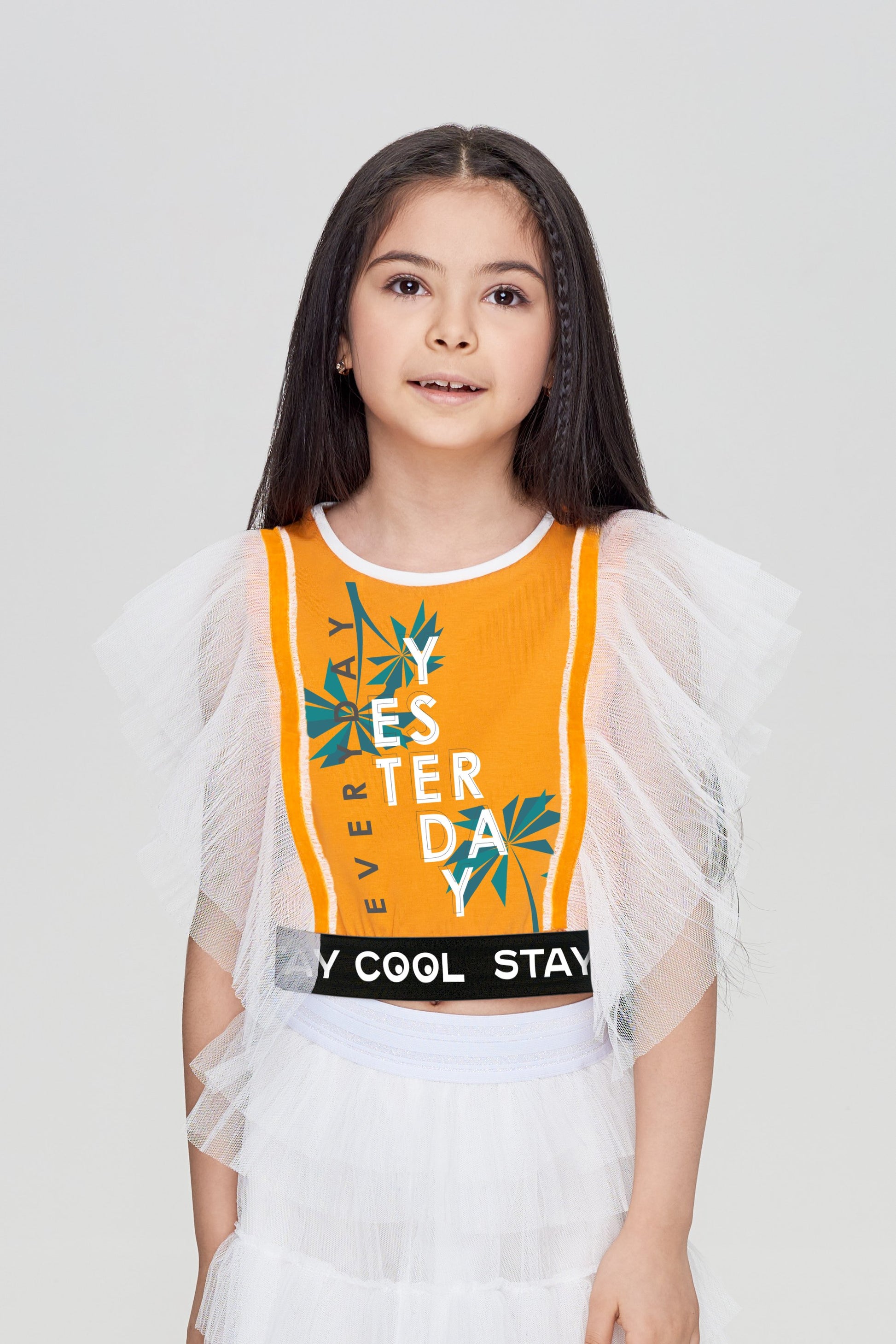 Elegant blouse for a girl. A bright cropped top of mango color will be an ideal option for summer adventures, in such clothes your princess will conquer any peaks! The model is made of natural cotton, the thin fabric is very comfortable and breathable. Short sleeves are decorated with puffy flounces. On the shelf is an original tropical print. A universal addition to the wardrobe - this thing is combined even with casual style outfits.