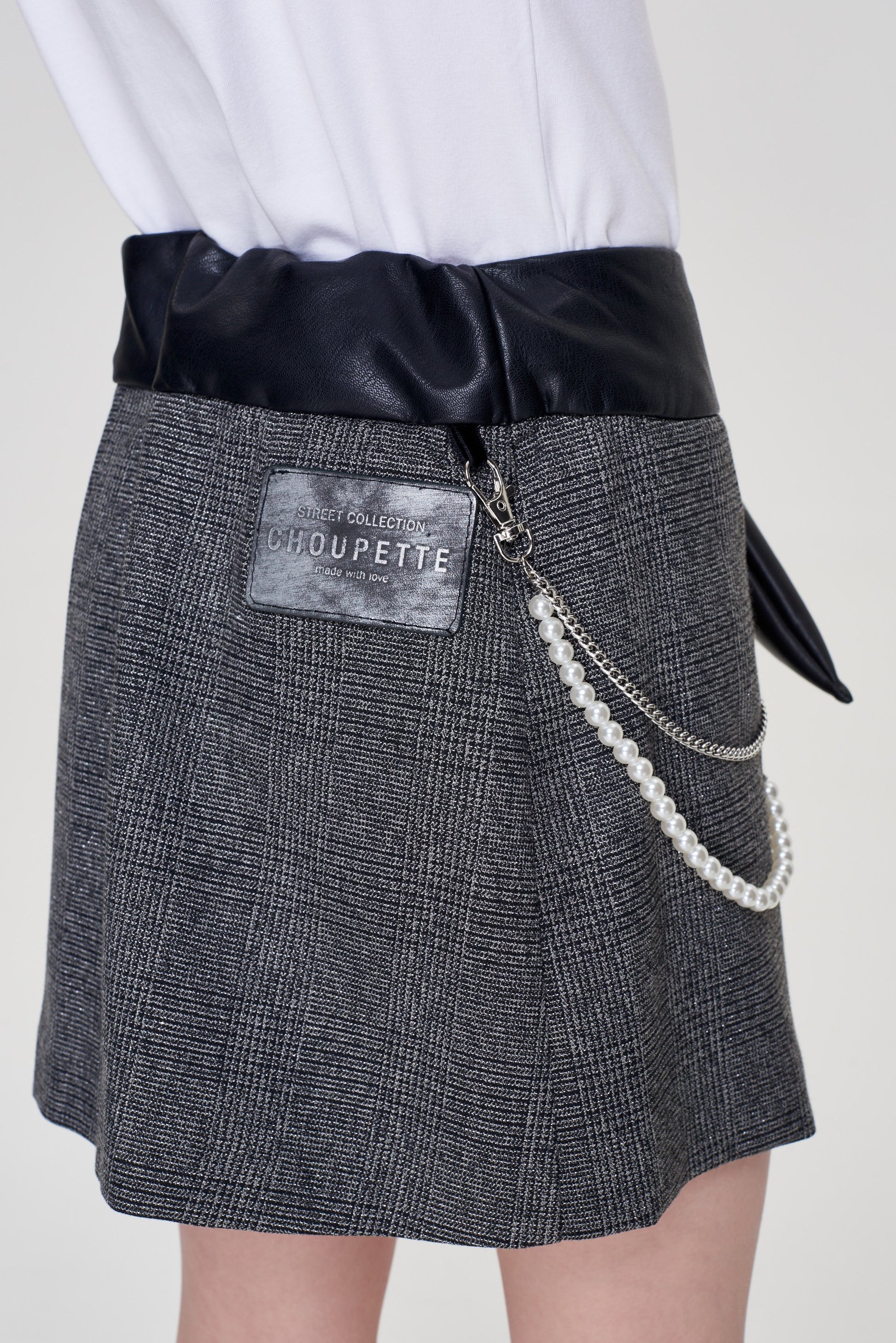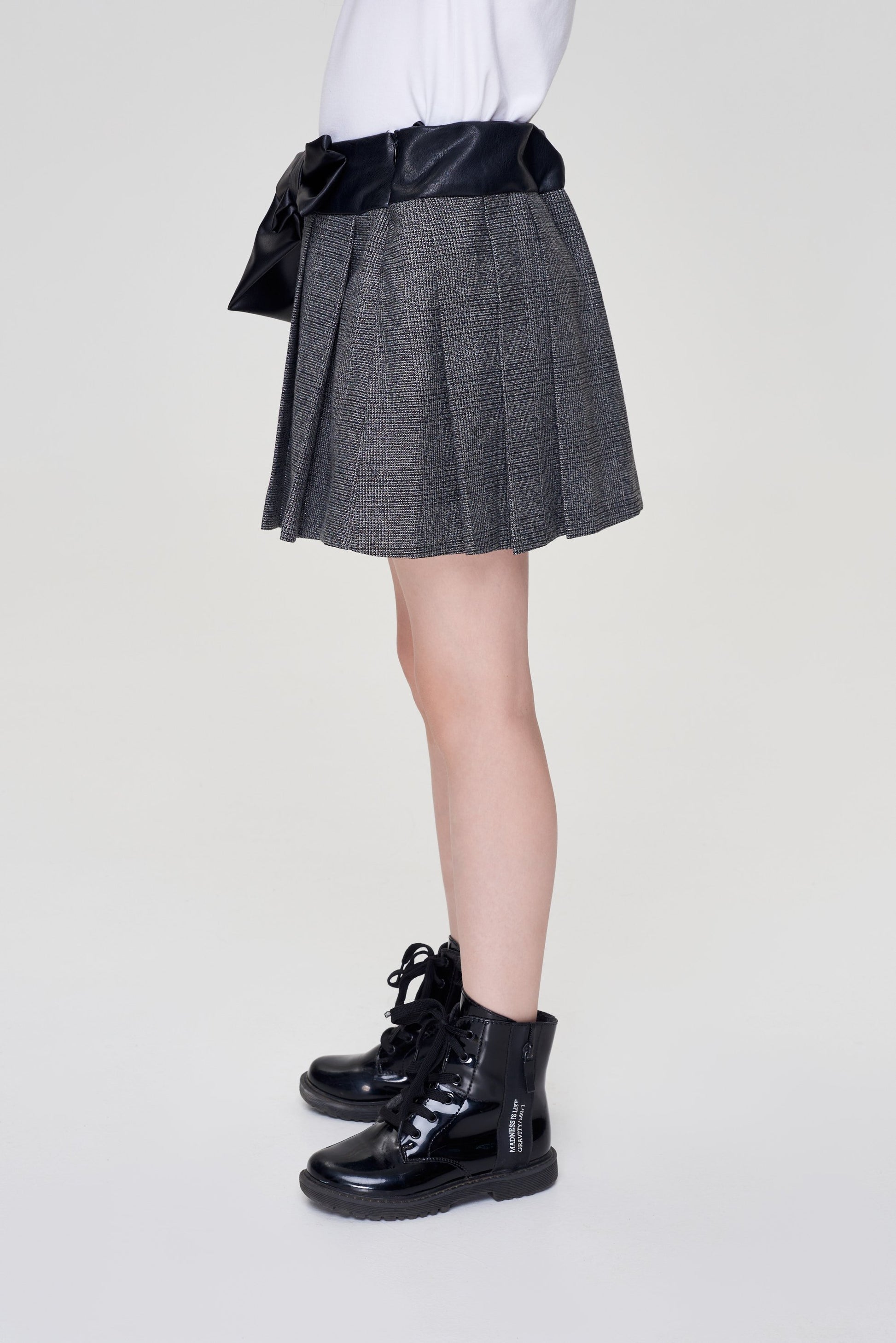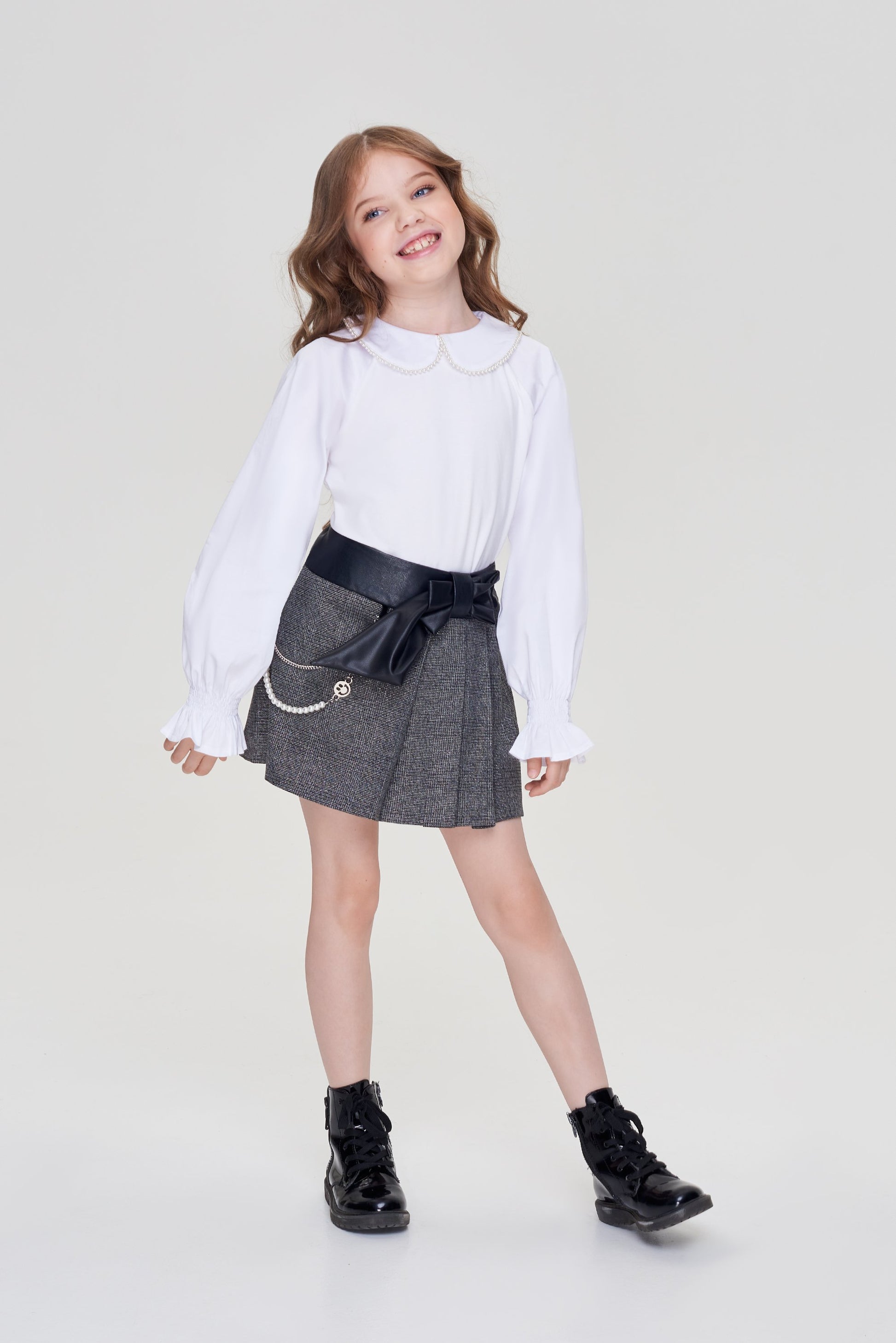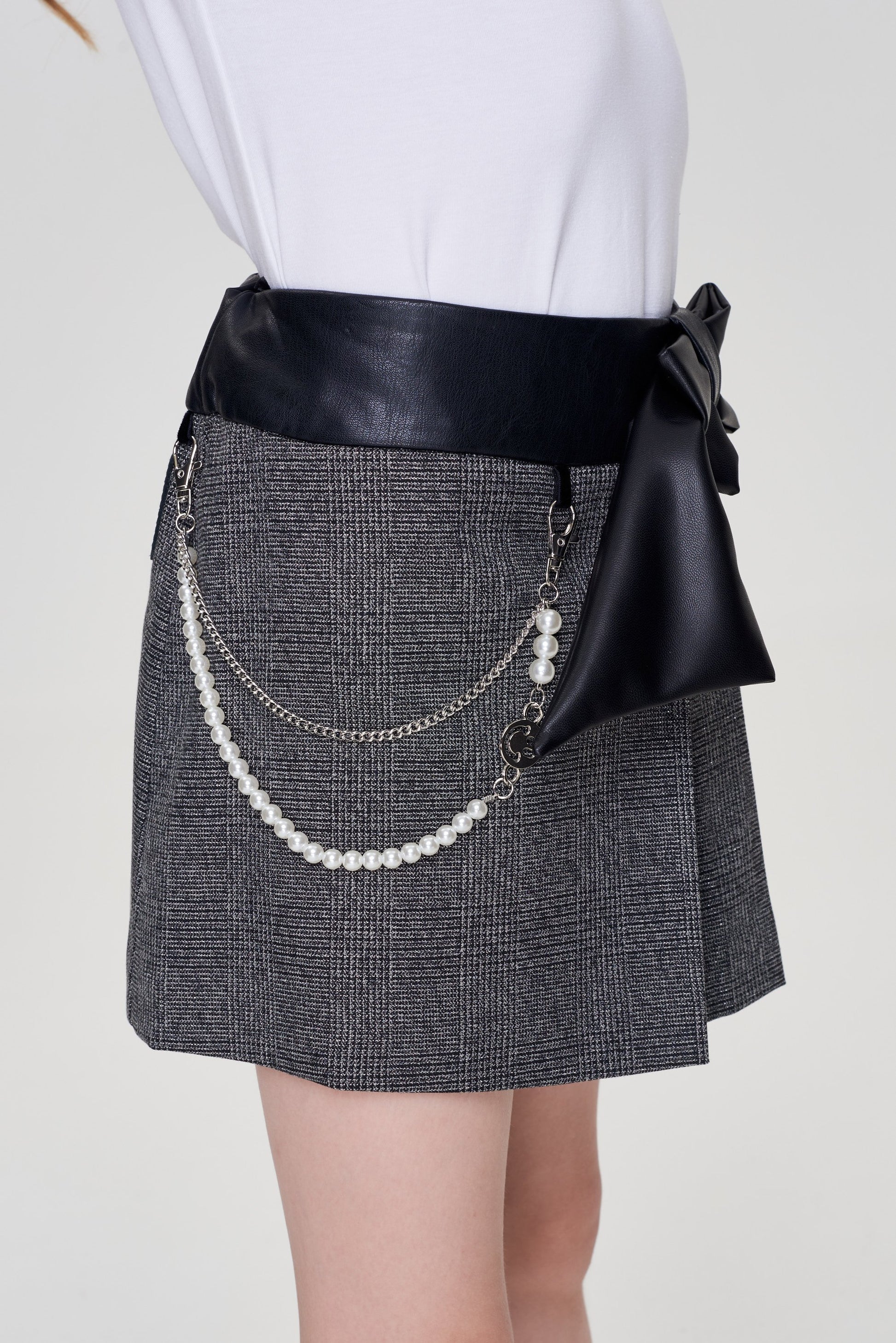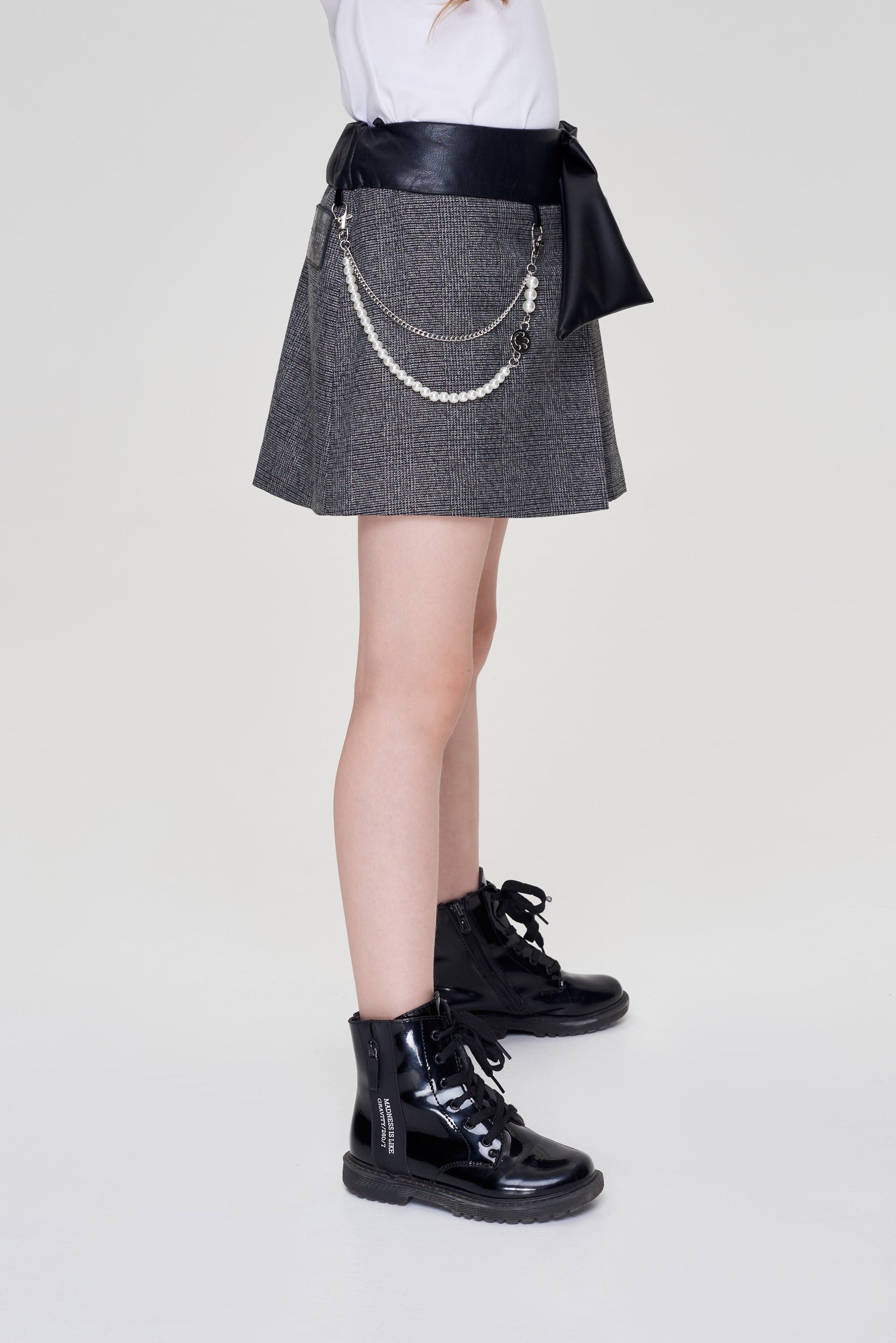 Mini-skirt for a girl is made of high-quality blended fabric that does not require special care. Even the most active child will keep a neat look in it. The print in a small check and folds on the side form the basis of fashionable design. A wide belt with a leather texture highlights the waist. The bow on the belt and the design in the form of two chains add a special charm to the design. The skirt is harmoniously combined with any top, ideal for the role of a school uniform.