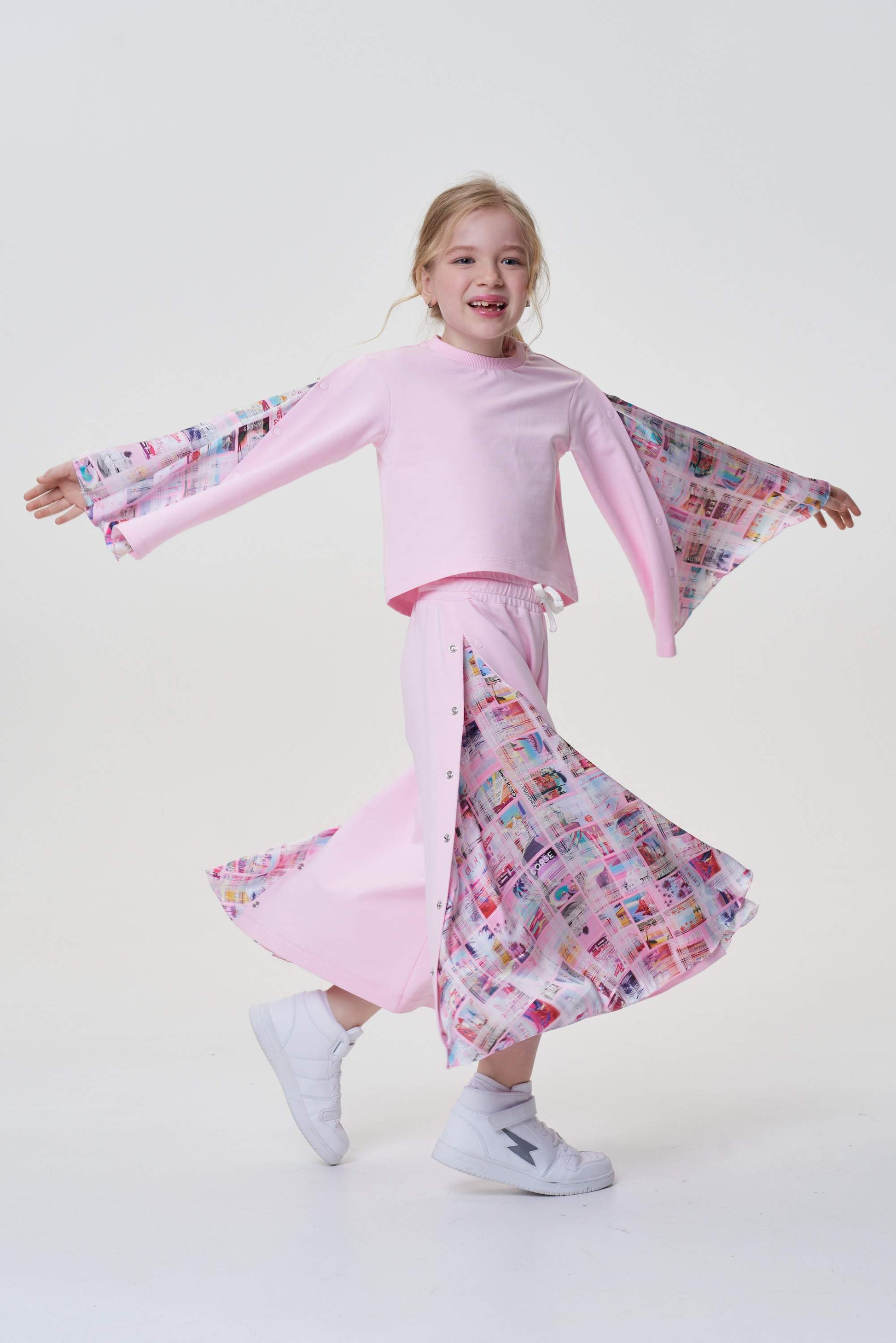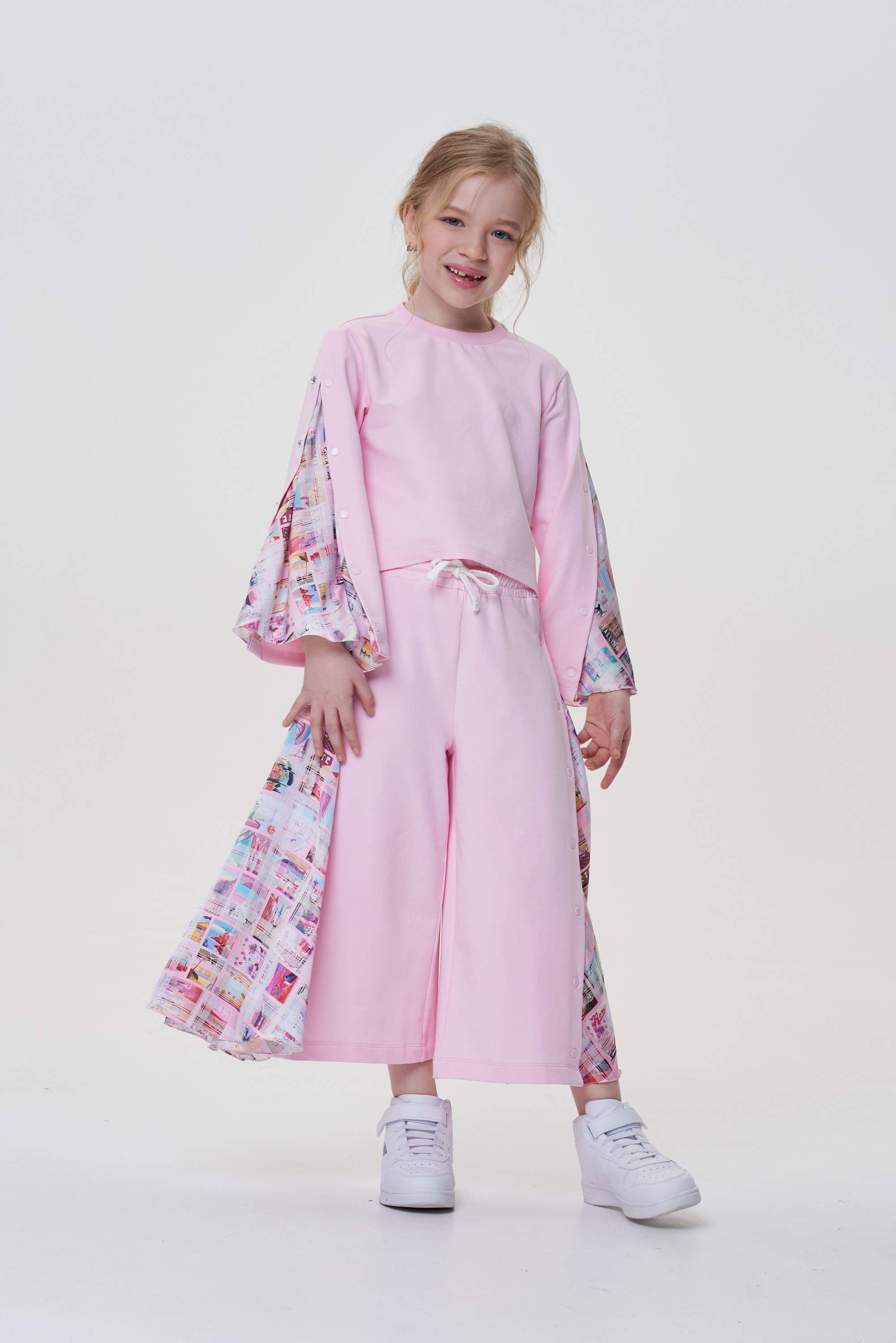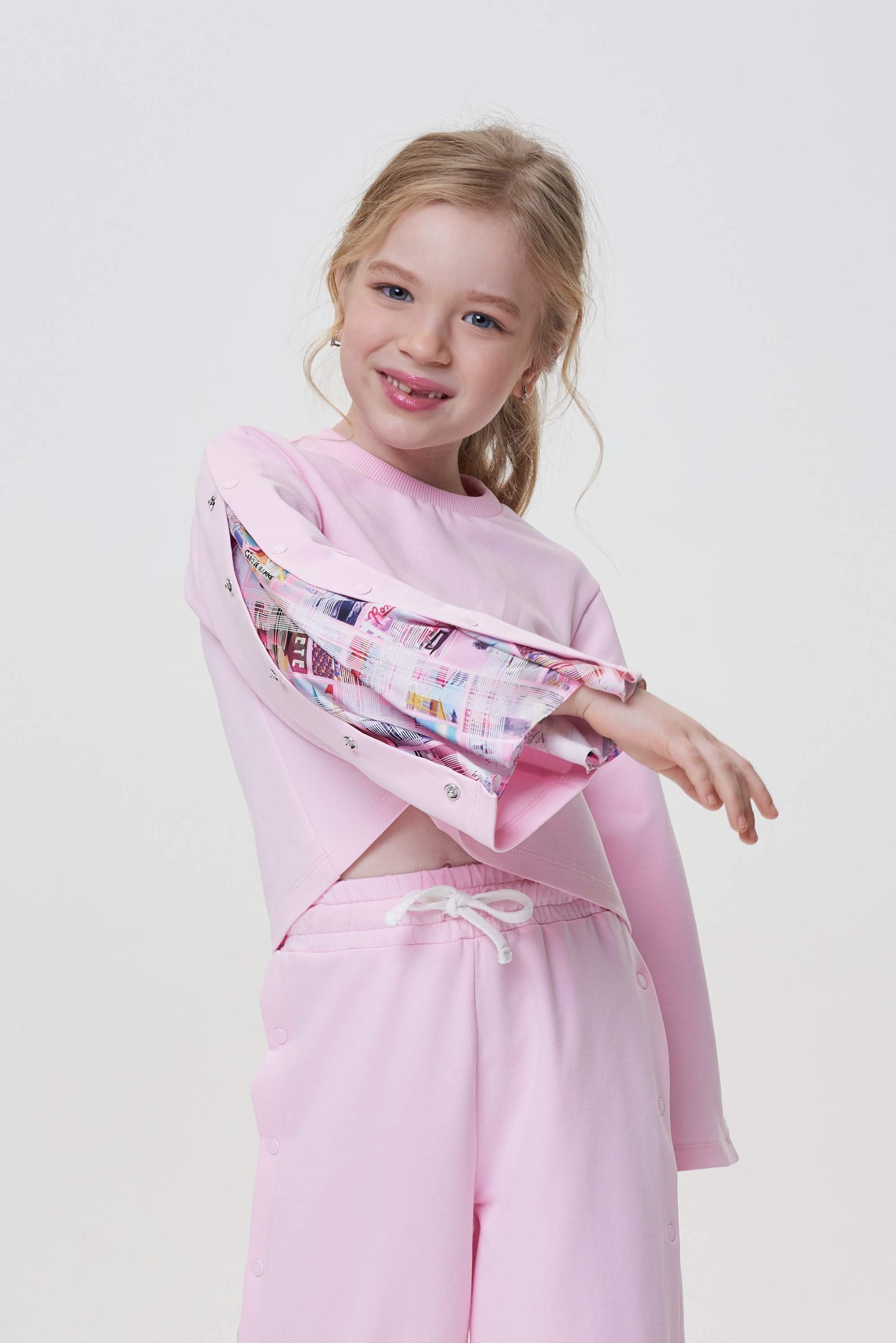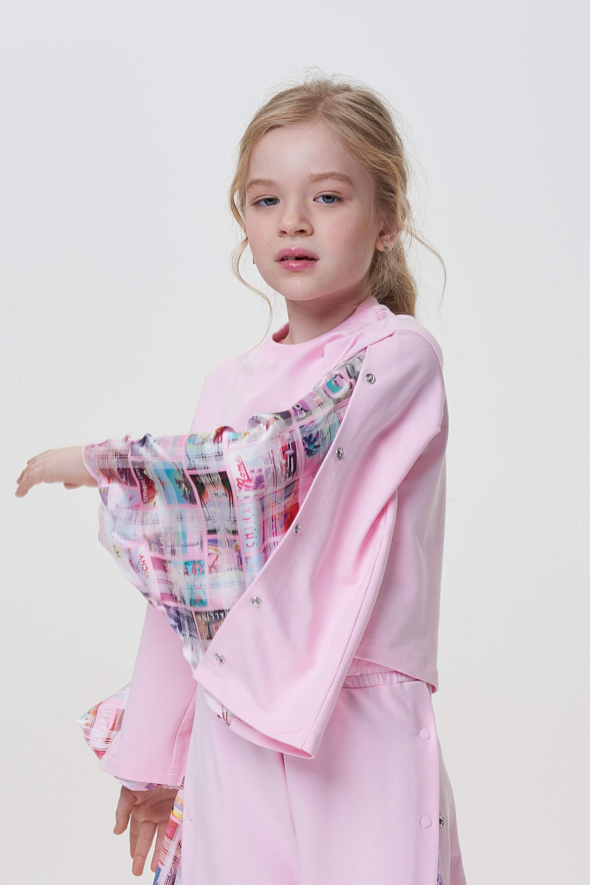 A pink jumper of an A-shaped silhouette for a girl combines an original cut with exquisite laconic finishing. A model with a round neckline and a figure line of the bottom is made of soft cotton footer. Wide stacking sleeves on a narrow cuff. The left sleeve along the entire length is decorated with imitation of the buttons. The right sleeve is flared up due to a fantasy insert of light fabric with a multi -colour abstract pattern.