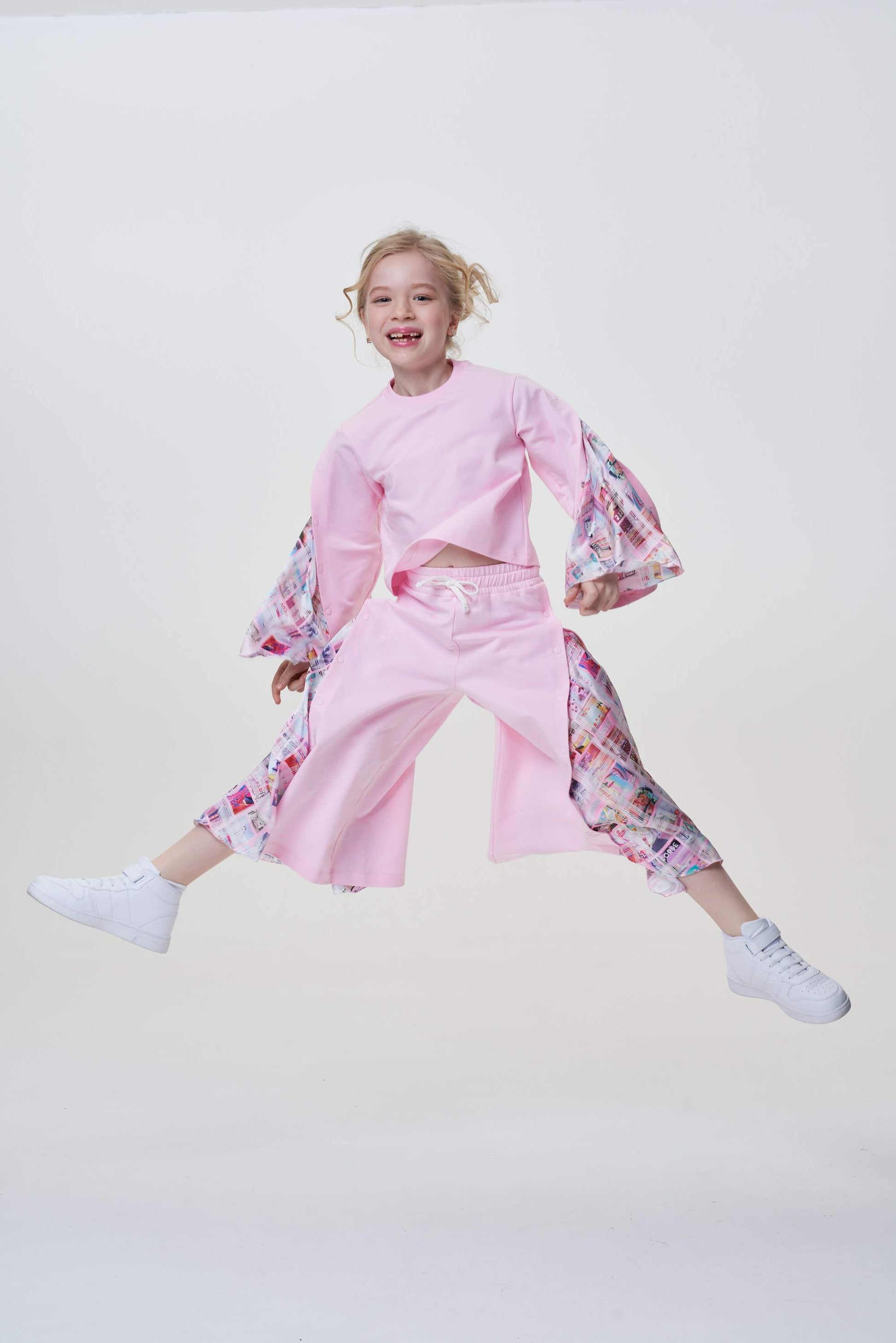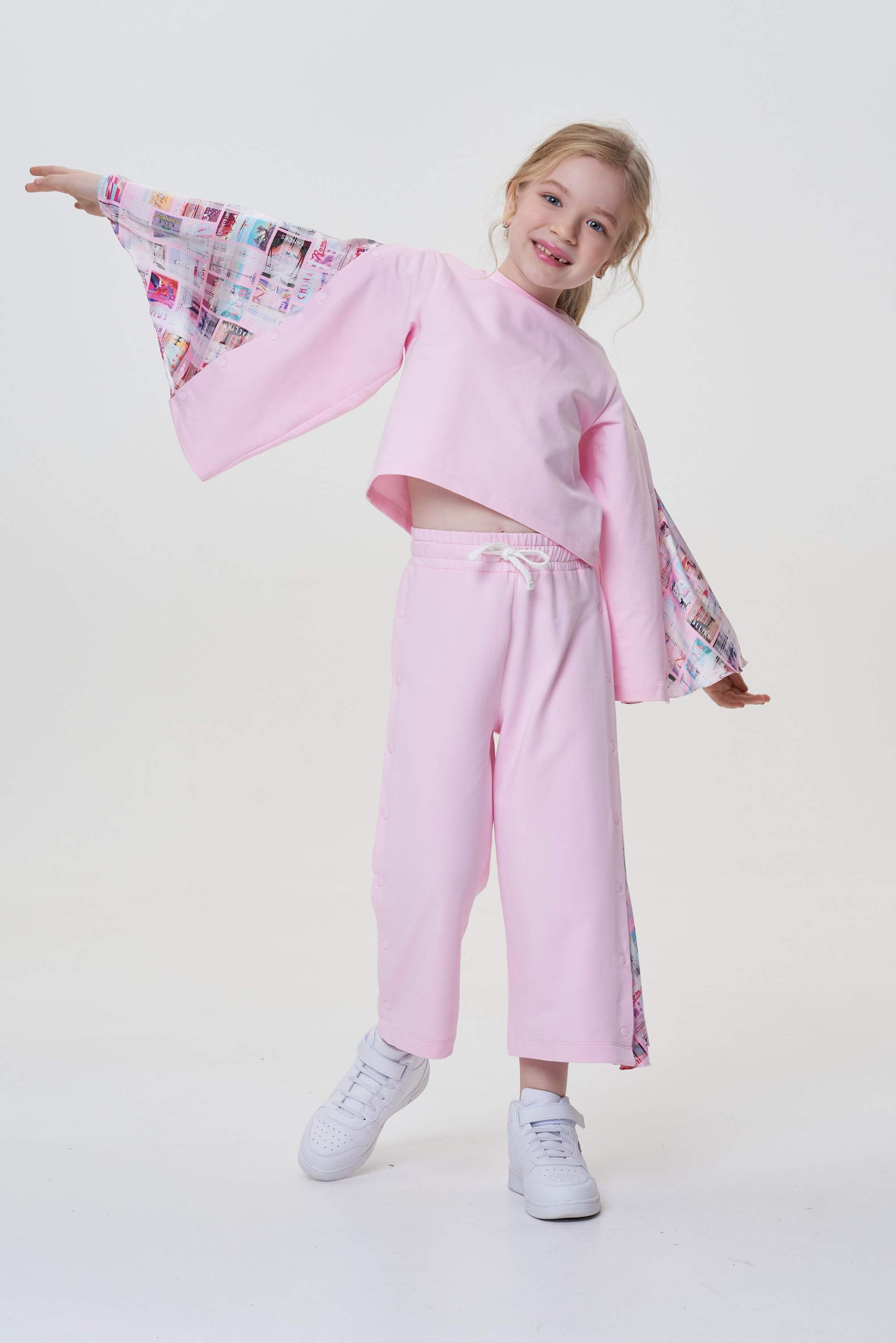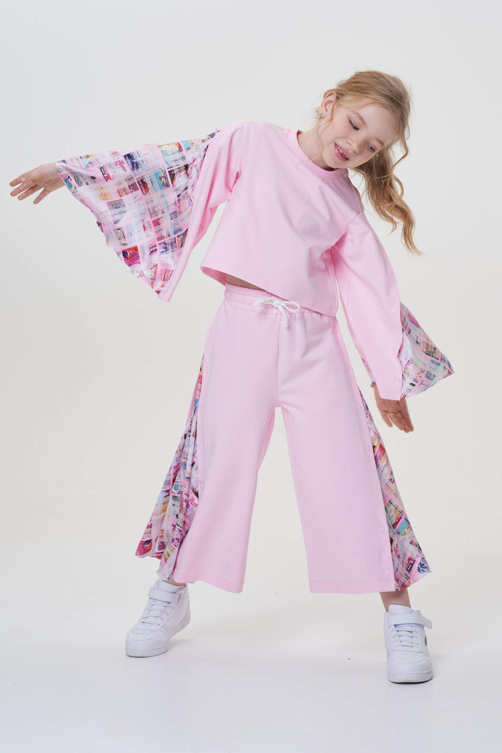 A pink jumper of an A-shaped silhouette for a girl combines an original cut with exquisite laconic finishing. A model with a round neckline and a figure line of the bottom is made of soft cotton footer. Wide stacking sleeves on a narrow cuff. The left sleeve along the entire length is decorated with imitation of the buttons. The right sleeve is flared up due to a fantasy insert of light fabric with a multi -colour abstract pattern.