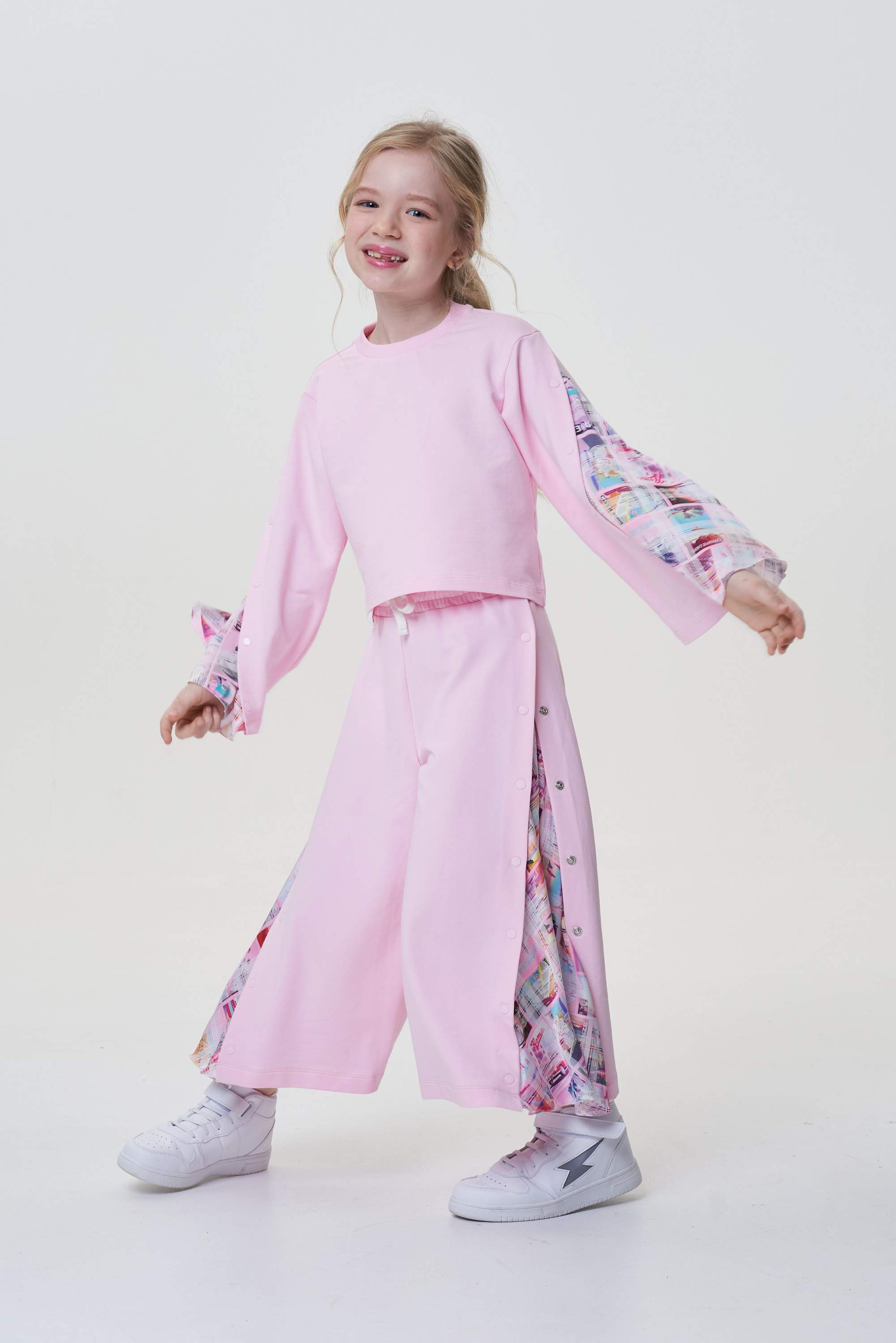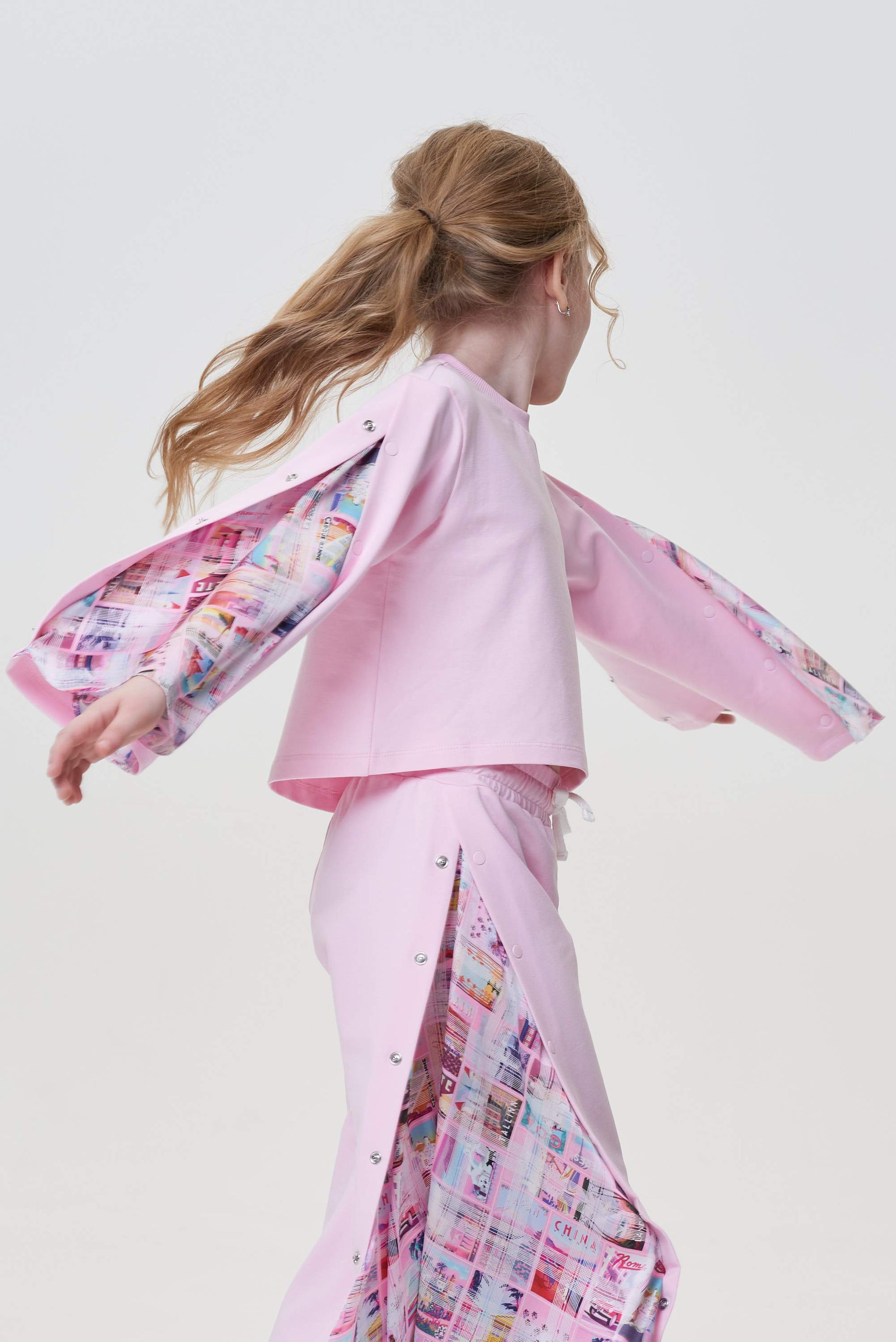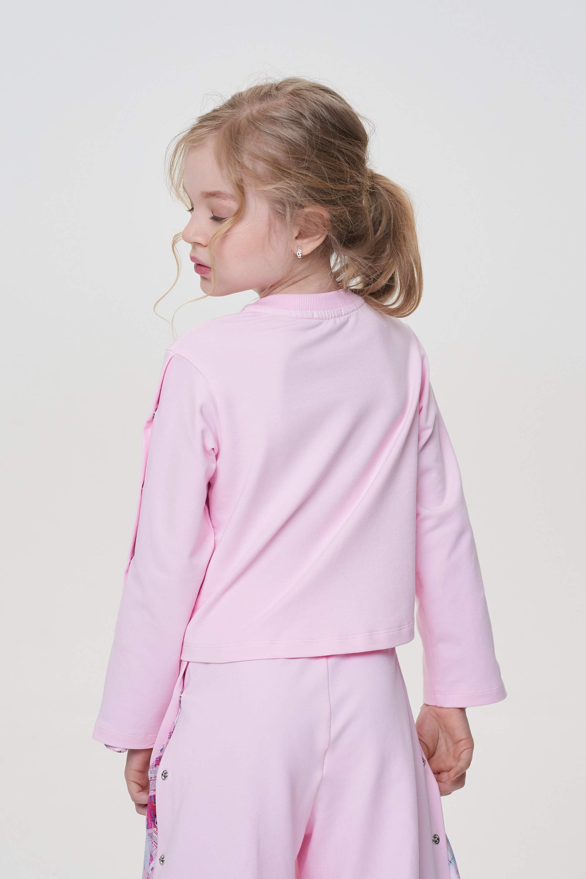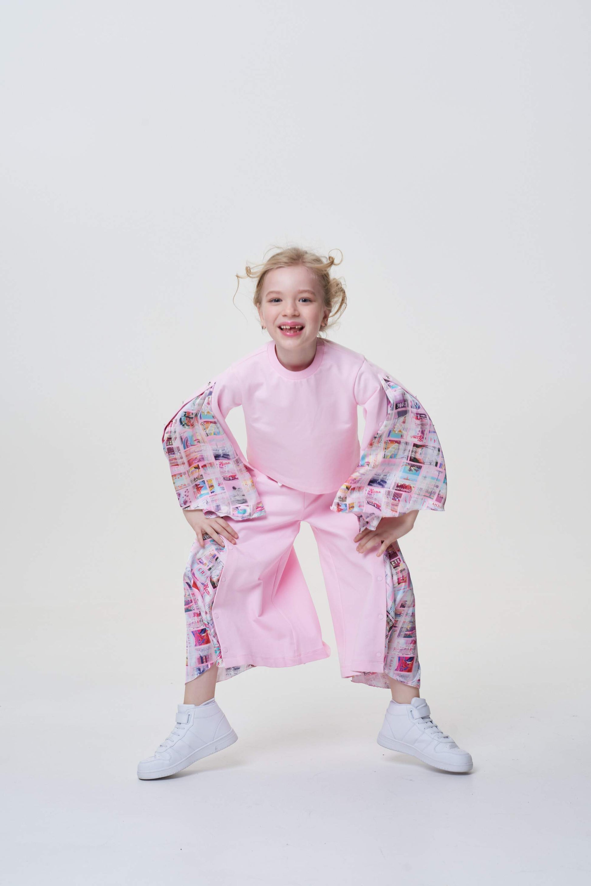 A pink jumper of an A-shaped silhouette for a girl combines an original cut with exquisite laconic finishing. A model with a round neckline and a figure line of the bottom is made of soft cotton footer. Wide stacking sleeves on a narrow cuff. The left sleeve along the entire length is decorated with imitation of the buttons. The right sleeve is flared up due to a fantasy insert of light fabric with a multi -colour abstract pattern.