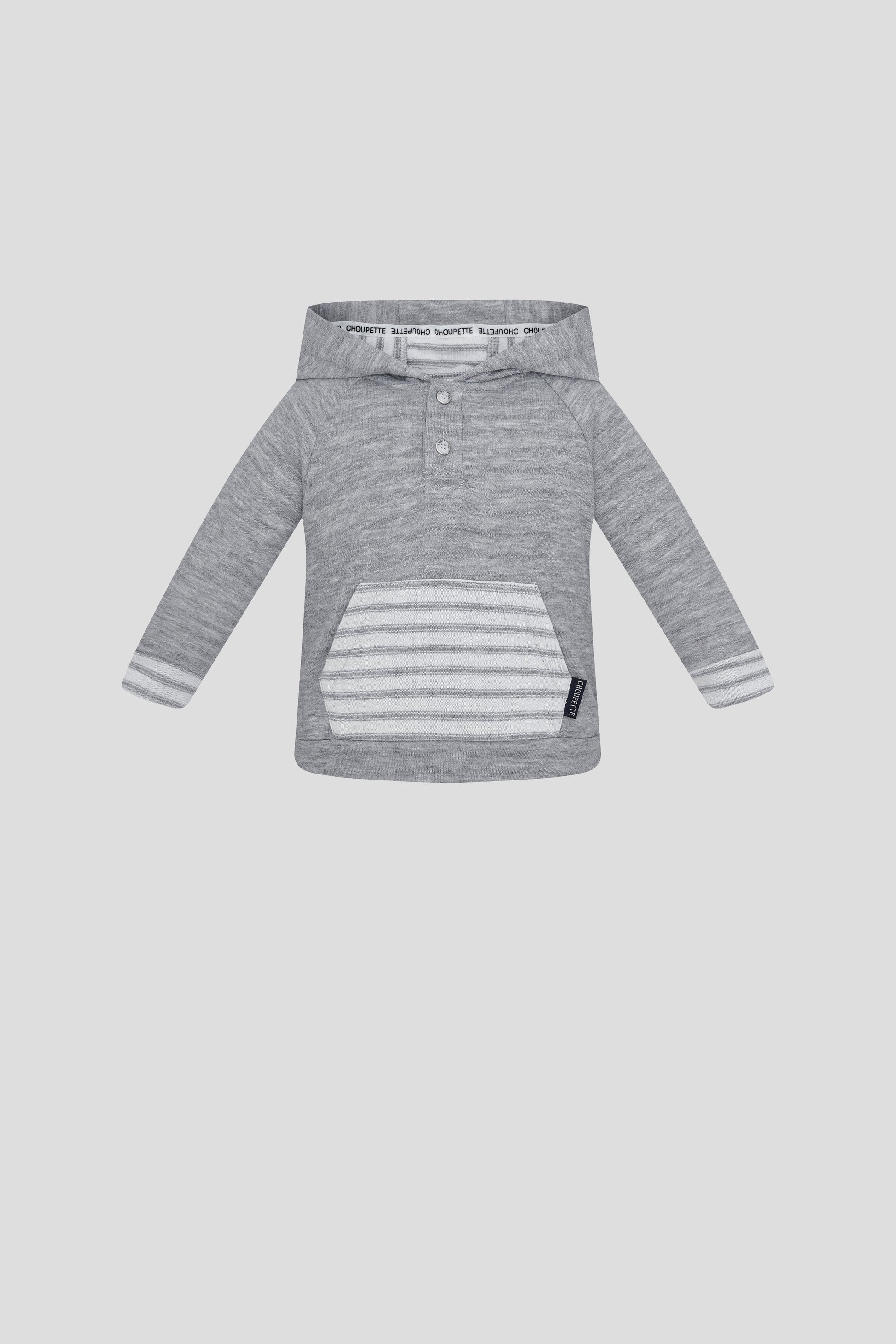 The upcoming season's fashion is truly remarkable. Another interesting trend has emerged - minimalist cuts with minimal decor. But striking accents are still needed for self-expression! This stylish long-sleeve shirt for boys is made from elegant gray cotton jersey. The highlight of this model with a hood and a kangaroo pocket is its creative designer decor. It's a perfect outfit for active young fashion enthusiasts who find it hard to sit still.