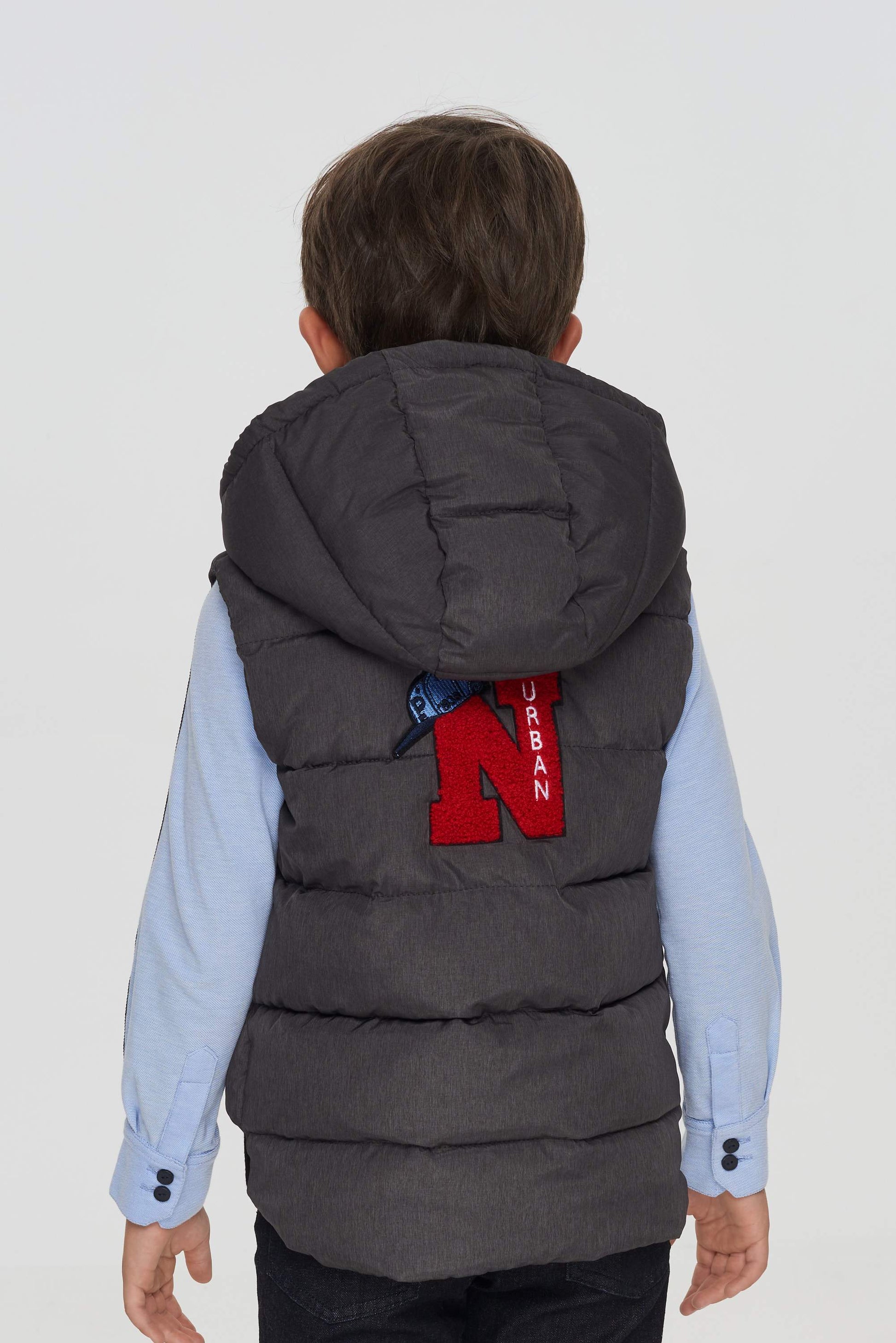 The vest is quilted with a hood in a gray melange colour. Warm vest for a boy is available in size from 2 to 12 years.