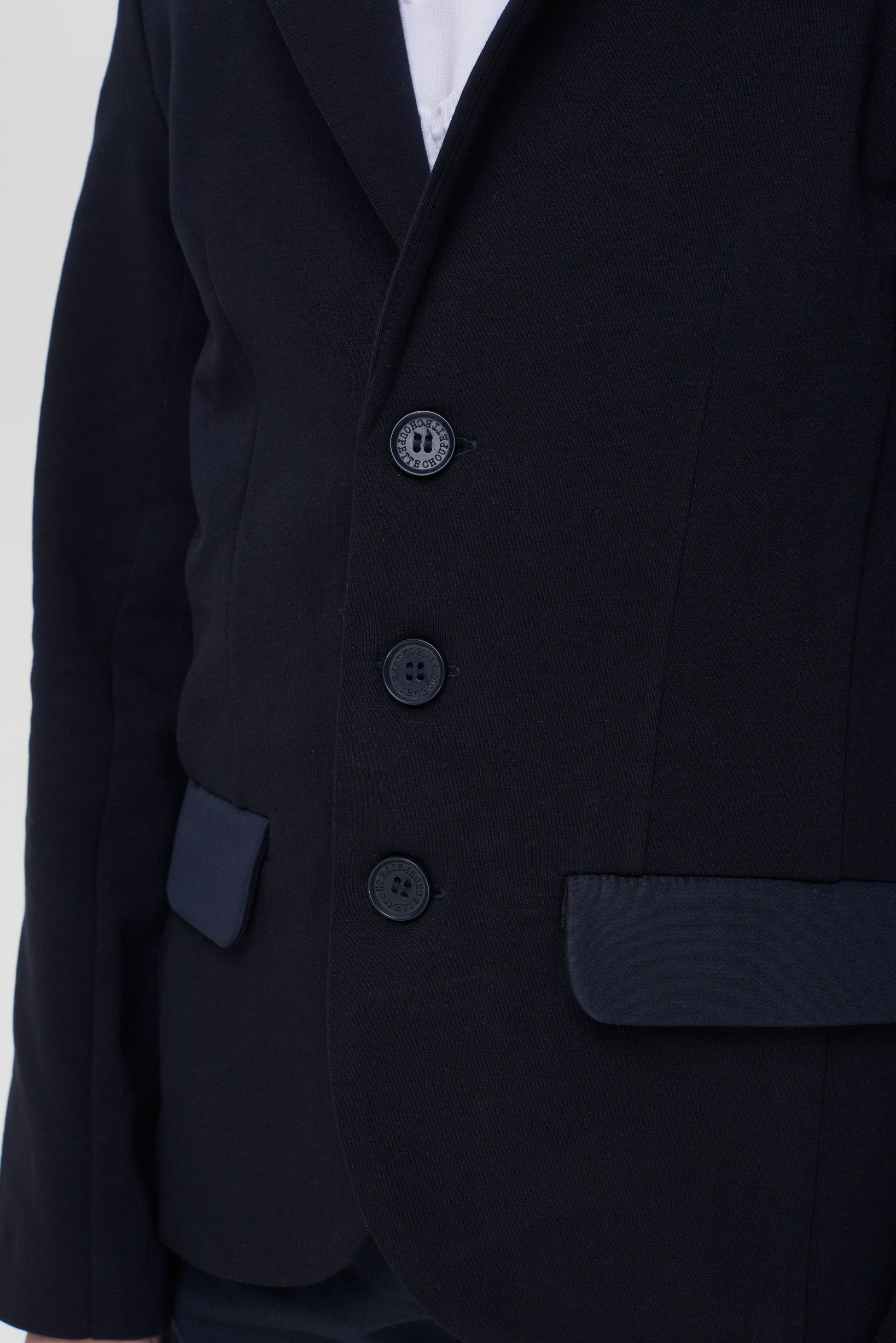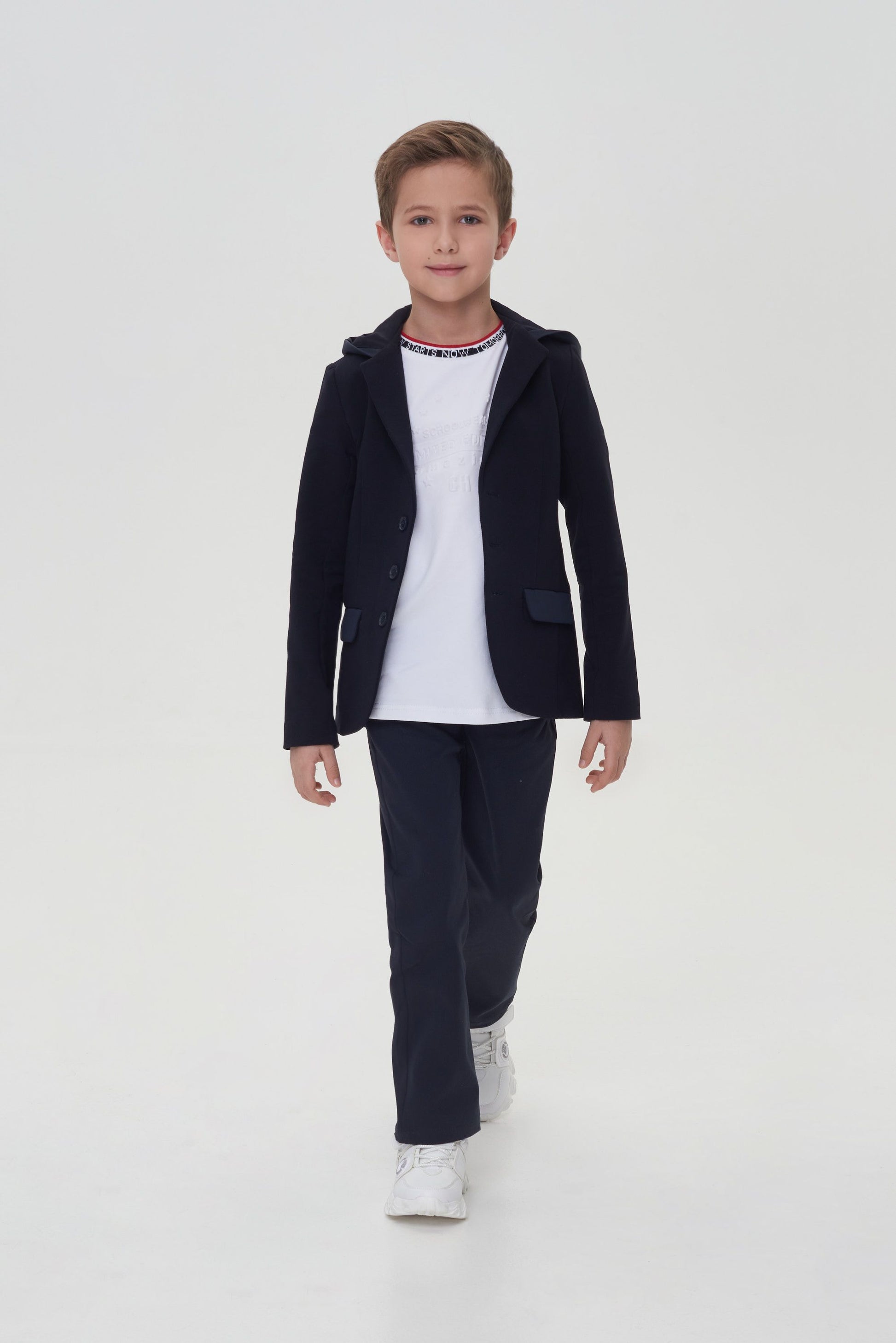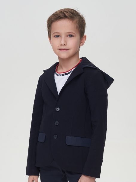 A fashionable jacket made of soft fleece will stylishly complement the look of a child. The model is made in a blue shade, fastens with buttons. A neat turn-down collar smoothly transitions into a polyester hood that will protect against rain in case of precipitation. The leaflets of the pockets are decorated with the same fabric. The basic blue color allows you to combine the jacket with any bottom, shirts and t-shirts.