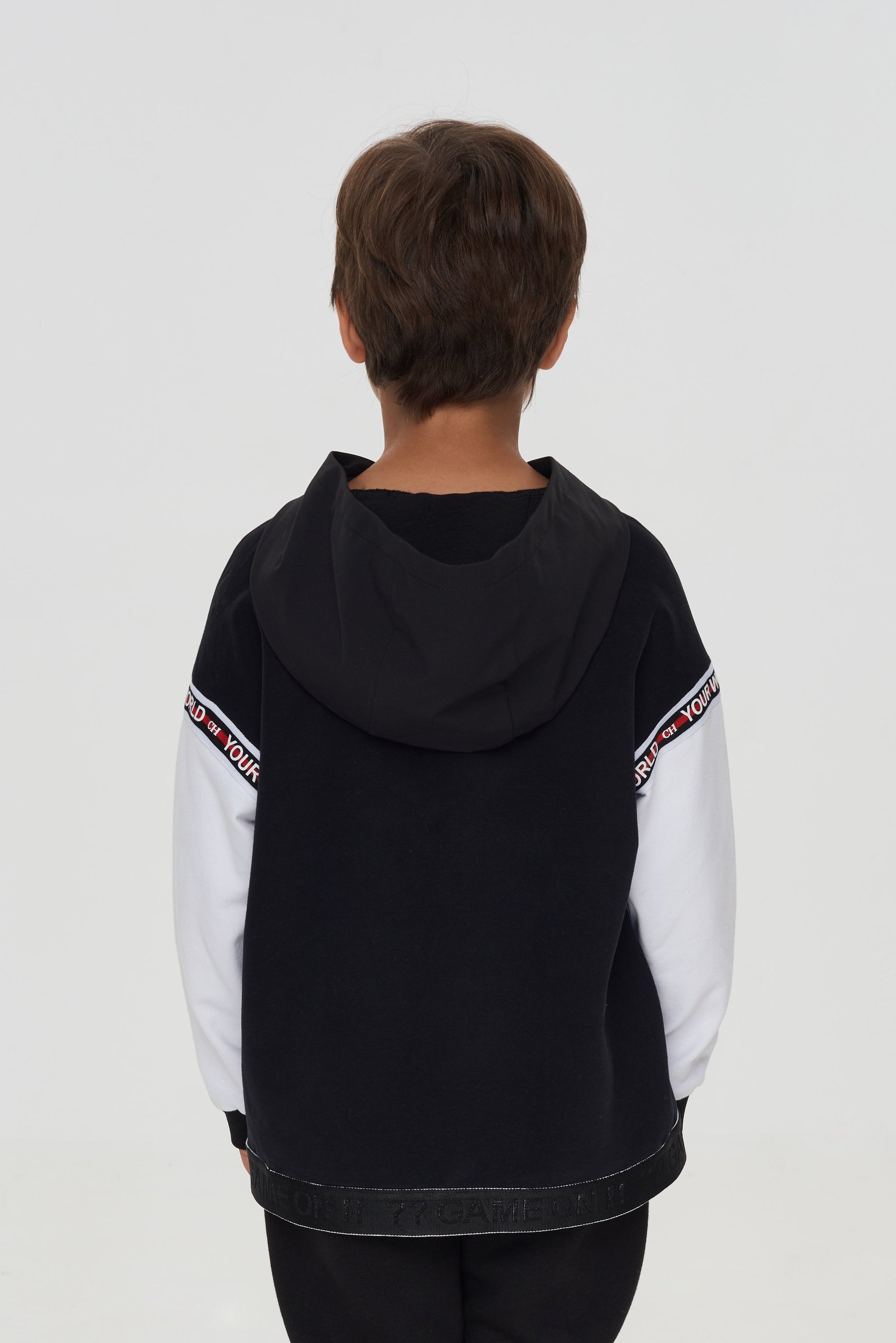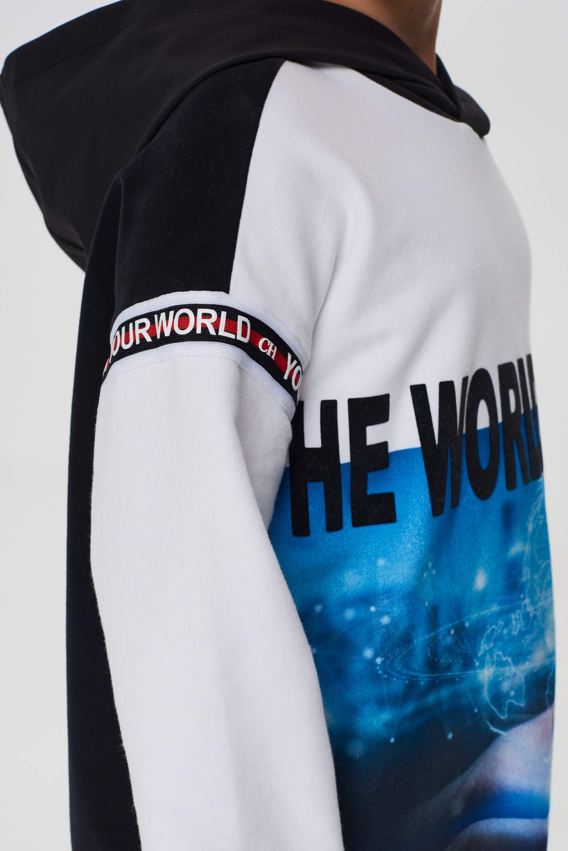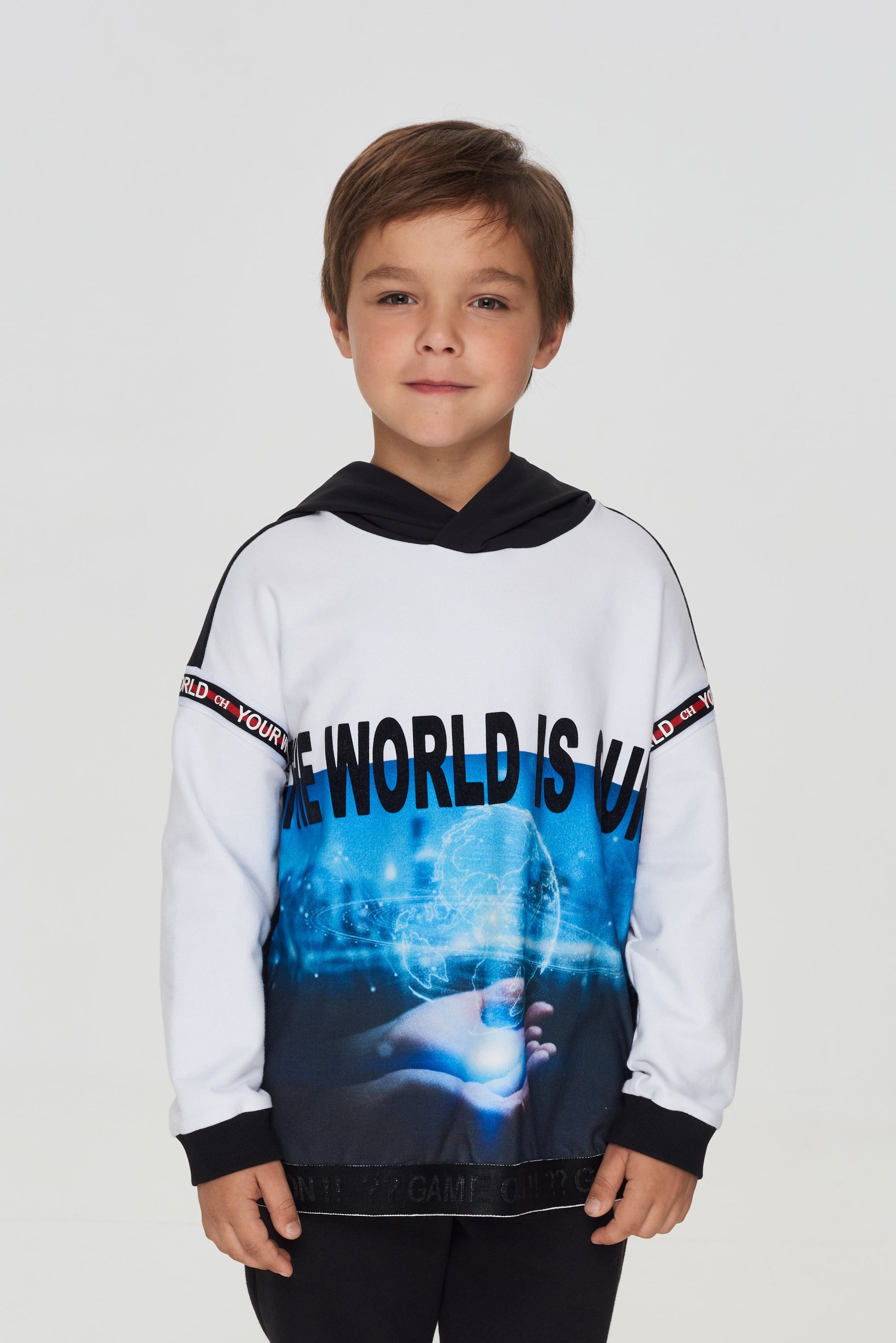 Sweatshirt with a hood for a boy, Style Oversize. Combined option - white / black / blue. Stylish and warm sweatshirt is made of cotton.