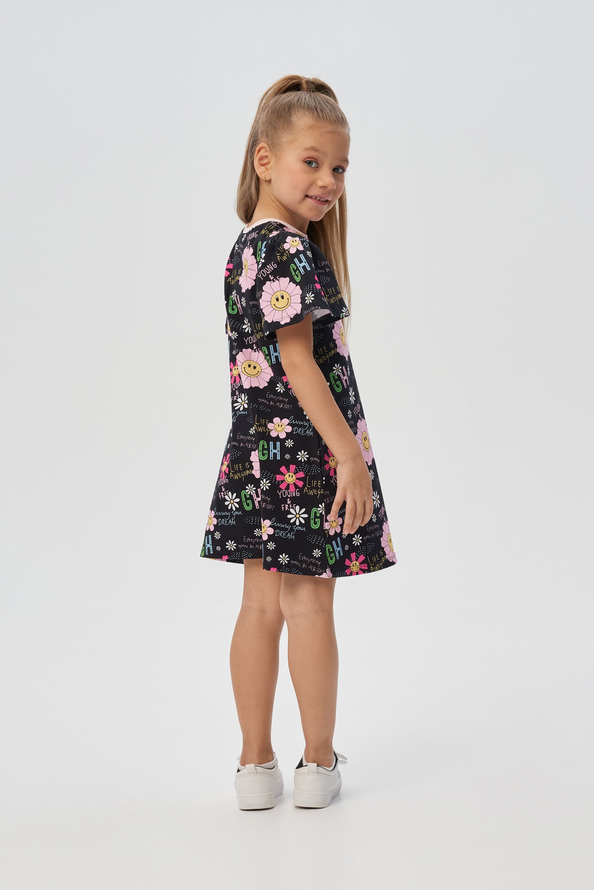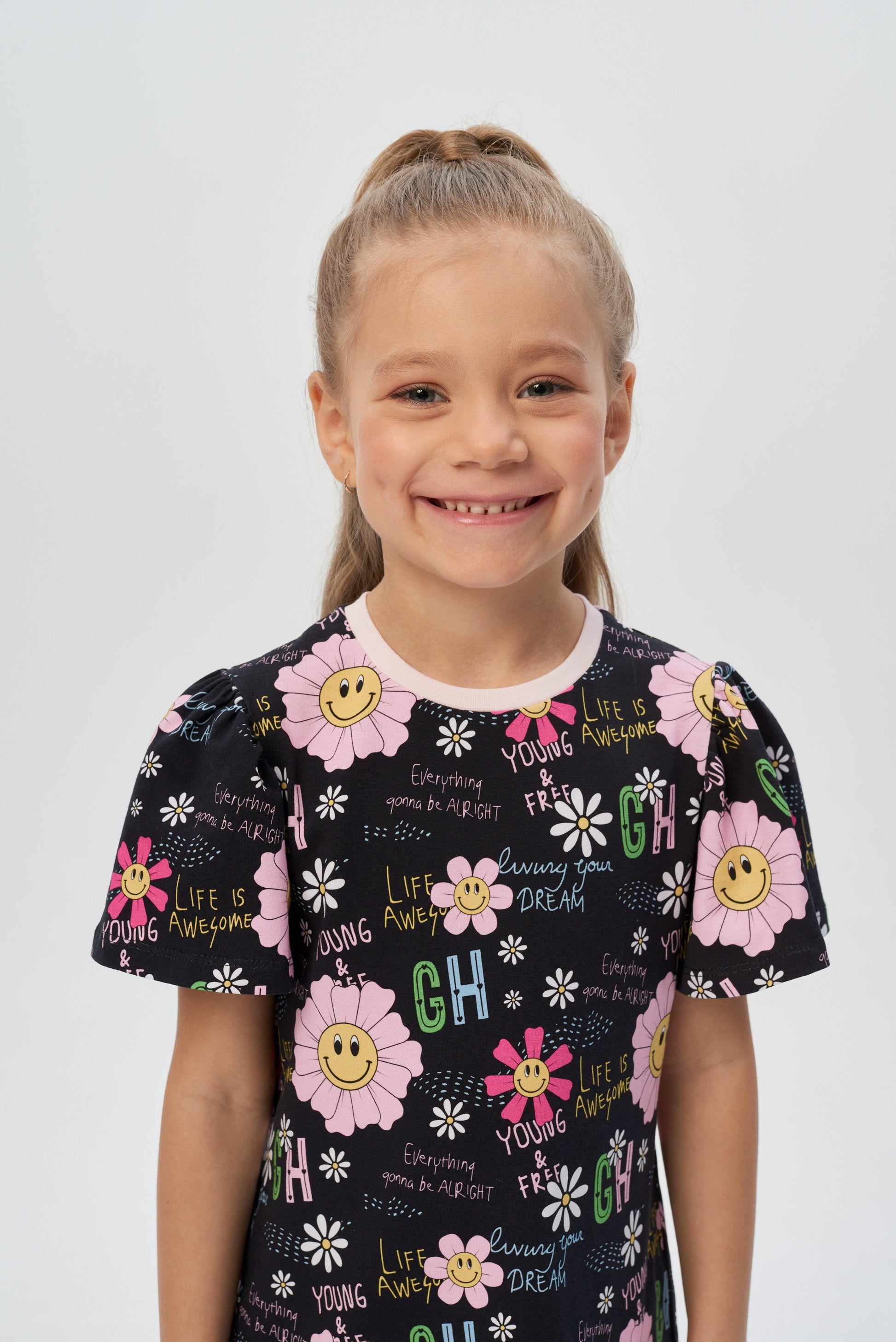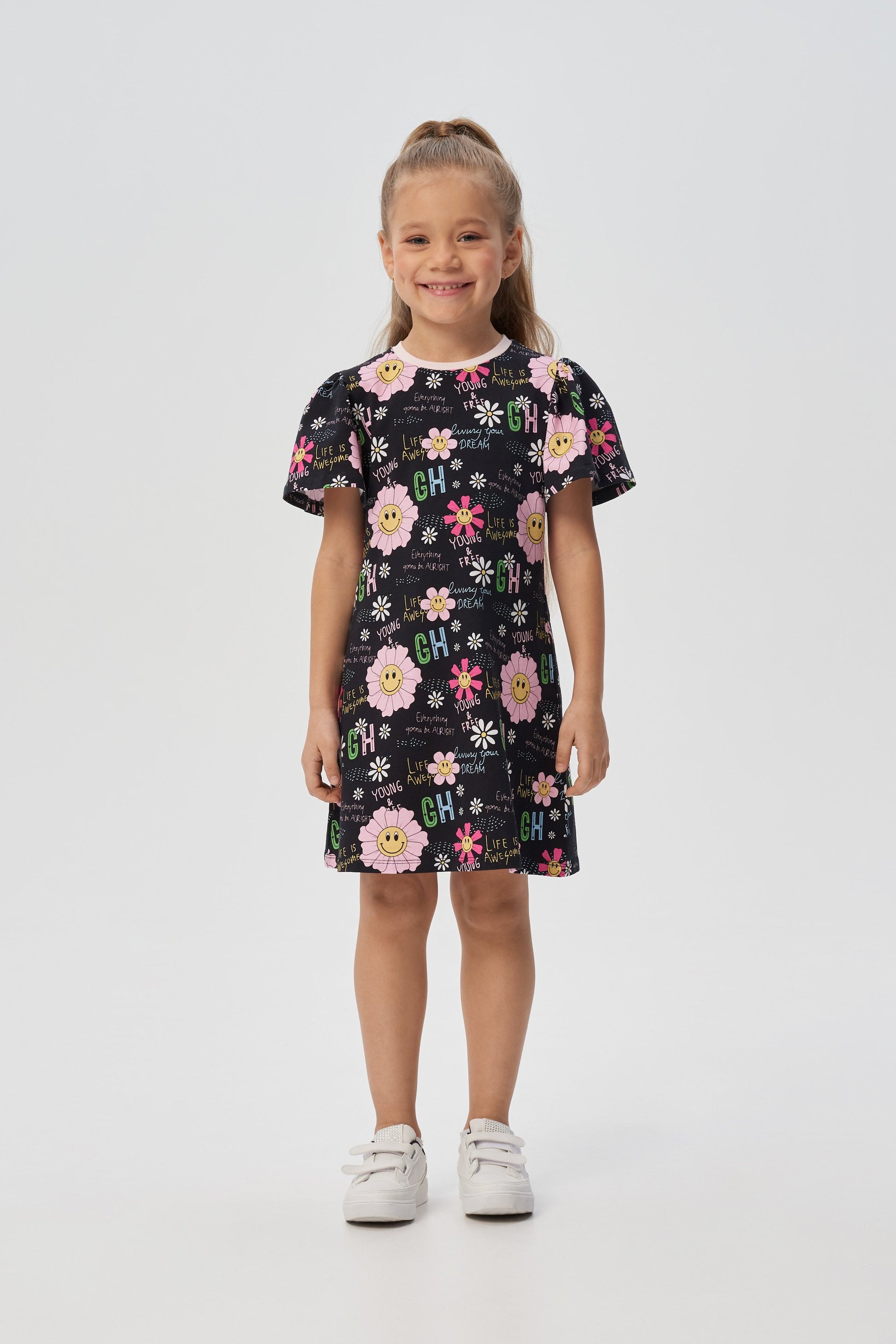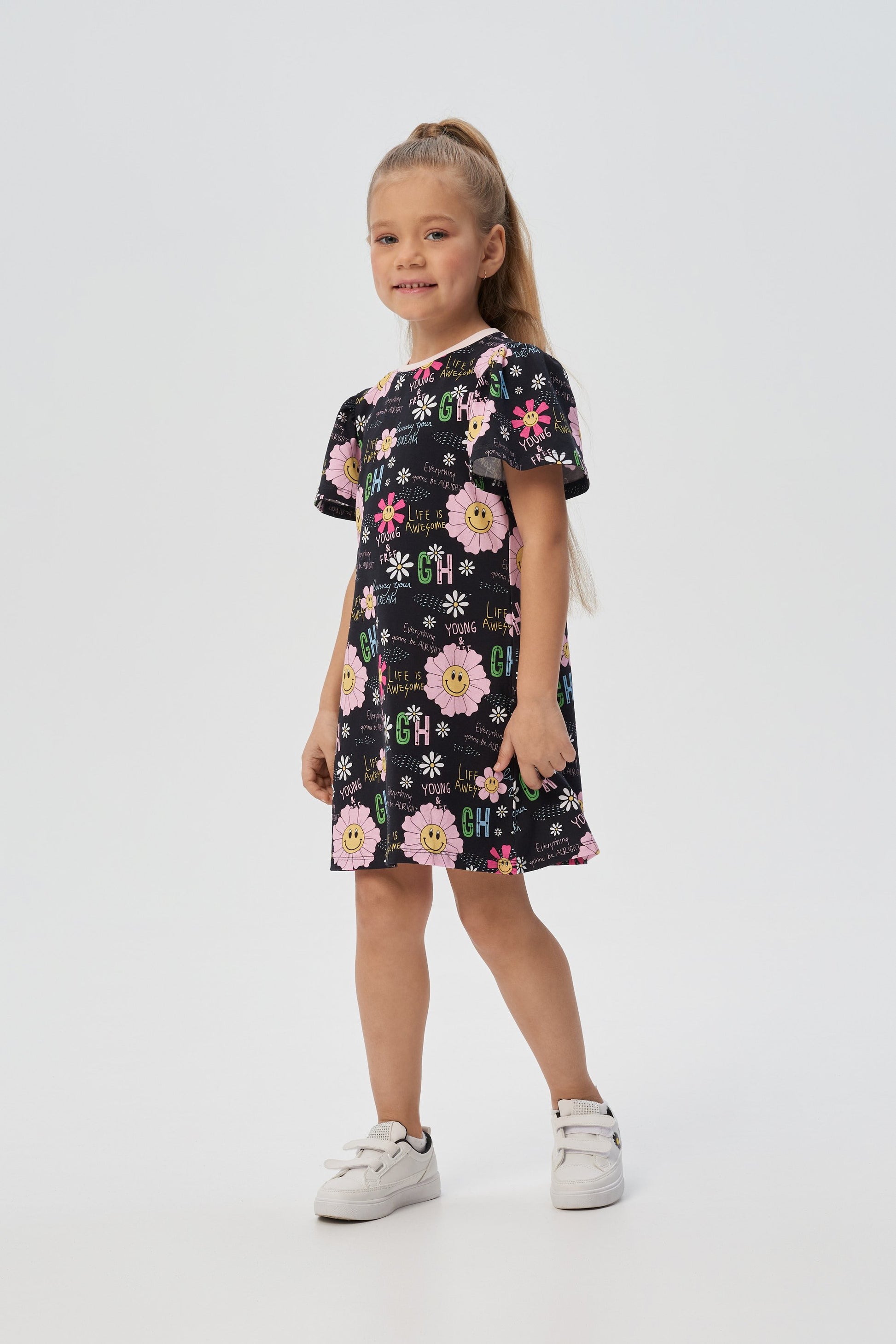 A brand trapping dress with a brands proprietary print will become a favorite girls' wardrobe item. Why? High -quality natural fabric is responsible for comfort. Soft cotton is pleasant to delicate children's skin and does not cause irritation. Convenient length and shape of the sleeves does not constrain movement. The free silhouette of the dress also gives freedom. A bright print, which has become the main decoration of the design, will appeal to any little fashionista.