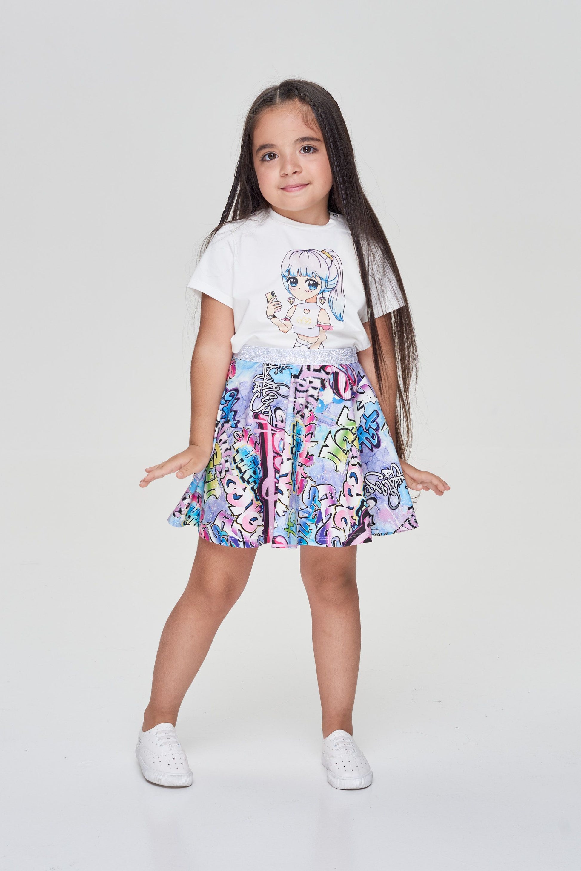 What to wear for a walk on a summer day? Of course, a flared half-sun skirt! The A-silhouette model for girls of the younger age group is made of light cotton knitwear. The material drapes well and forms soft folds. The length of the product is up to the knees. A little fashionista will certainly like a cheerful signature print: multi-colored hip-hop bears on a pink background.