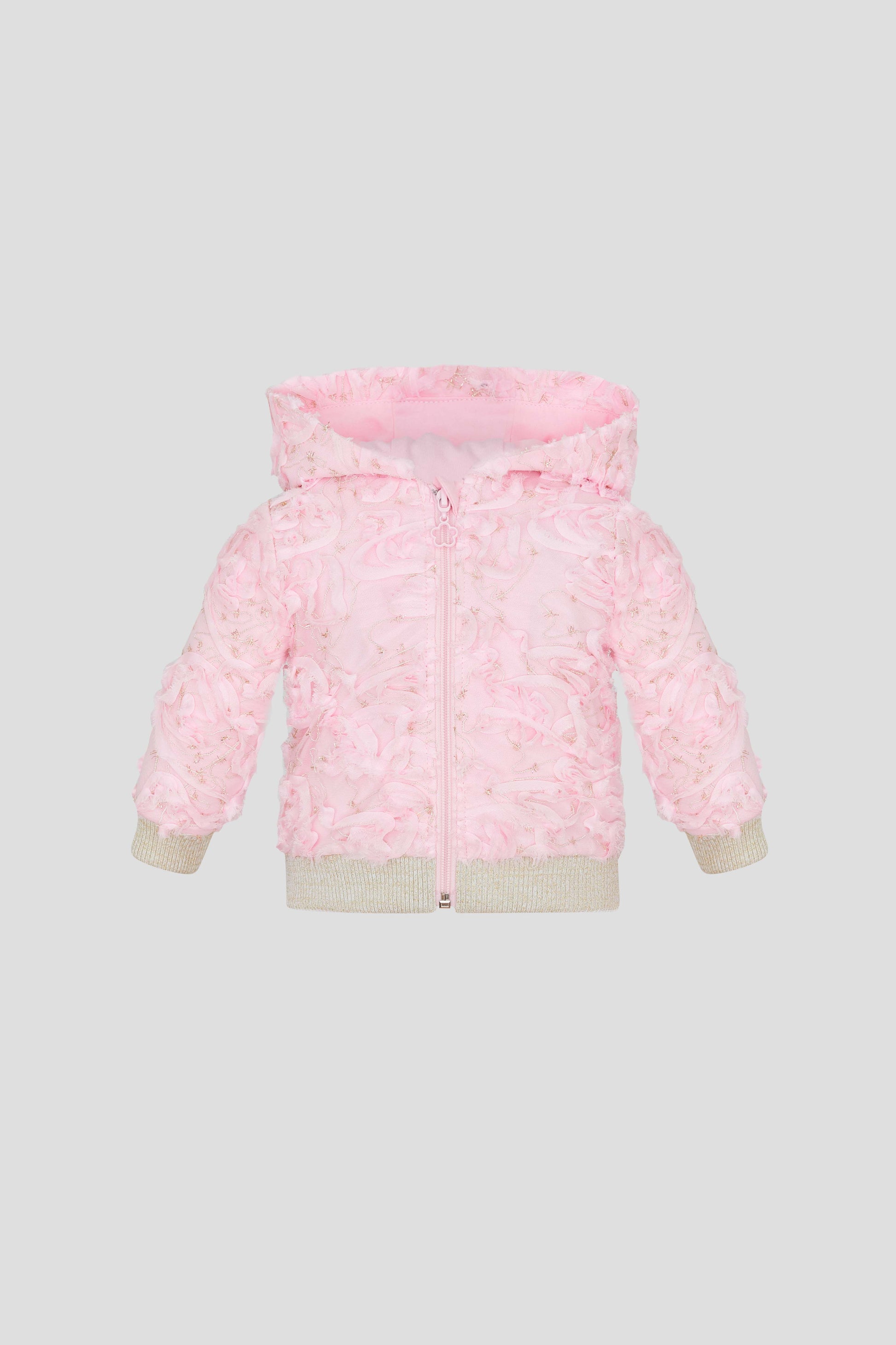 Fashionable and stylish outfit for a little girl. The magnificent bomber is made of designer lace fabric of pink color. At the bottom of the beautiful model with long sleeves is a finish of soft wide elastic. A comfortable zip is decorated with a cute pendant in the form of a heart. The product is absolutely safe to use. The lining is made of natural cotton, that is, it will not irritate the delicate baby skin.