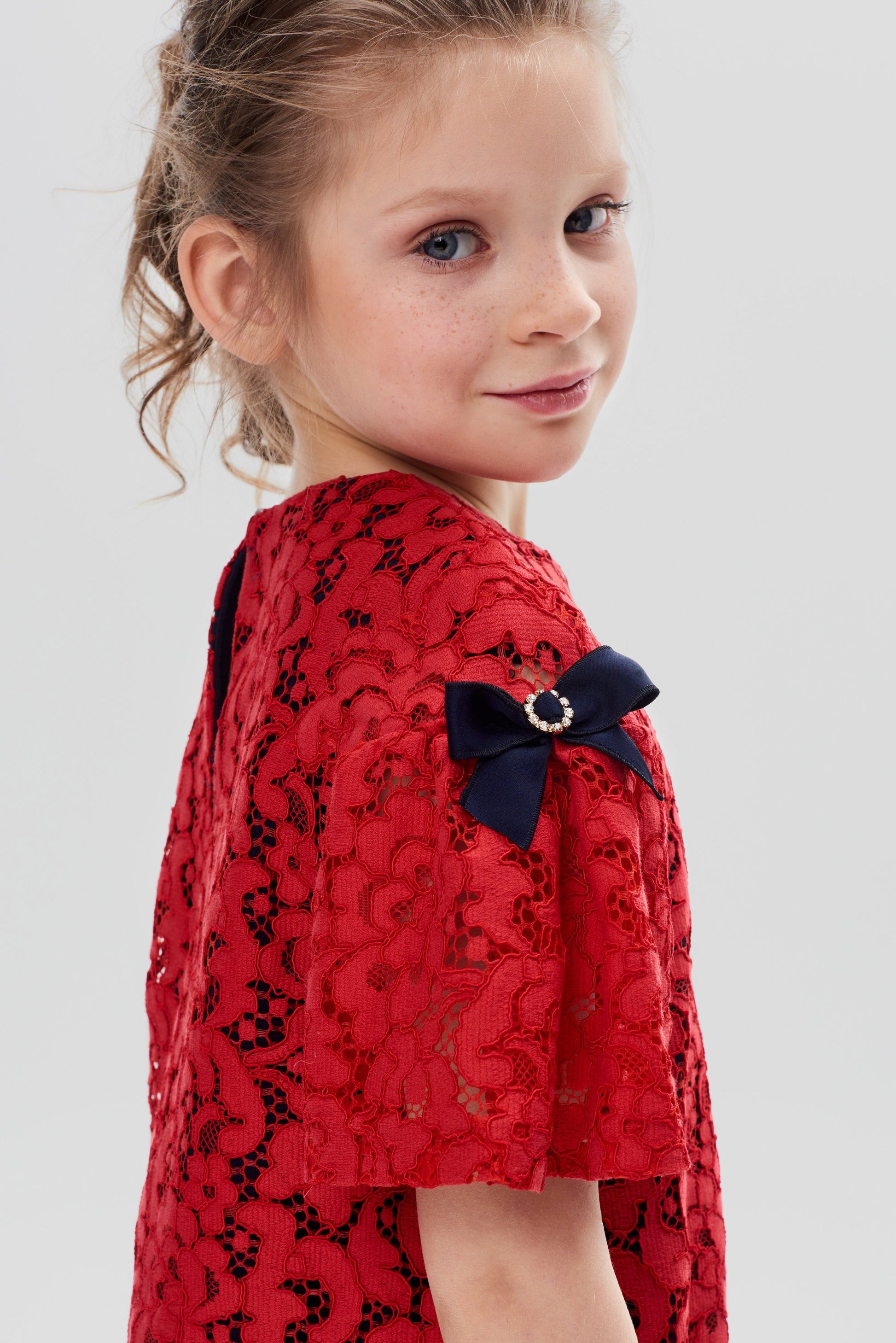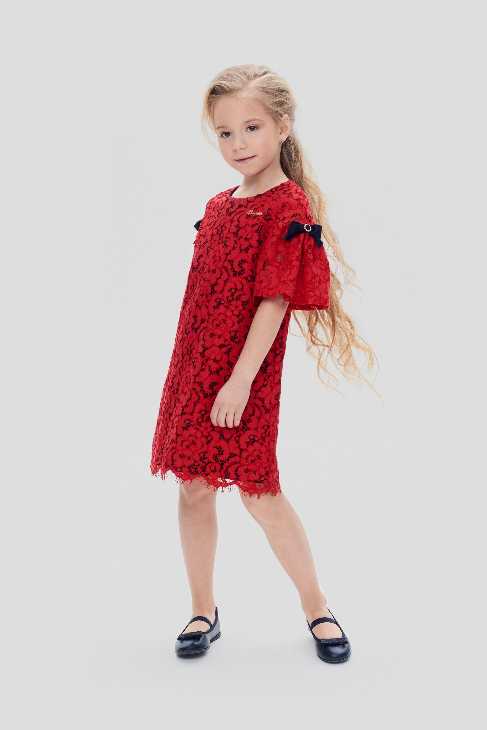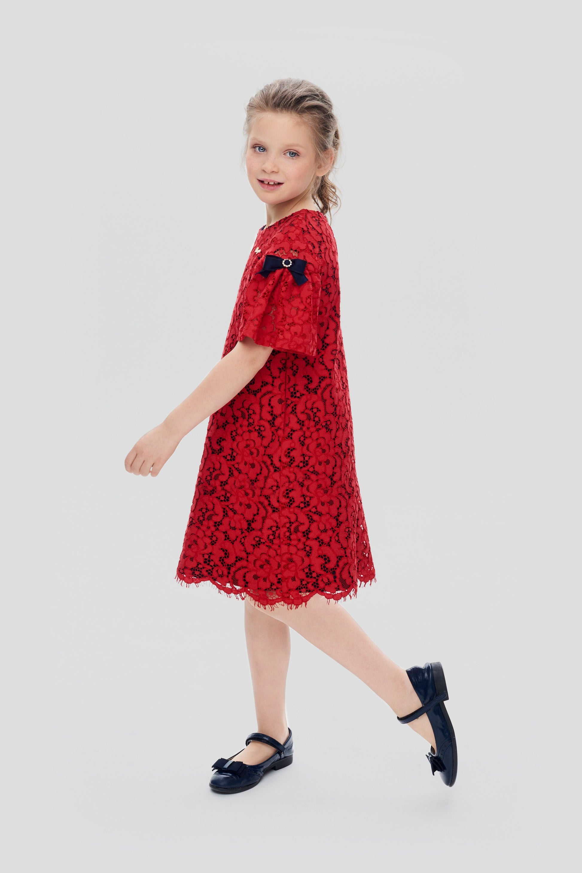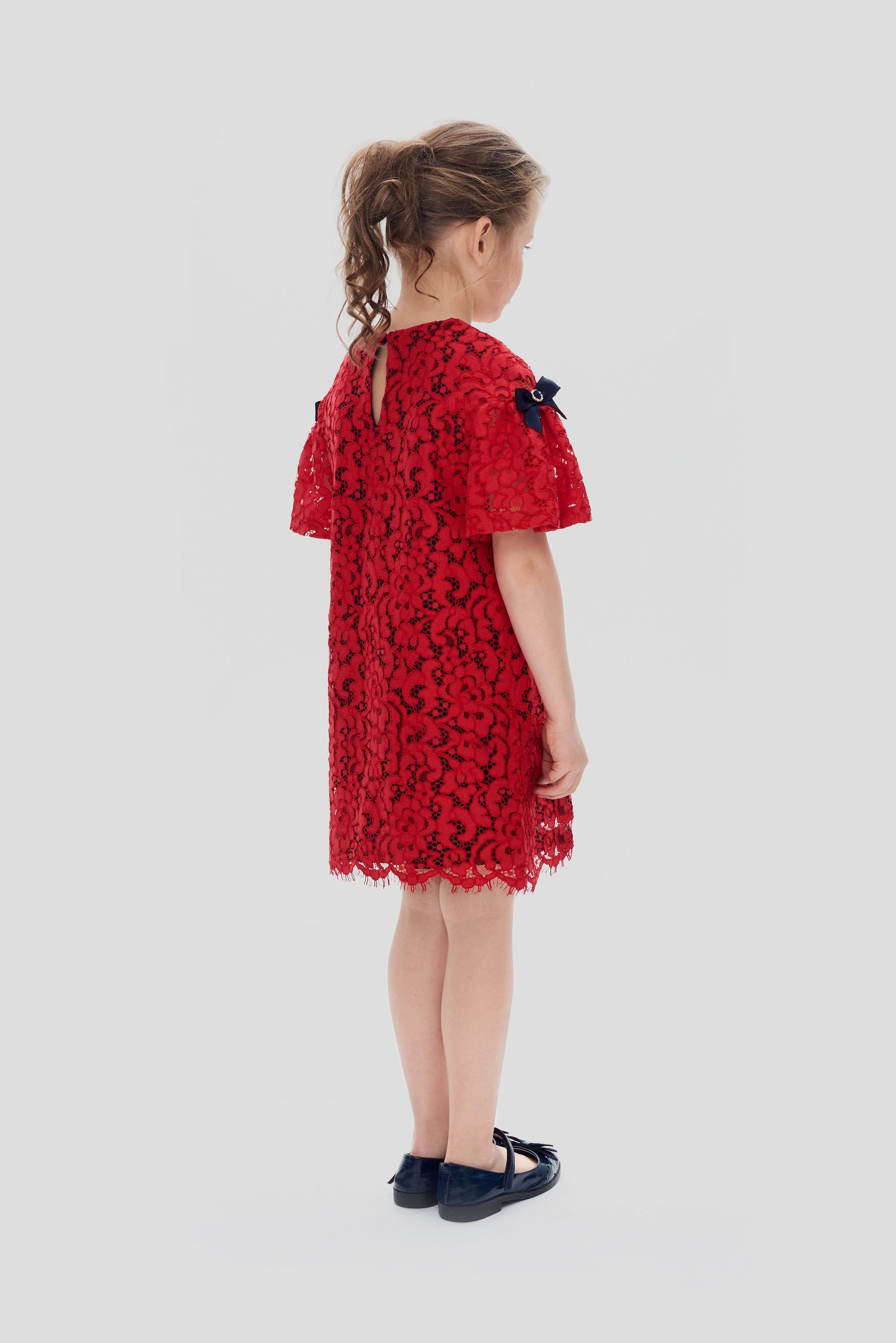 Gorgeous lace dress with cotton lining for girls. Your little one will be the center of attention! A cute model is made of bright red openwork fabric. A dress in the shape of a trapezoid is suitable for fashionistas of any complexion - such a silhouette visually stretches the figure. A stylish dress with designer decor on the shoulders will allow the young princess to shine at children's parties and other festive events.