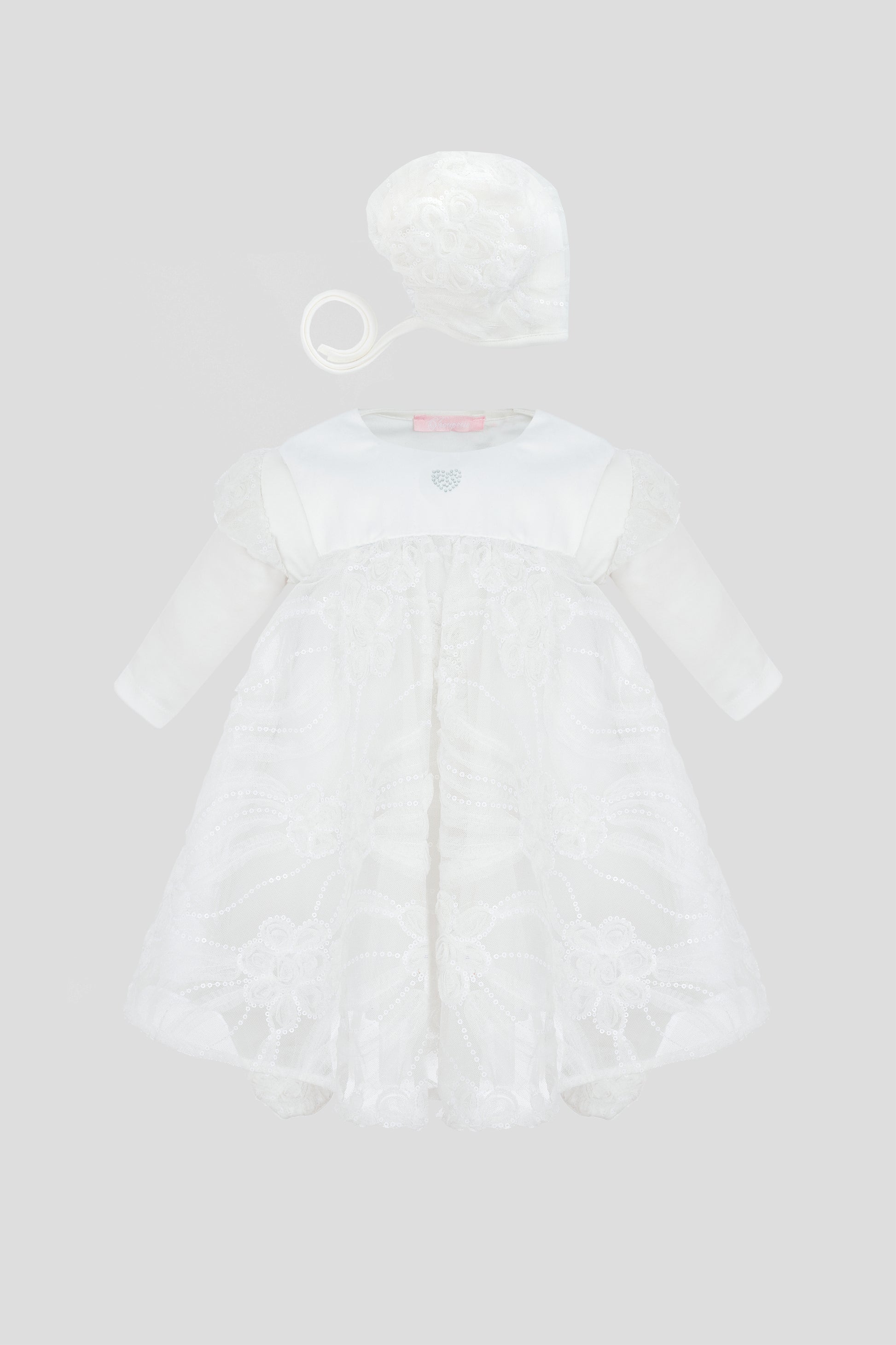 A wonderful outfit for your baby. The stylish cotton set consists of a stylish jumpsuit dress and bonnet. The lace model is made of knitwear, the chest is decorated with a composition of crystals, the headdress is decorated in the same style. A very elegant outfit, the little princess will be the most beautiful at a festive event!