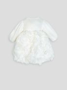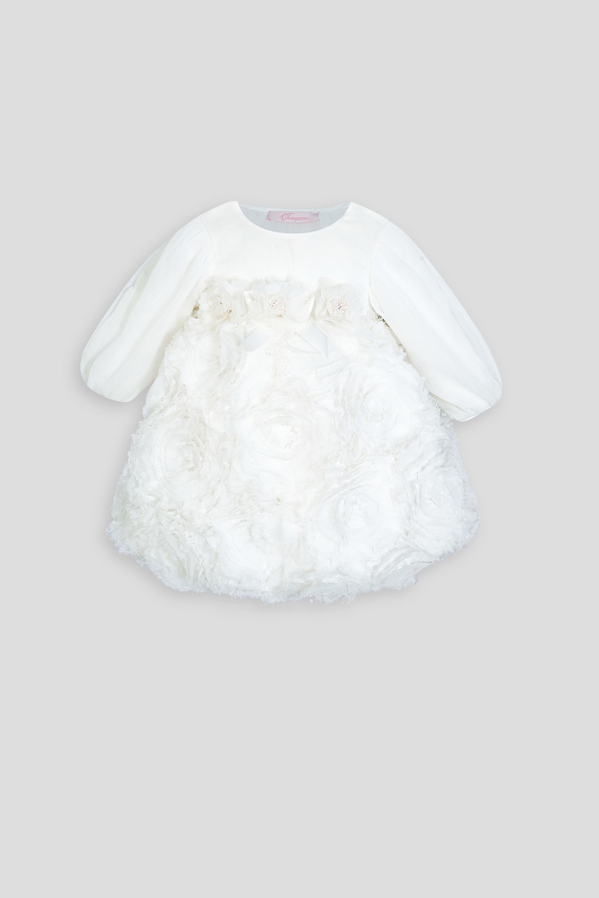 Elegant dress for girls. A lovely model with a voluminous lace skirt will turn your cute baby into a real fairy-tale princess... The exquisite outfit is made of beautiful and high-quality pearl-white fabric. The lining is made of natural cotton. At the waist there is a spectacular designer decor in the form of large flower buds. A perfect piece of clothing for matinees and other holiday celebrations.
