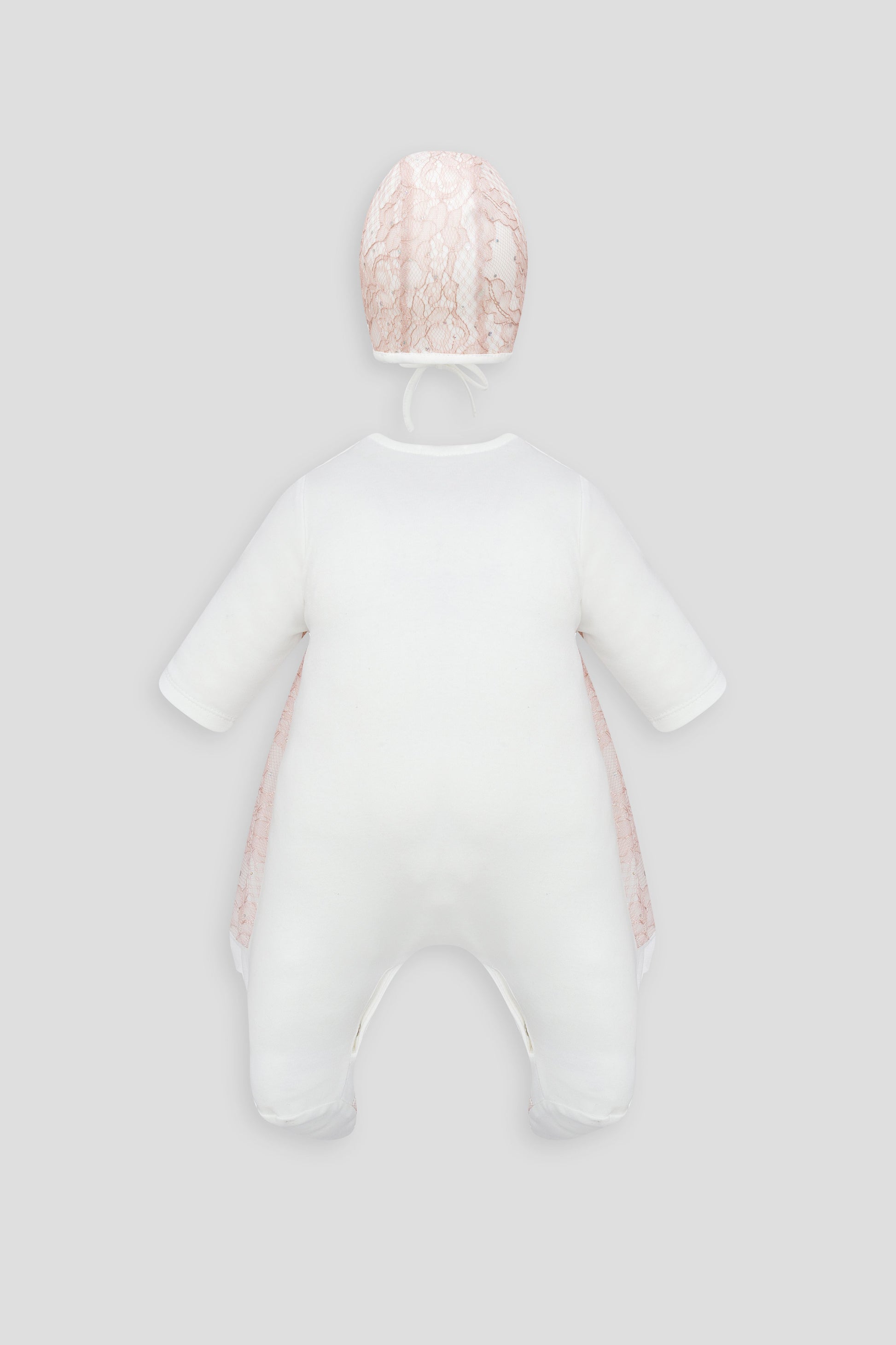 This charming set of clothing for girls consists of an adorable dress-jumpsuit and an elegant bonnet. The beautiful retro-style outfit is made from delicate ""vanilla cream"" shade lace fabric and is adorned with a large matching collar. The lovely pastel-colored model is perfect for performances or other important events in a little princess's life. The lining is made of soft natural cotton.