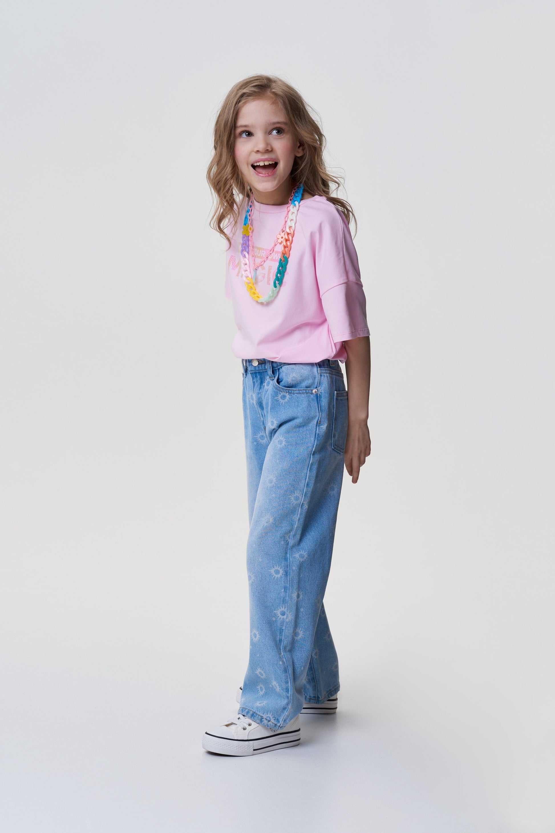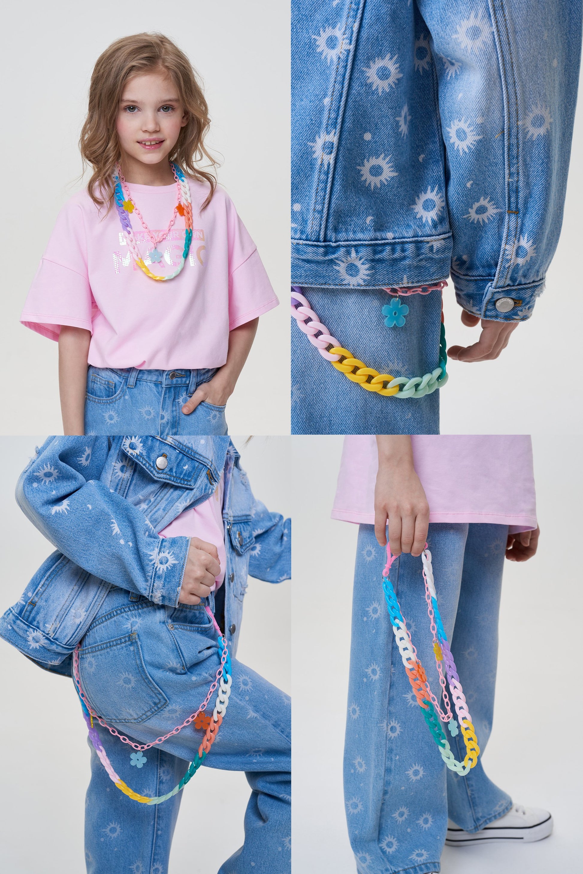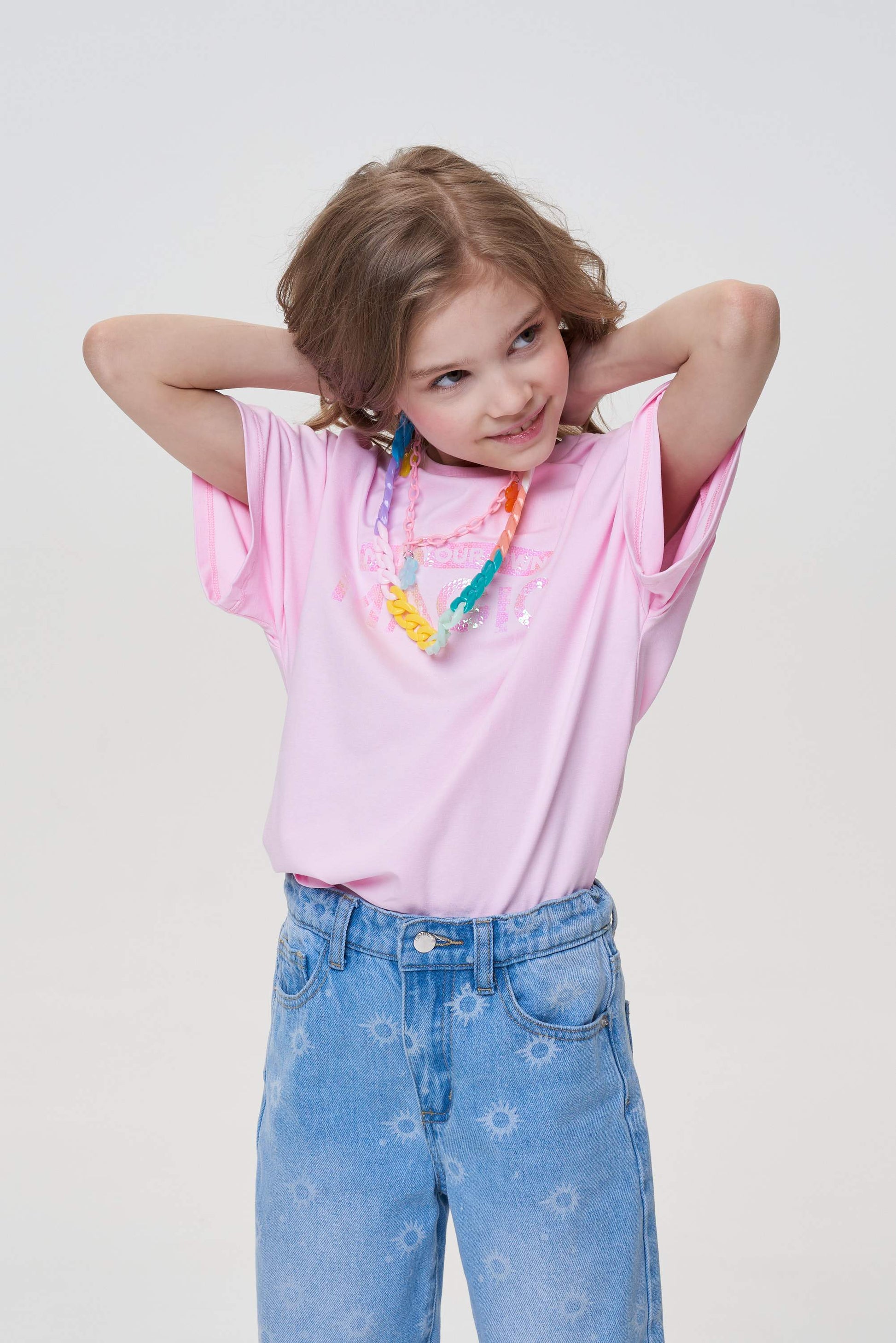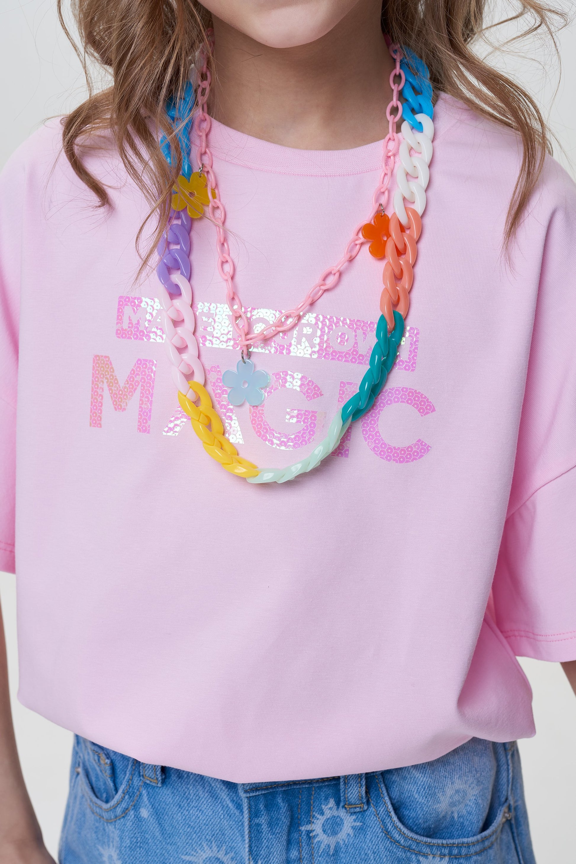 A magnificent jumper-football for a girl. To be in trend, a fashionable skirt (or shorts), stylish golfs with a beautiful pattern, spectacular shoes and such a T -shirt with a print made of thin pink cotton. Imitation of a colored chain and an original pendant in the gate area looks amazing ...