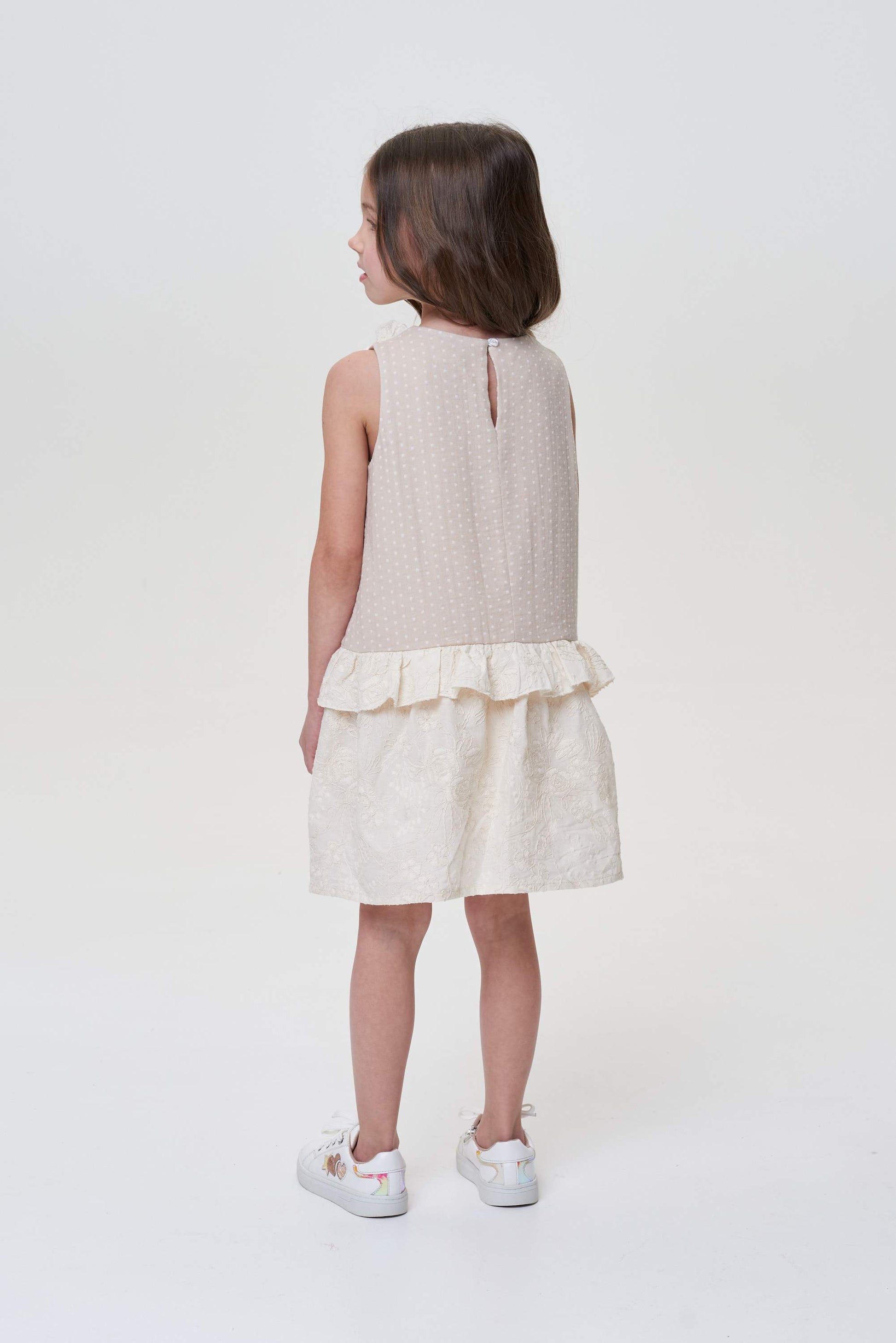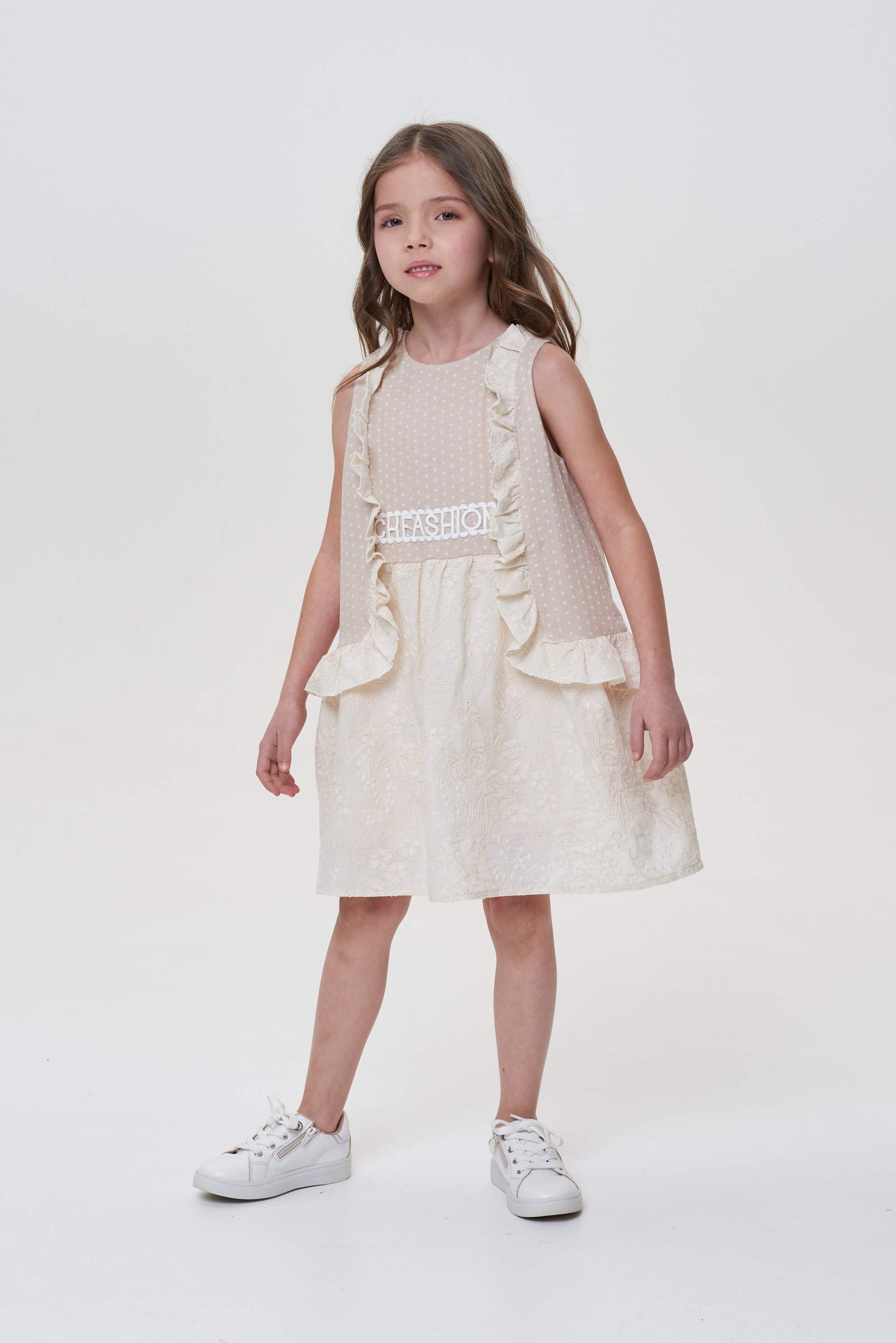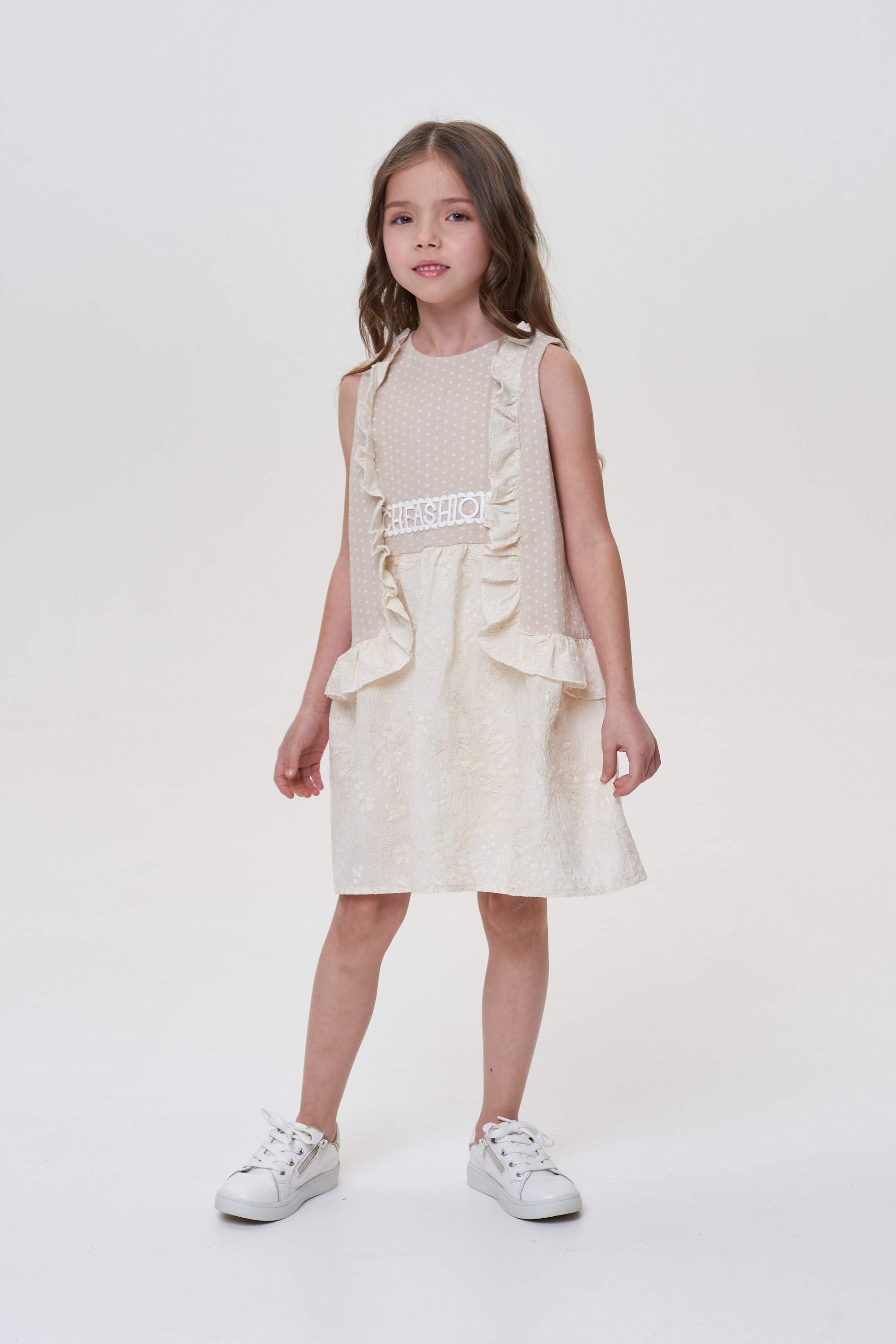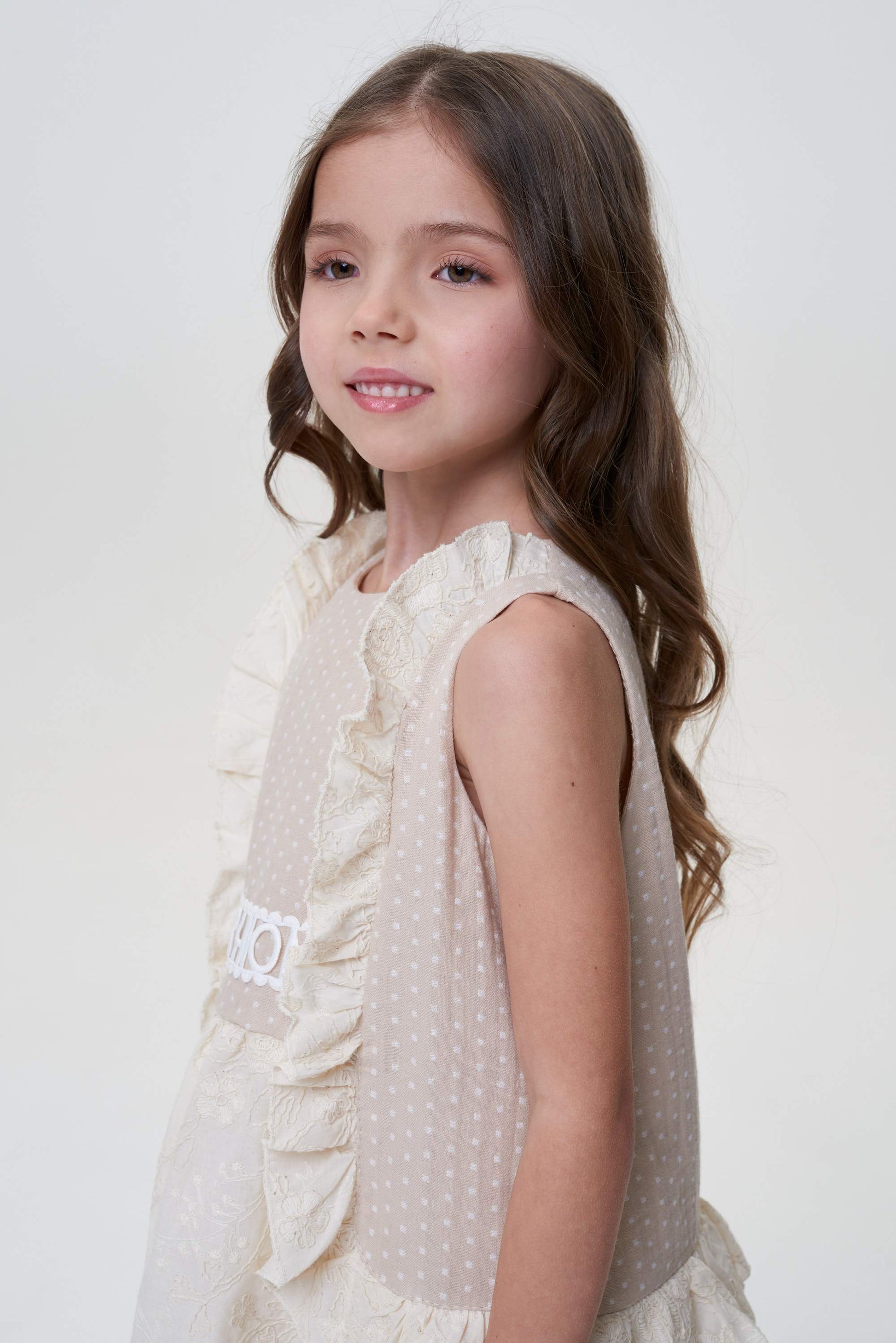 The model is made in the aristocratic color of Ecre. The combination of two different textures and materials, as well as the printed braid, became the main decoration of the design. A 100% cotton lining indicates unsurpassed comfort for the child. The dress is fastened behind the button.