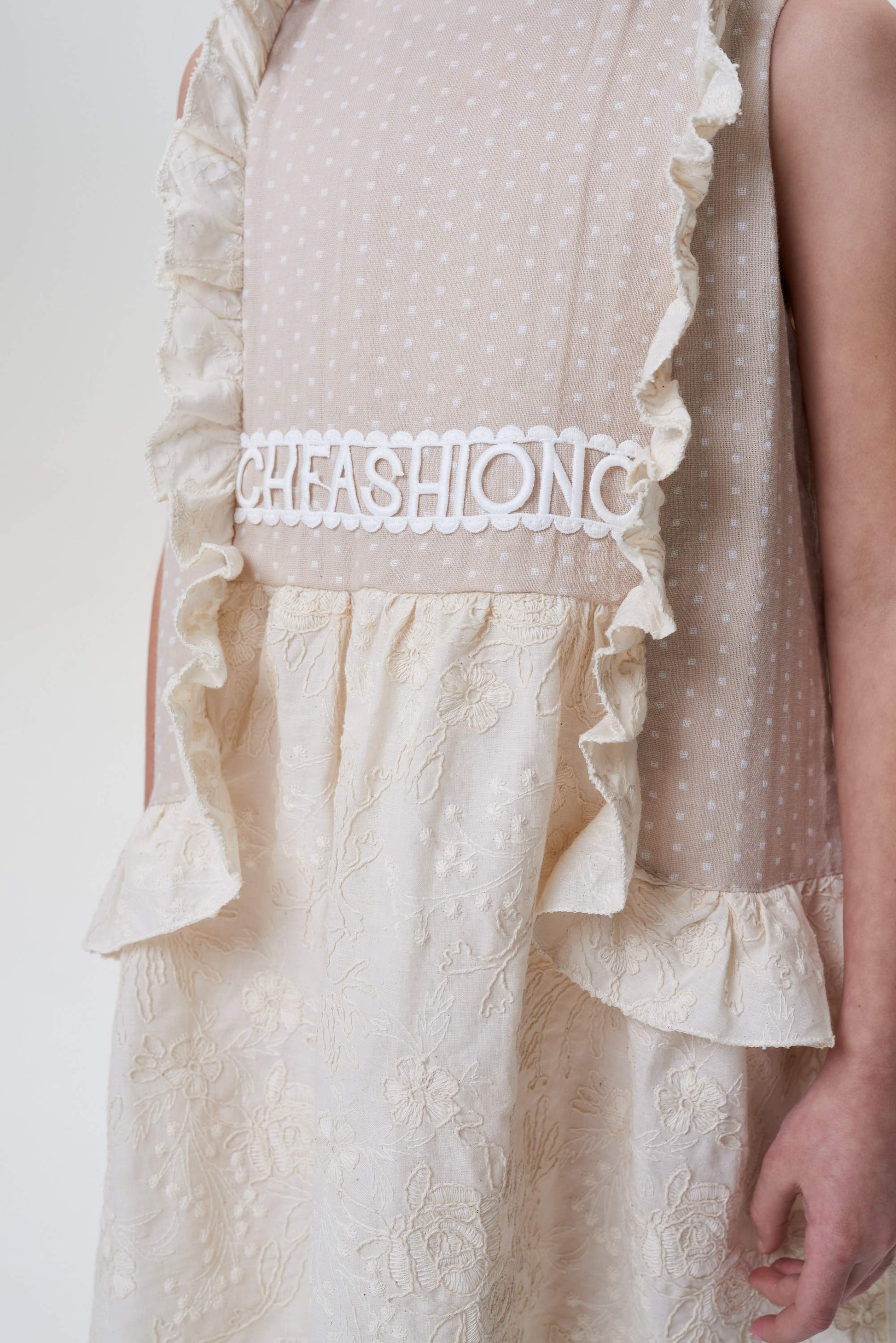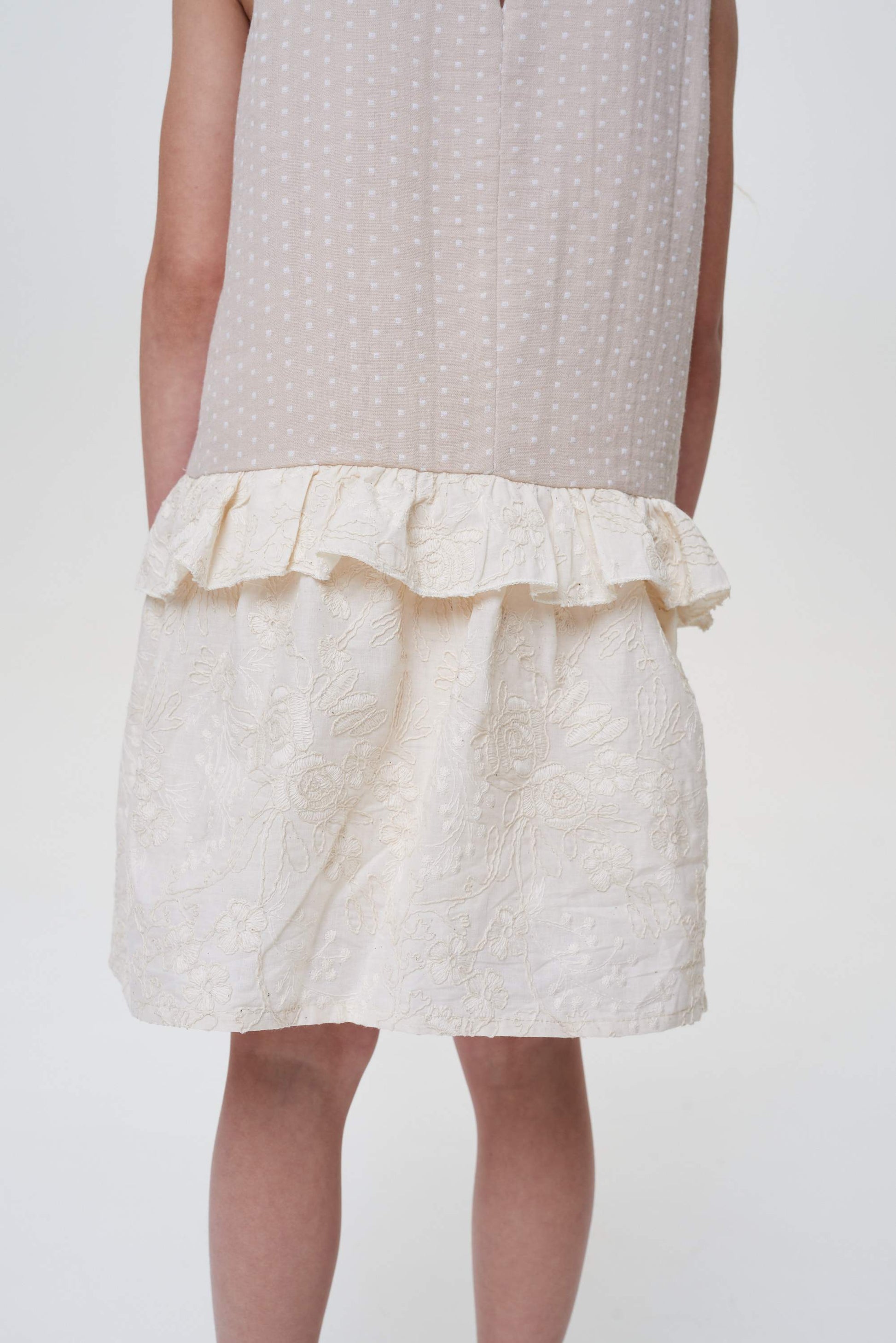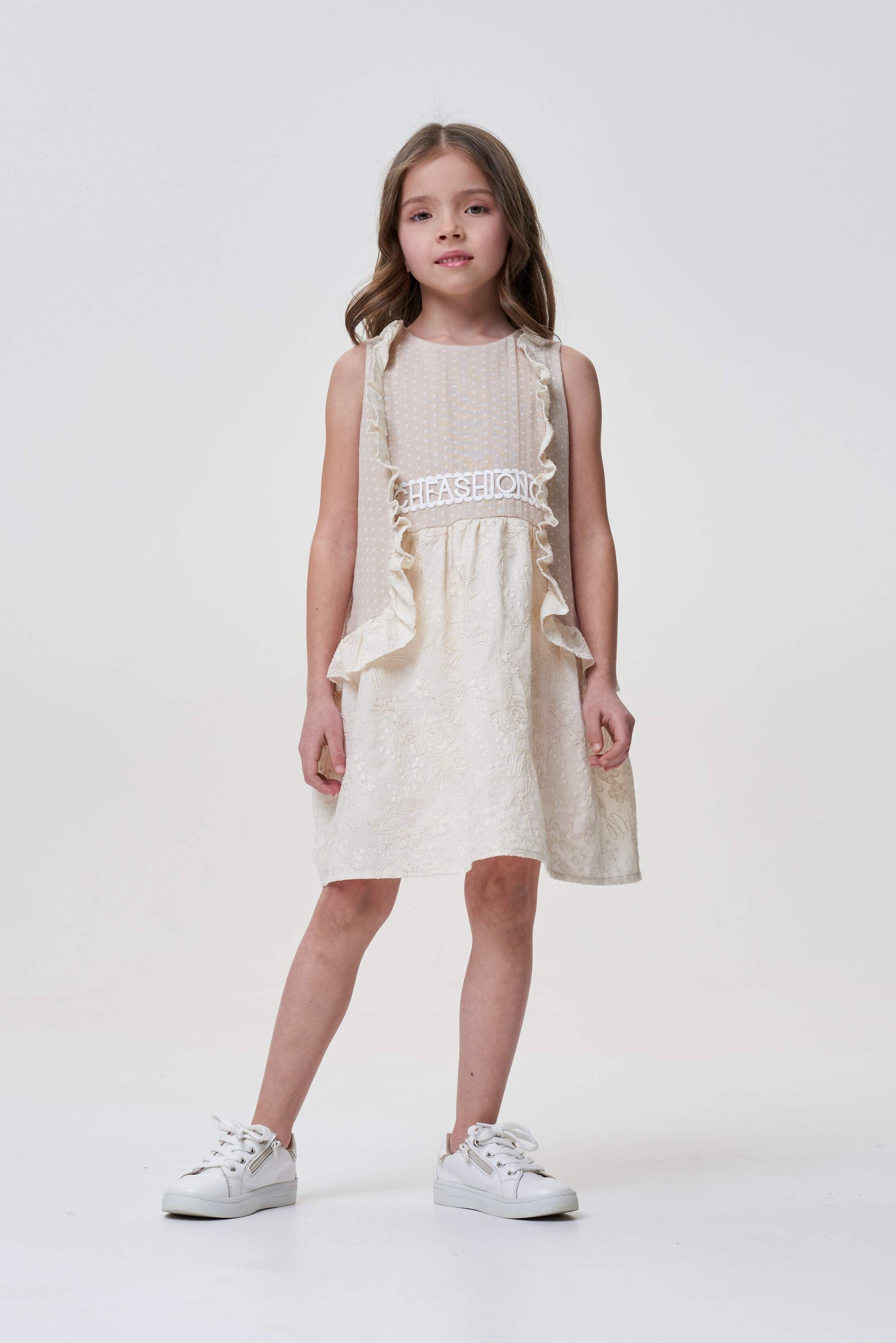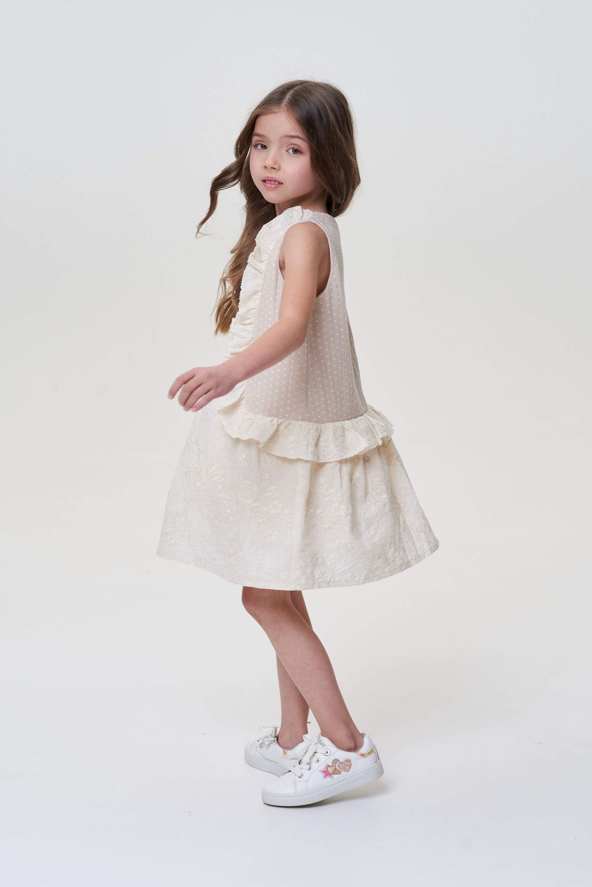 The model is made in the aristocratic color of Ecre. The combination of two different textures and materials, as well as the printed braid, became the main decoration of the design. A 100% cotton lining indicates unsurpassed comfort for the child. The dress is fastened behind the button.