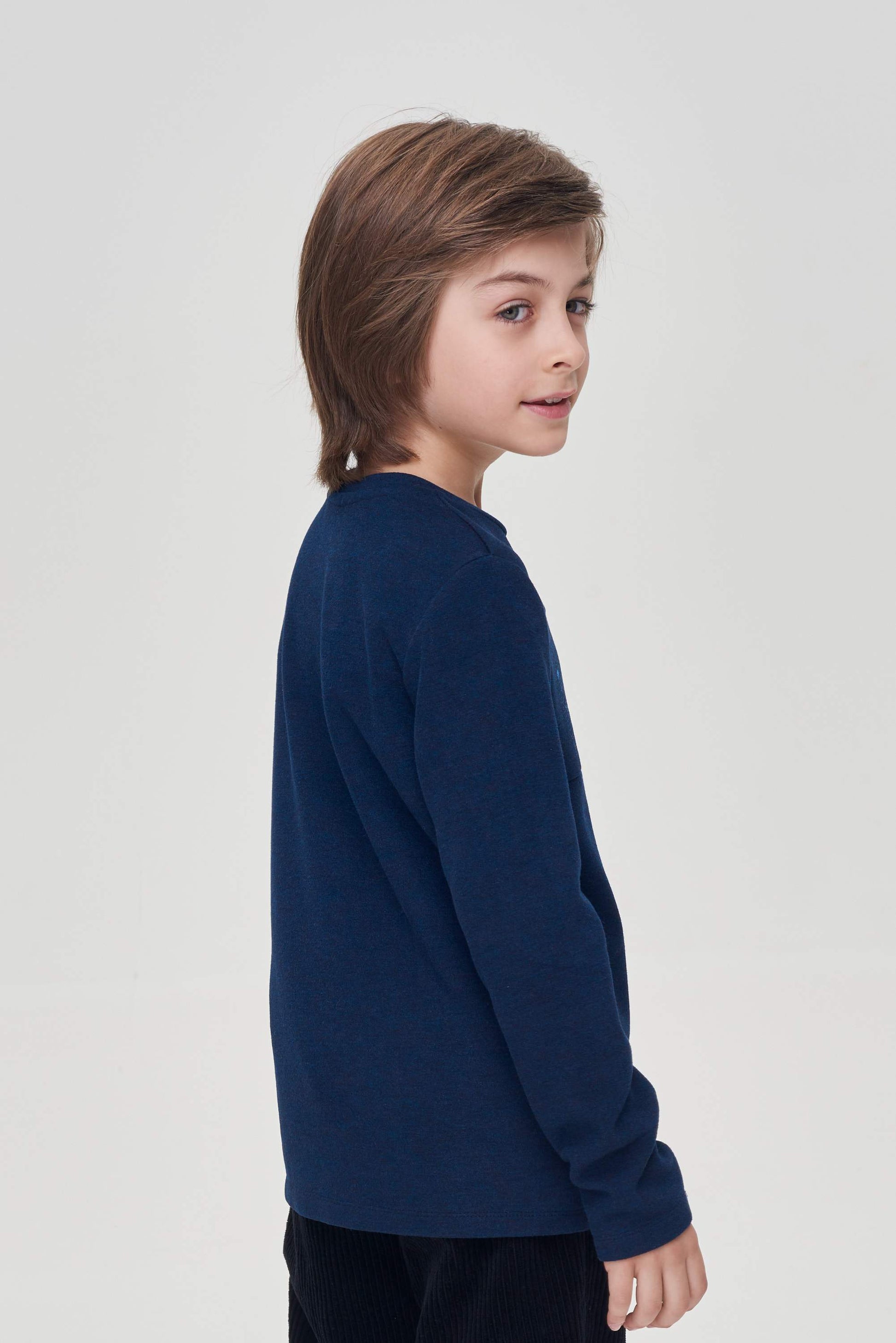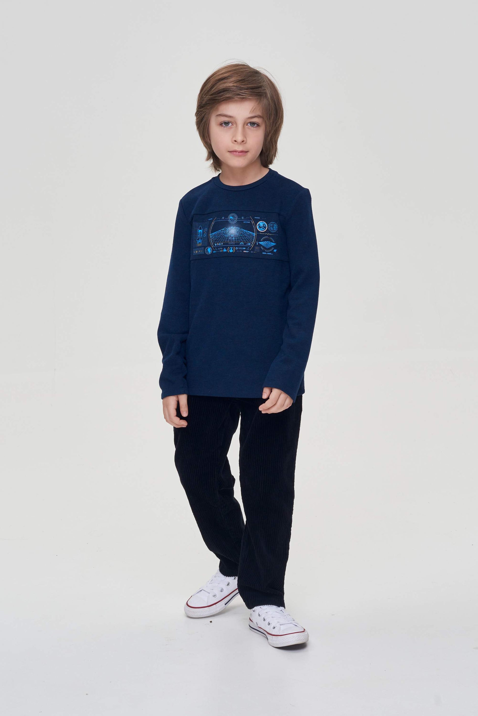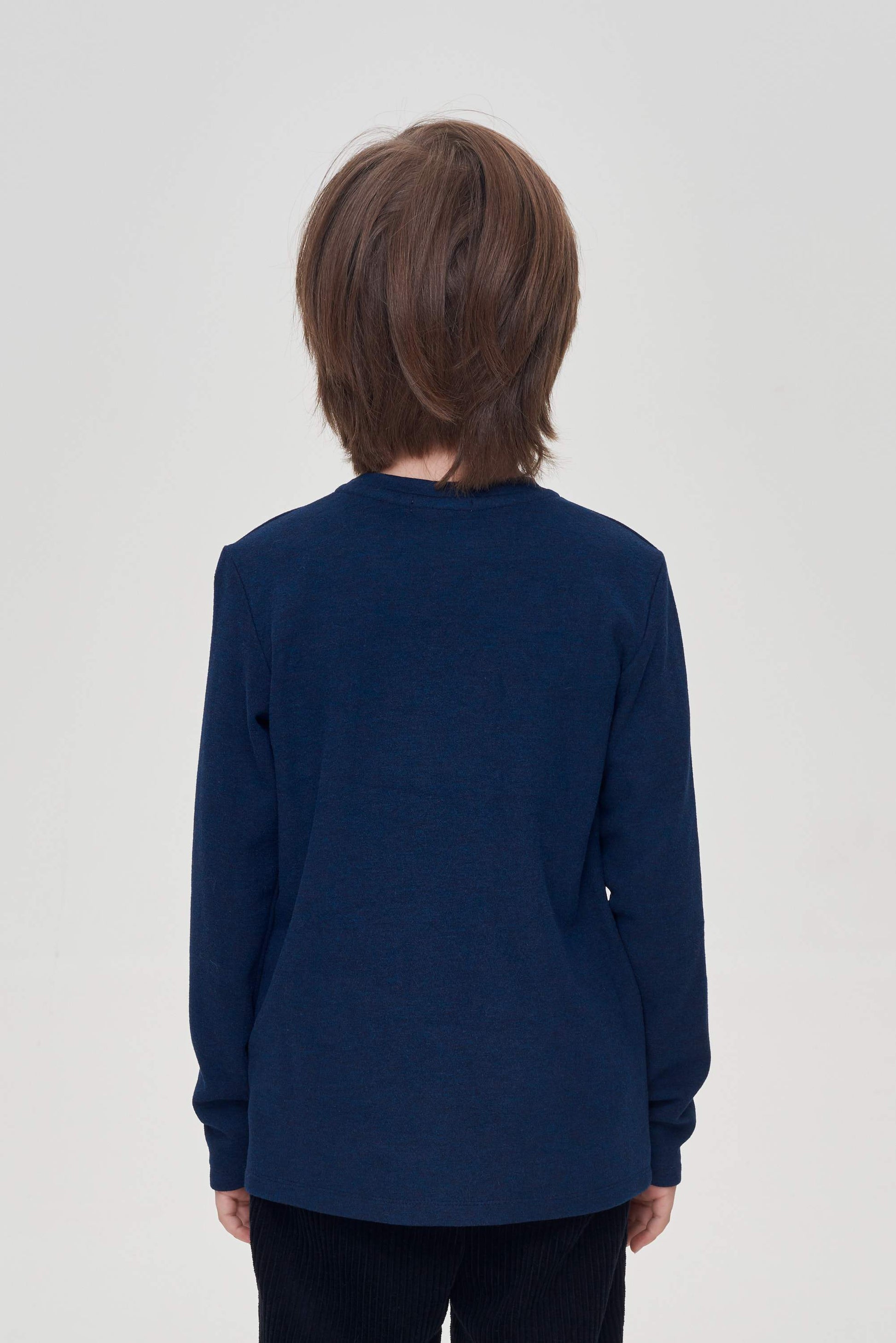 Long sleeve dark blue is the perfect basic clothing for a child's wardrobe. Longsleeve will easily find a companion in the form of trousers or jeans. Round neckline and straight sleeves do not constrain movement, allow the child to engage in active sports. The decoration of the design was an unusual print with a plot from a computer game. This design will definitely appeal to the child.