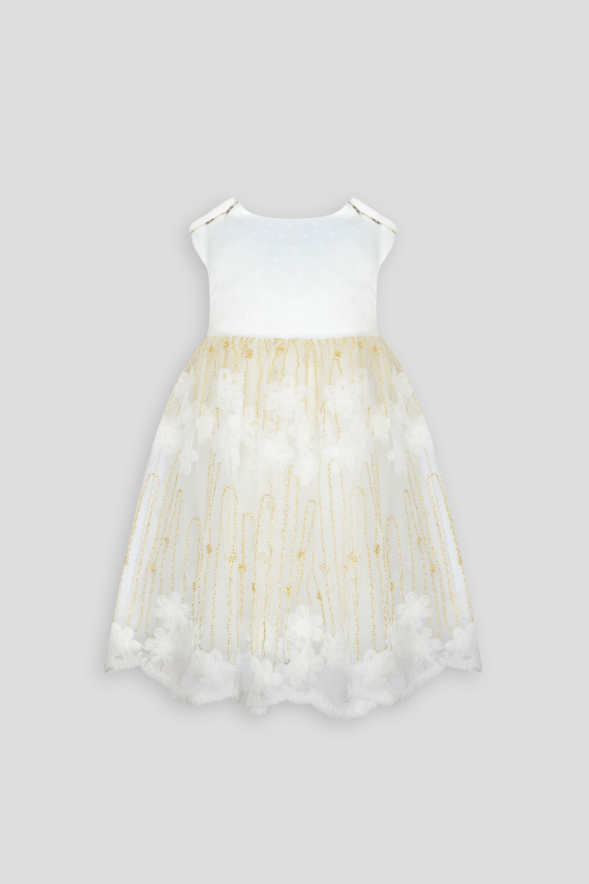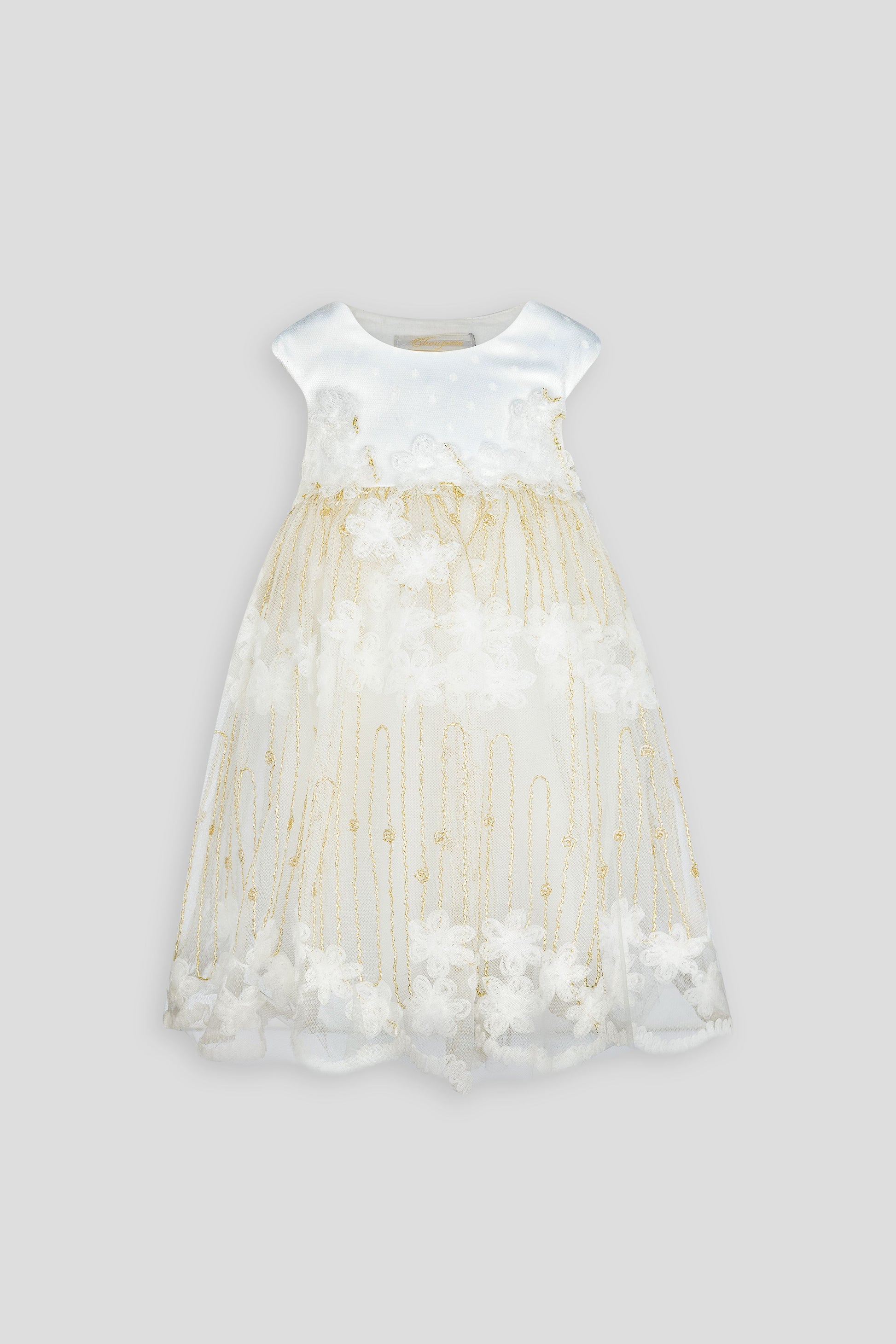 Unusually beautiful festive dress for girls. An elegant model with an exquisite floral decor will be the subject of admiration of others! A real princess dress? A neat top is complemented by a fluffy American skirt which looks great on young fashionistas. A snow-white outfit with a cotton lining is decorated with embroidery with gold threads. A great option for a matinee, and of course, in such a dress you can go to visit friends and family.