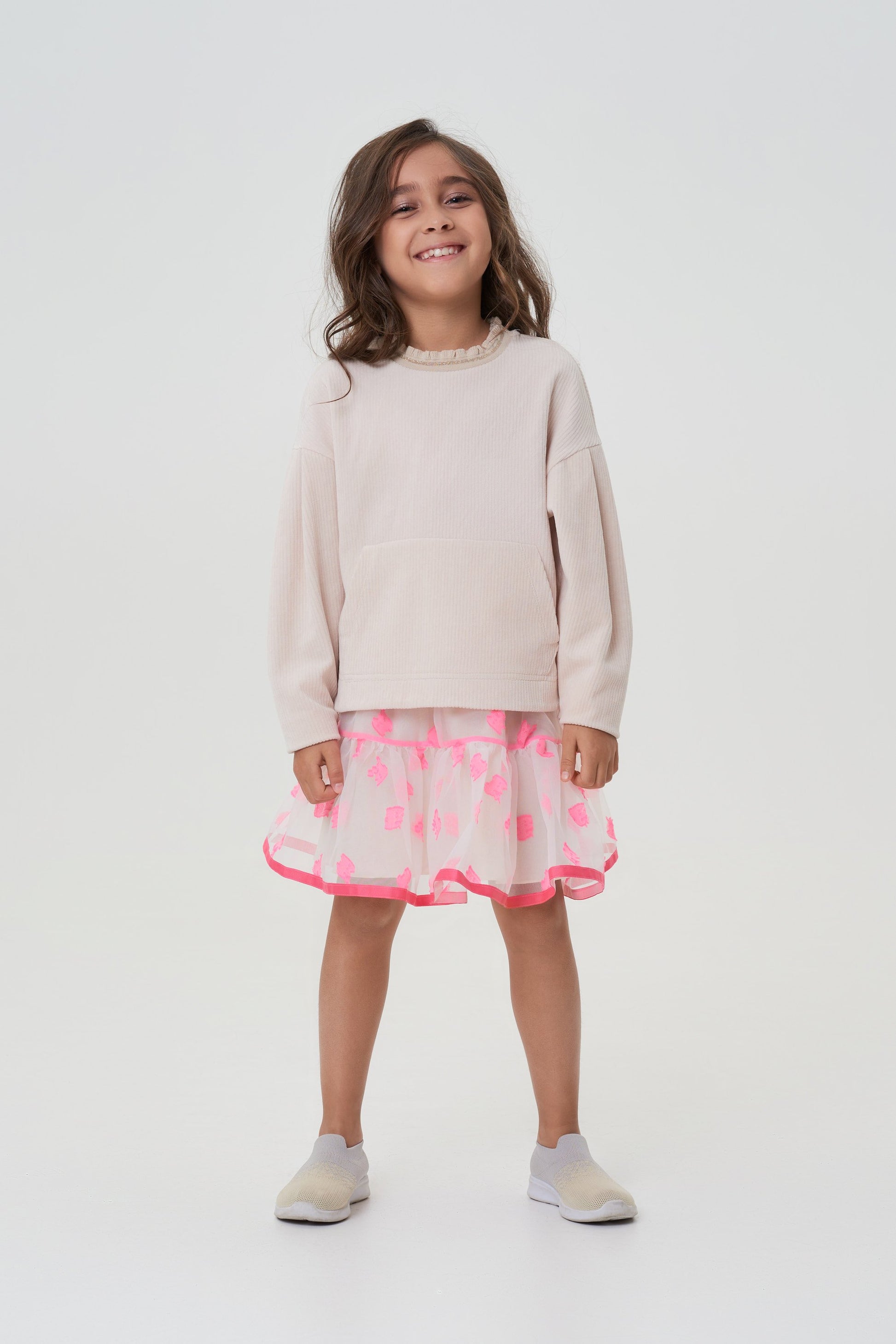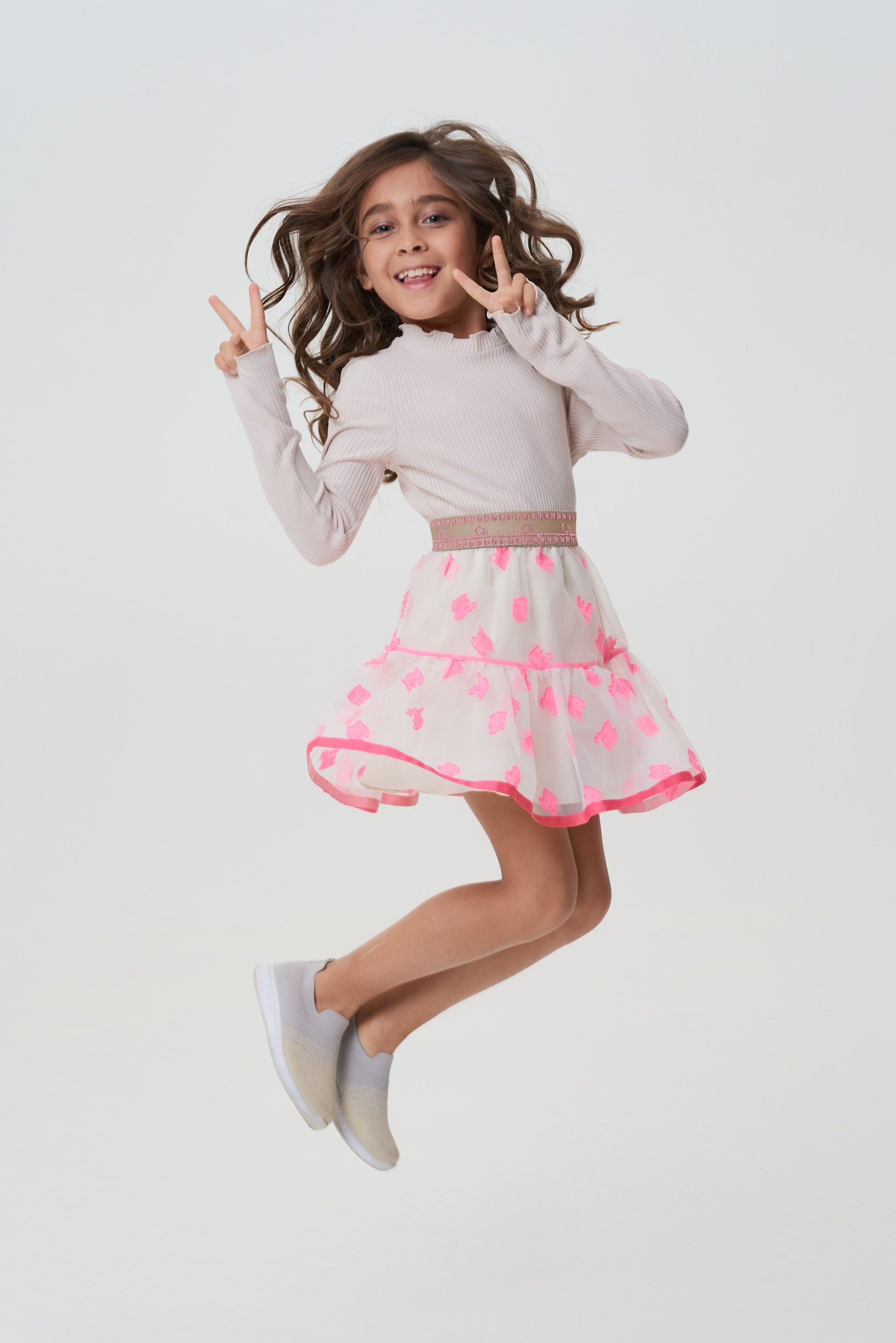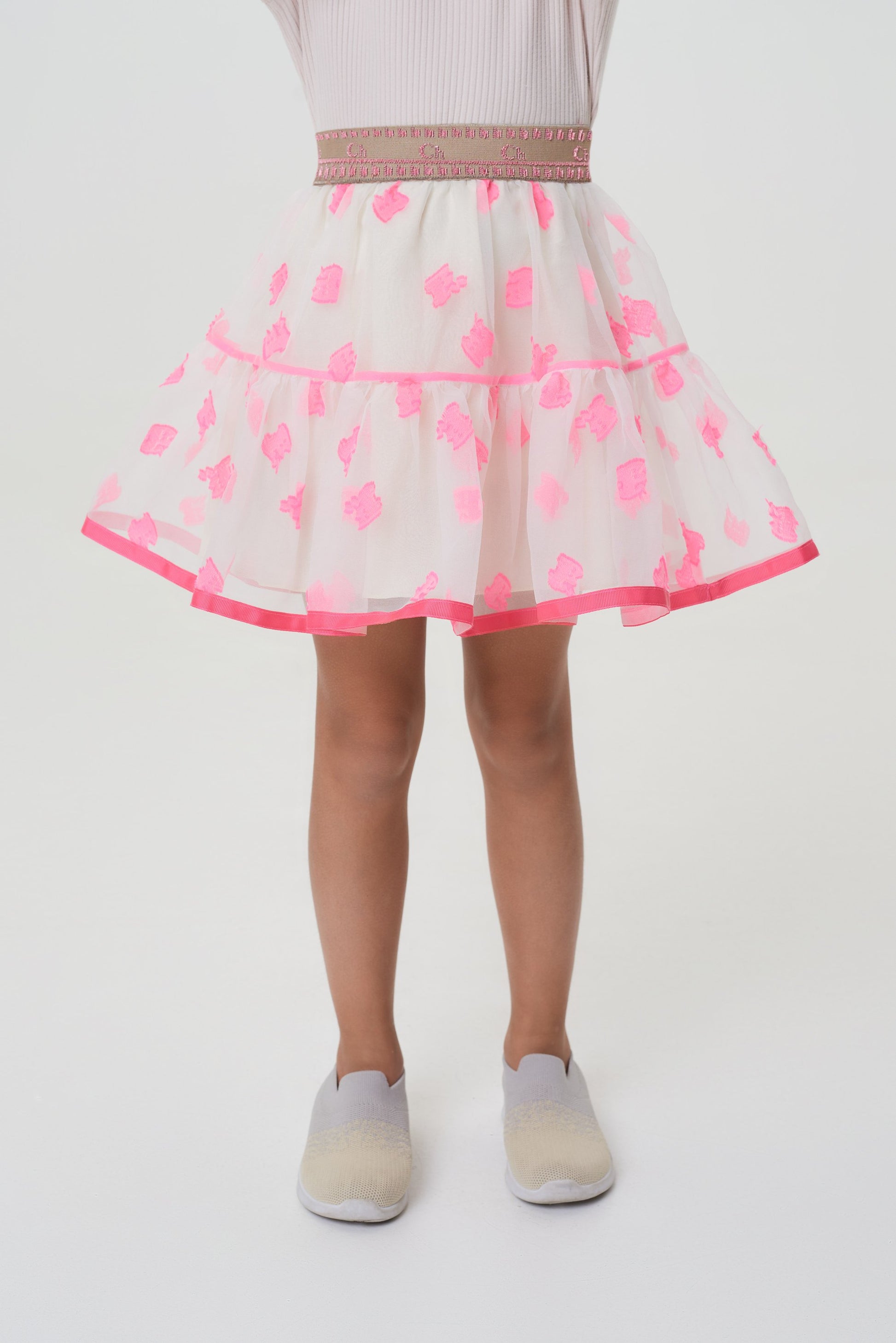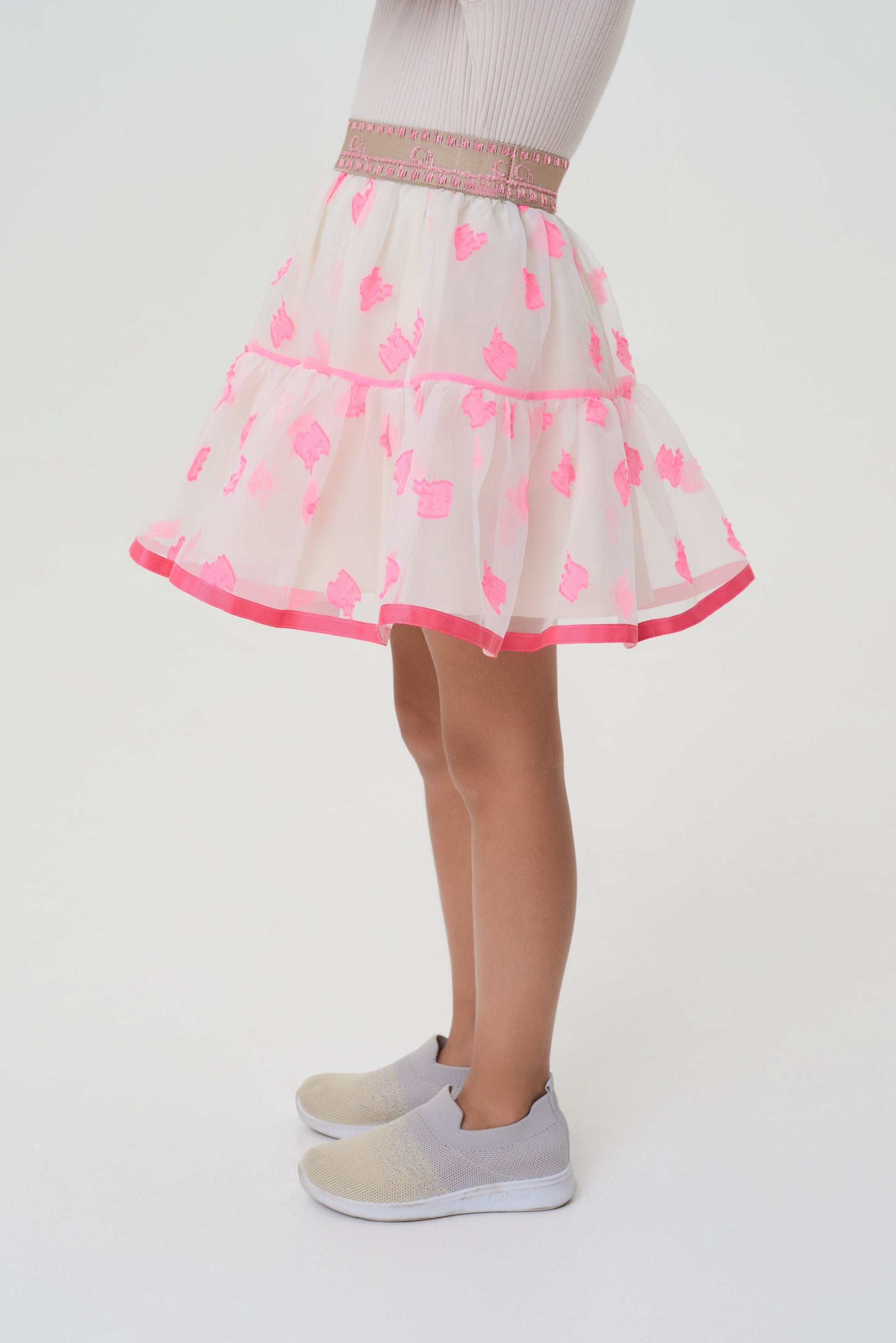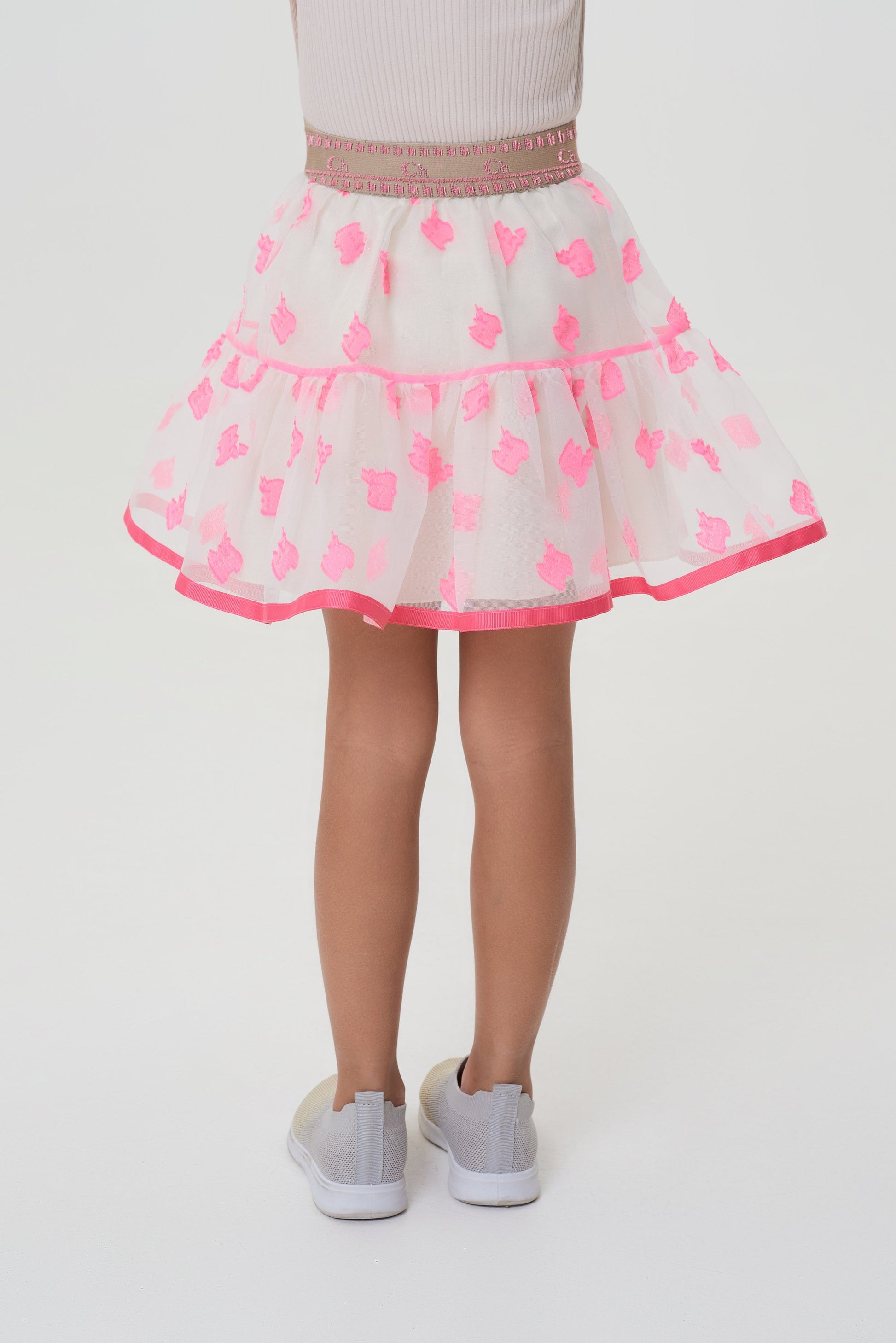 A voluminous two-layer knee-length skirt adds a touch of festivity to a girl's everyday outfit. The A-line silhouette features a white cotton lining. The top layer is made of transparent fuchsia organza with a wide ruffle, the edge of which is highlighted with a shiny fuchsia trim. The waist is adorned with a pink and green checkered belt.