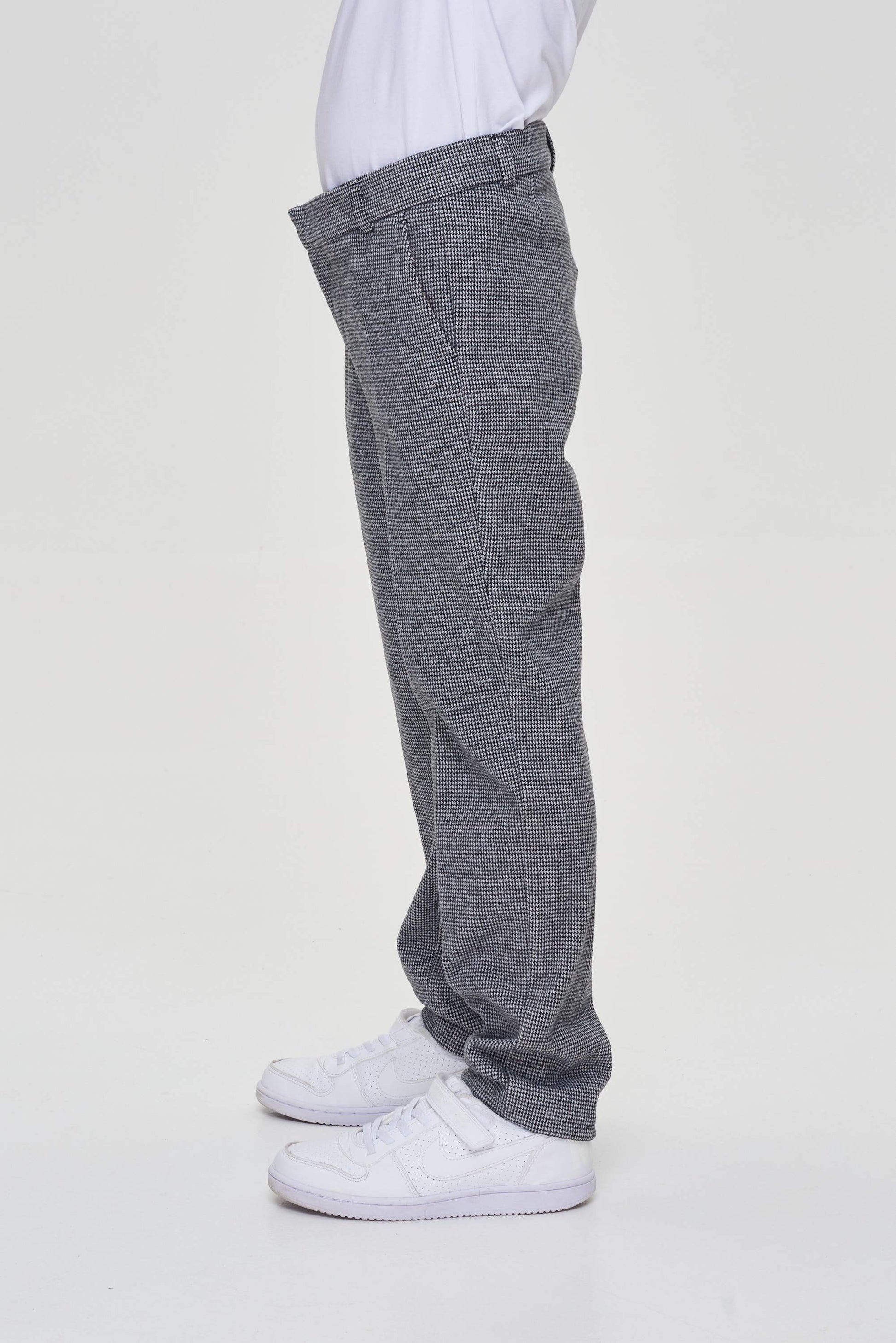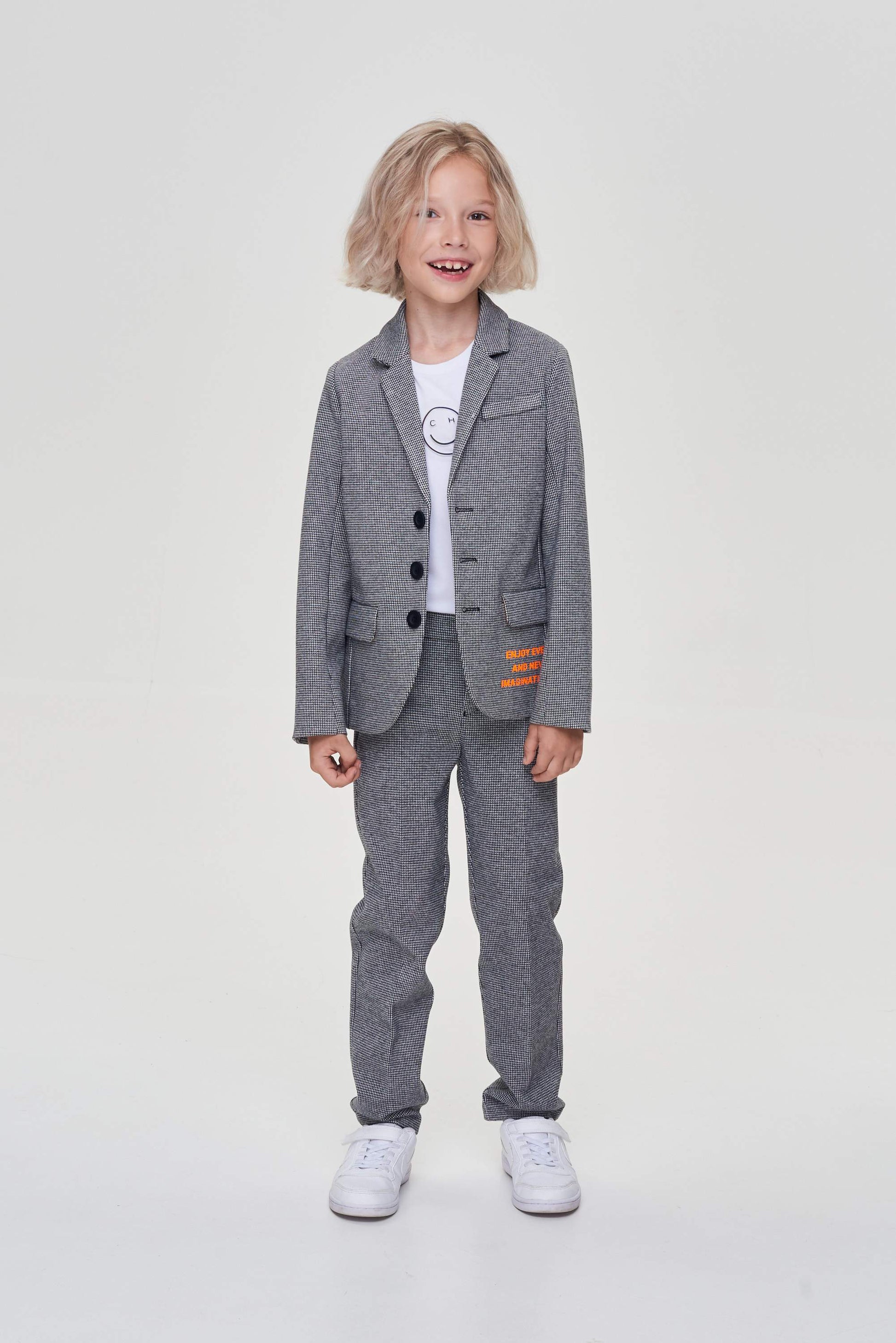 A great option for a future leader who believes that success in life is the norm! A child should learn from a very early age to be on top. The ability to dress beautifully is an important skill, it helps to create the necessary image. Stylish trousers with a fashionable print of pieux de bullets for a boy. The elegant wardrobe item is perfect for spectacular bows with a variety of shirts, sweatshirts, jackets and shirts.