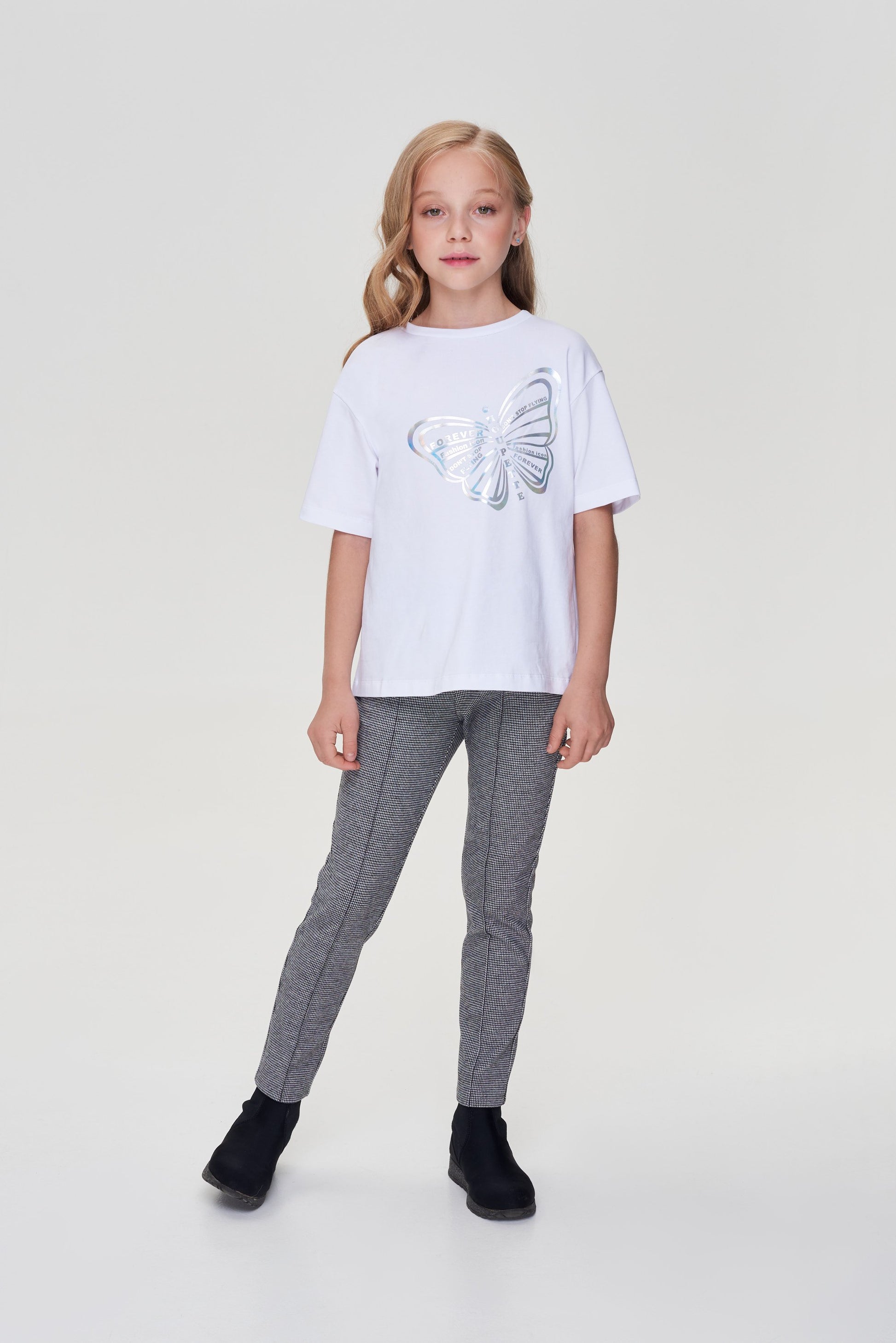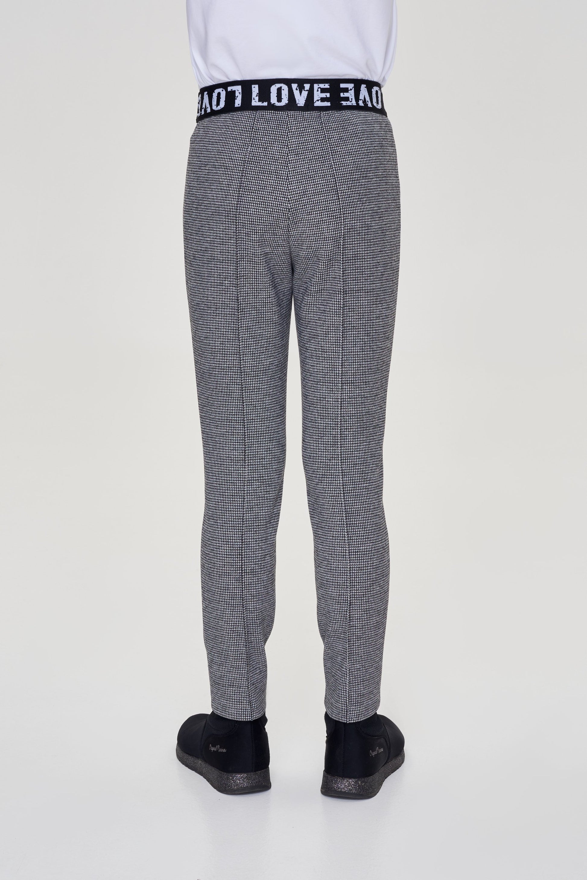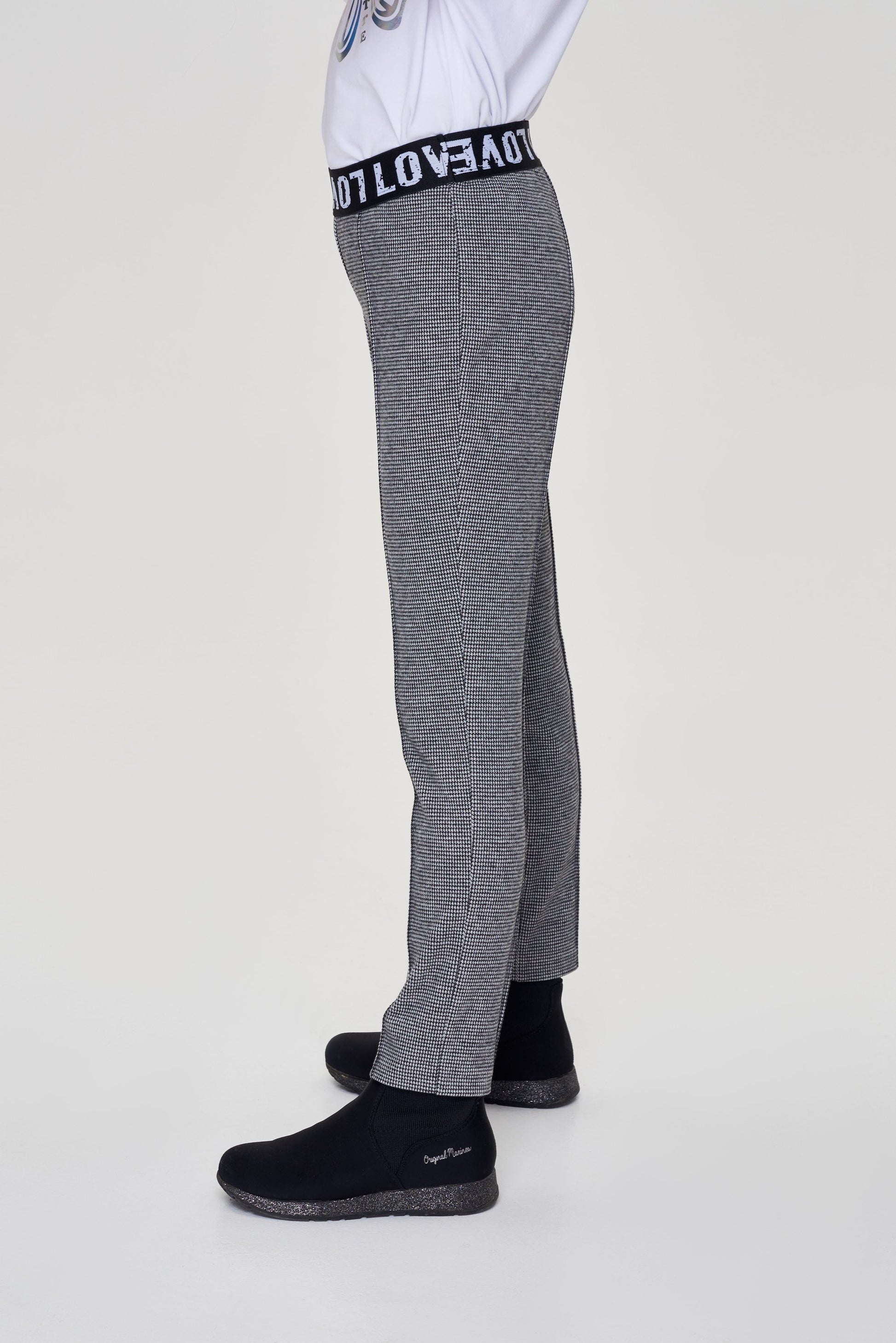 Extremely stylish and comfortable model. Geometric print ""crow's foot"" is back in trend! Narrowed trousers for girls are made of variegated black and white fabric with a fashionable pie de bullet effect, elastic material with a high content of viscose pleasant to the body. Belt on a wide elastic band with contrasting d?cor. Spectacular finish - arrows. Comfortable fit, tight-fitting cut, such clothes are ideal for walking around the city.
