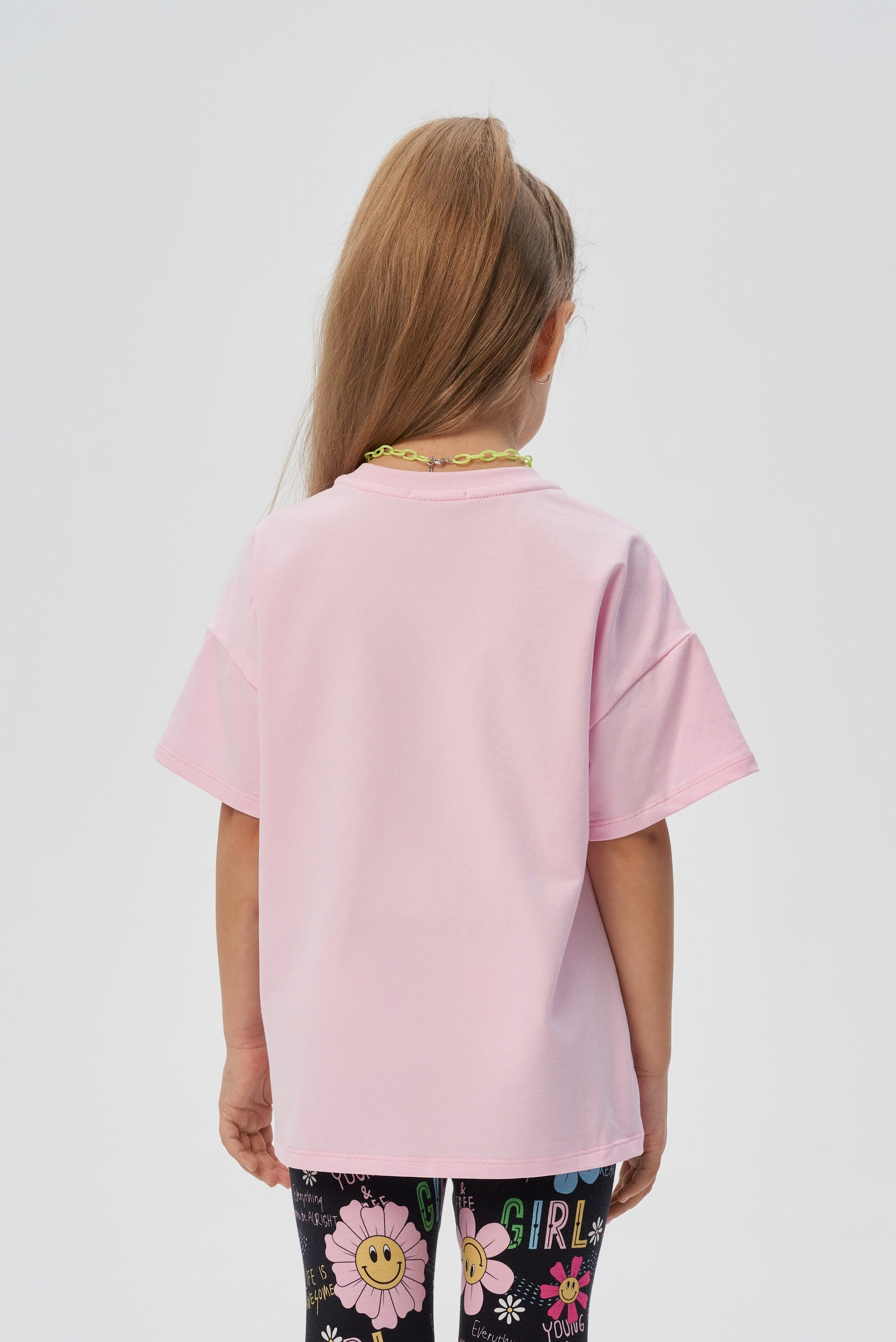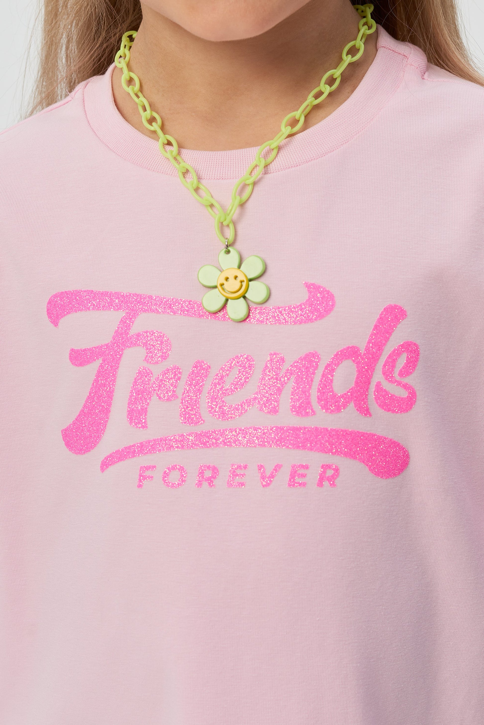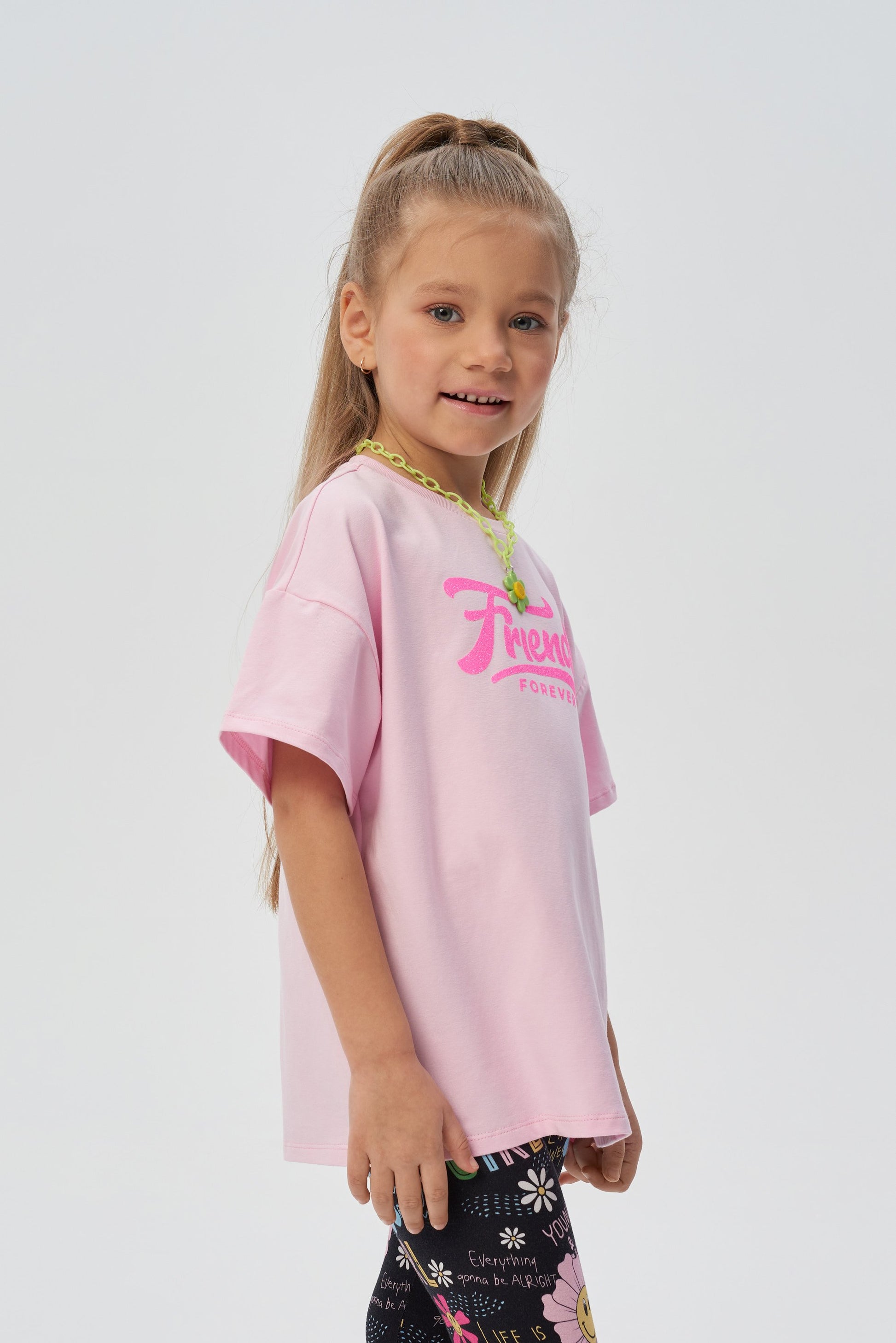 A T-shirt for a girl of a pale pink shade is made of soft and pleasant to the body of natural fabric. Model of a comfortable direct silhouette. The neckline is decorated with a spectacular necklace in the form of a chain with a flower. A contrasting text print on the chest decorates design. Jumper's flirty mood is emphasized by lush sleeves-wings.