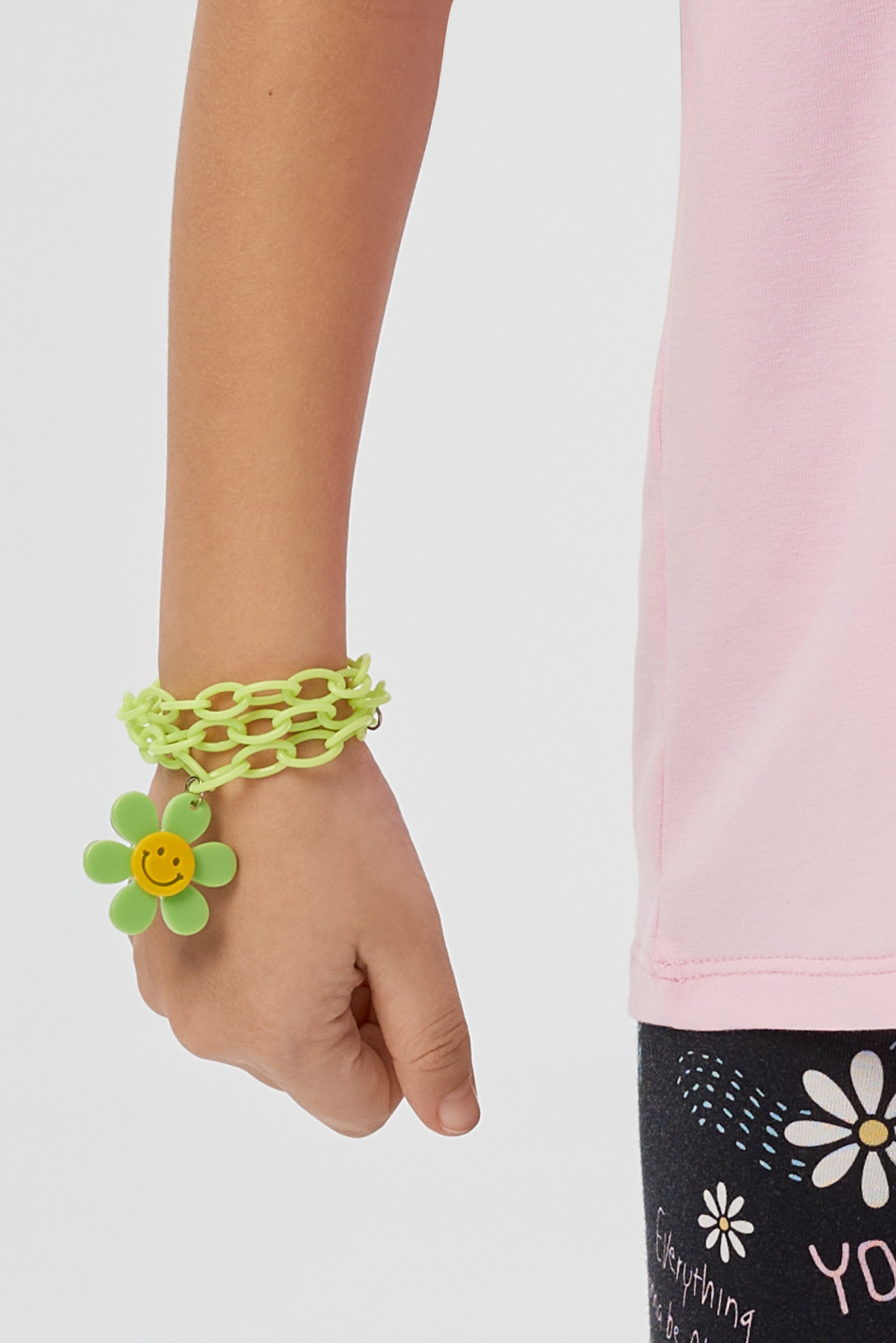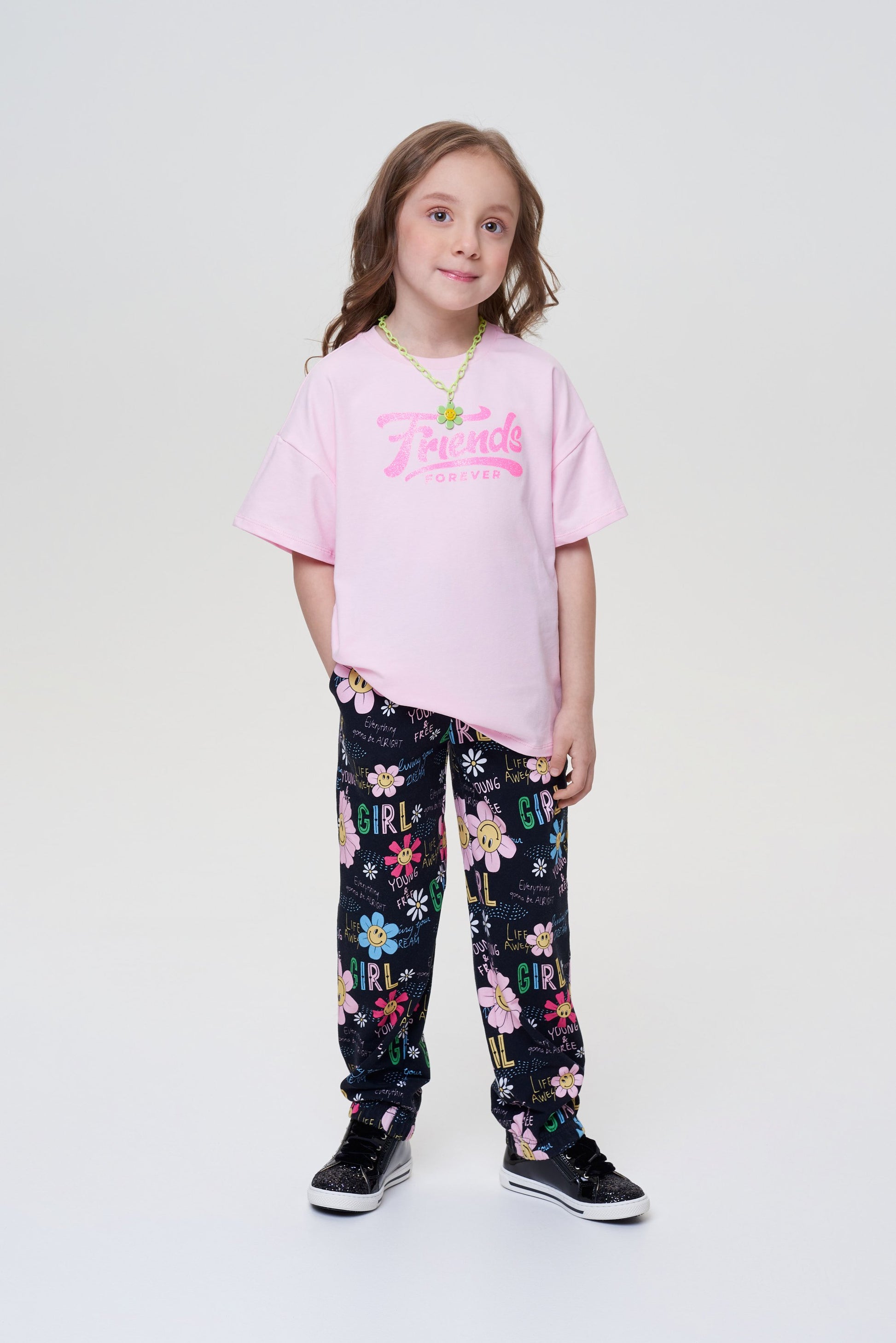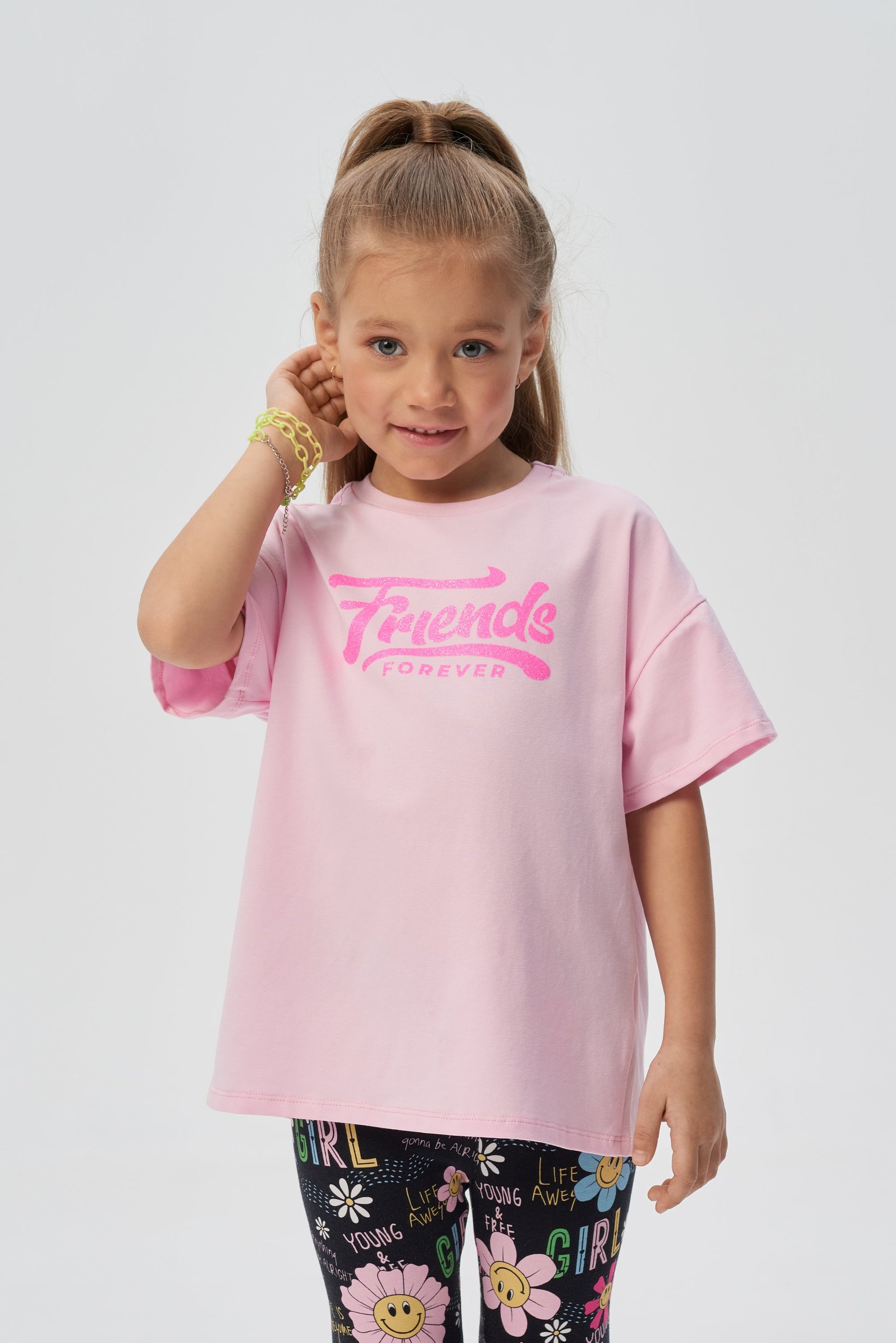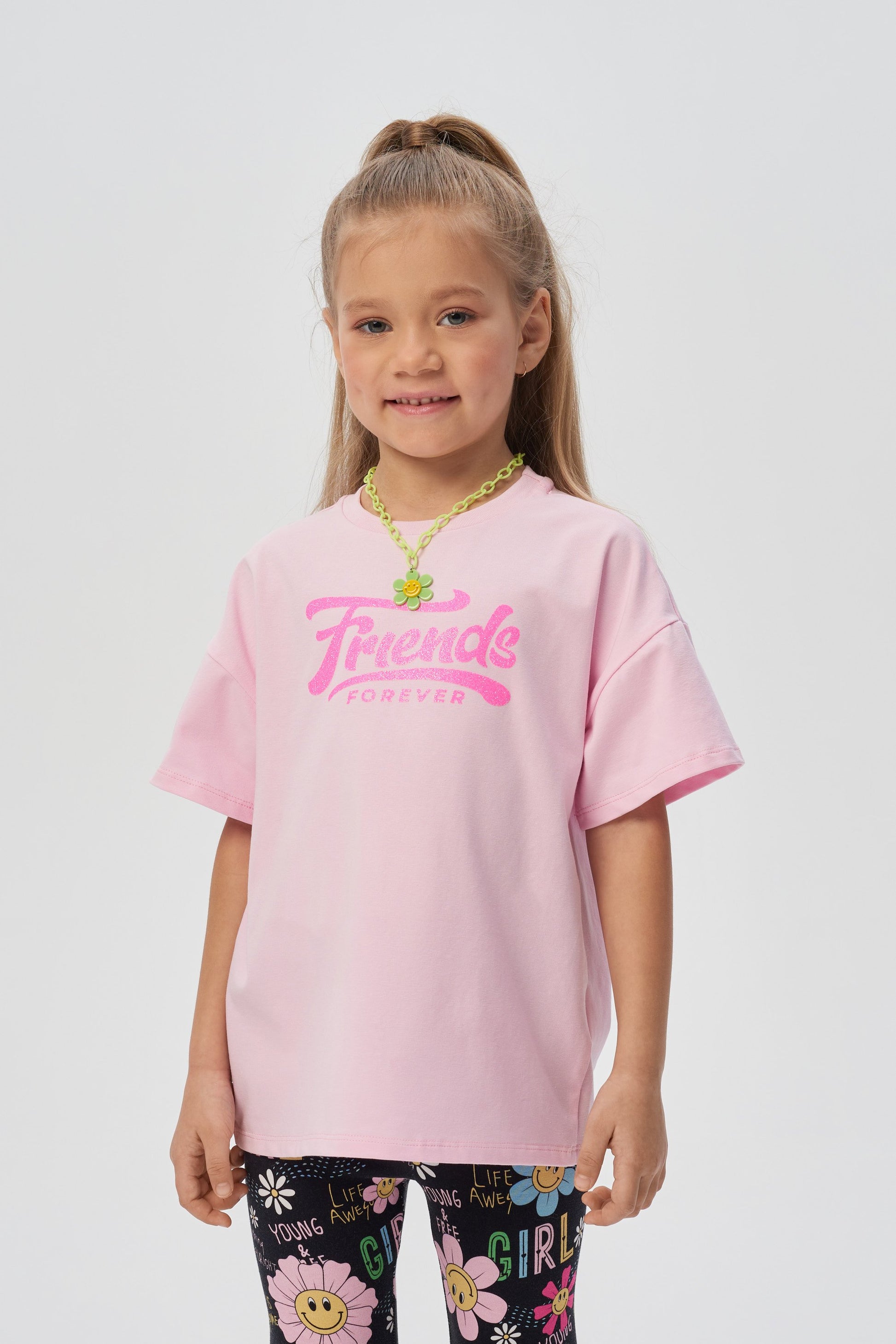 A T-shirt for a girl of a pale pink shade is made of soft and pleasant to the body of natural fabric. Model of a comfortable direct silhouette. The neckline is decorated with a spectacular necklace in the form of a chain with a flower. A contrasting text print on the chest decorates design. Jumper's flirty mood is emphasized by lush sleeves-wings.