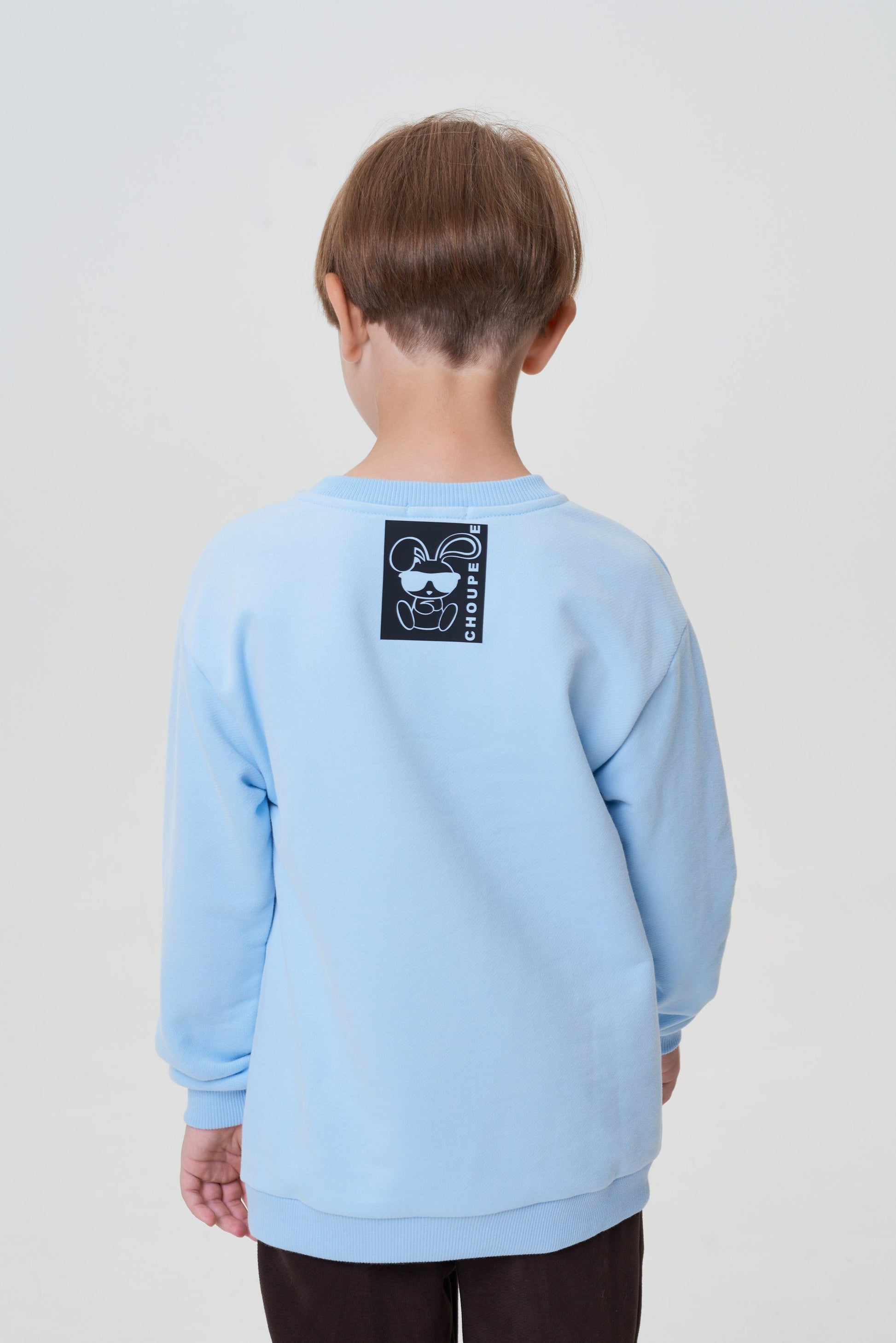 Fashion is a wonderful tool for self-expression, and with trendy pieces, you can create vibrant and unique looks. This original sky-blue jumper-sweatshirt for boys, made from soft cotton knitwear, features a creative print. You can use such an outfit for travel, walks, country vacations, as loungewear, and during active playtime with friends.