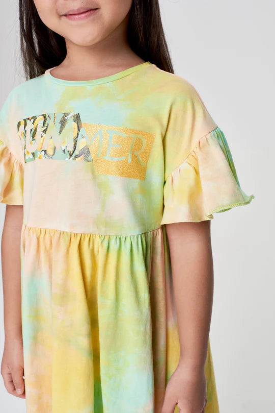 Chic dress from the collection ""Mango Sorbet"". A stylish model for a girl is made of thin cotton knitwear of bright colors, a light breathable fabric - pleasant to the body. Beautiful and comfortable outfit of free cut. A high waist line, short sleeves adorn the lush flounces. On the shelf - an original decor, in the form of a branded print. Ideal for a summer holiday!