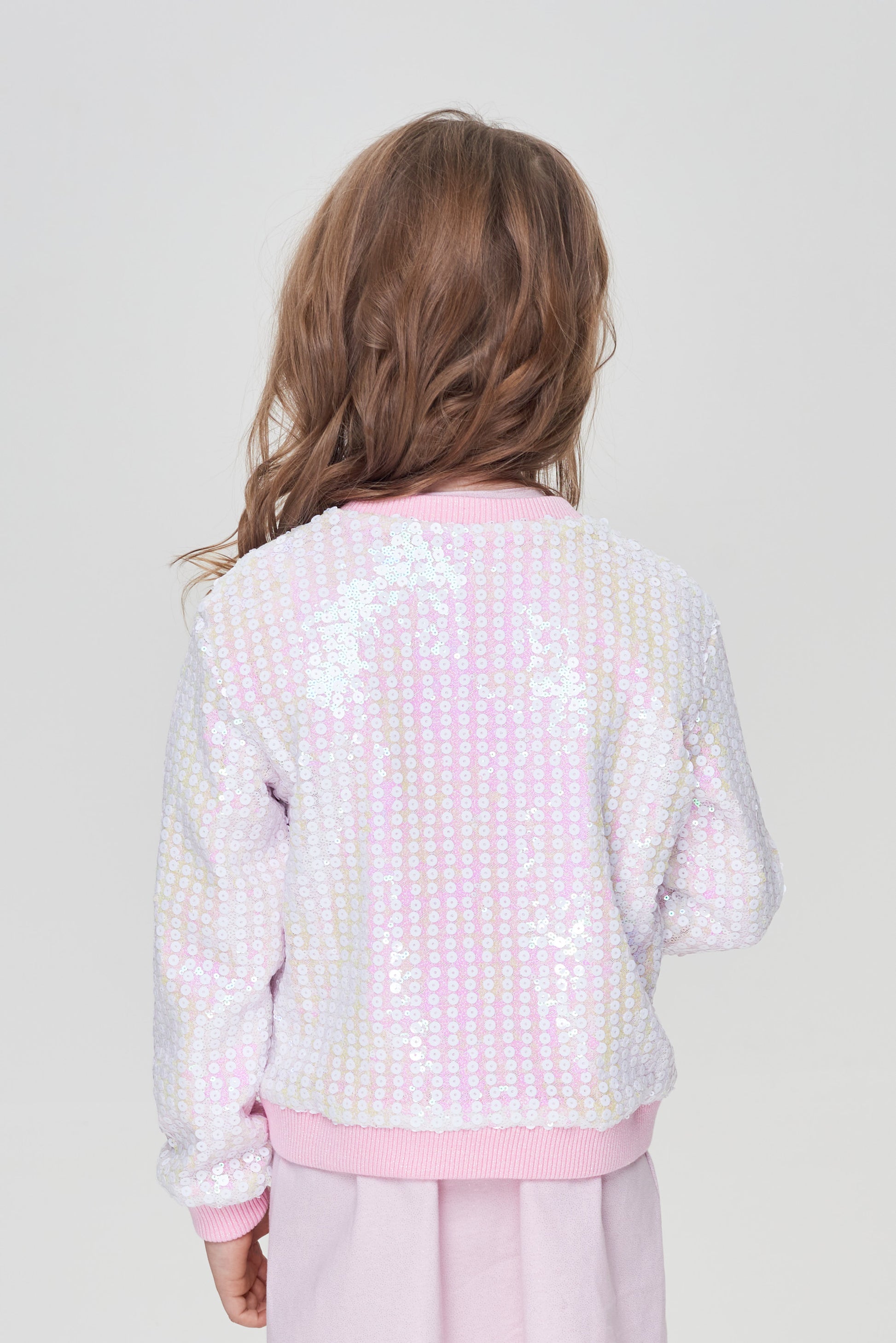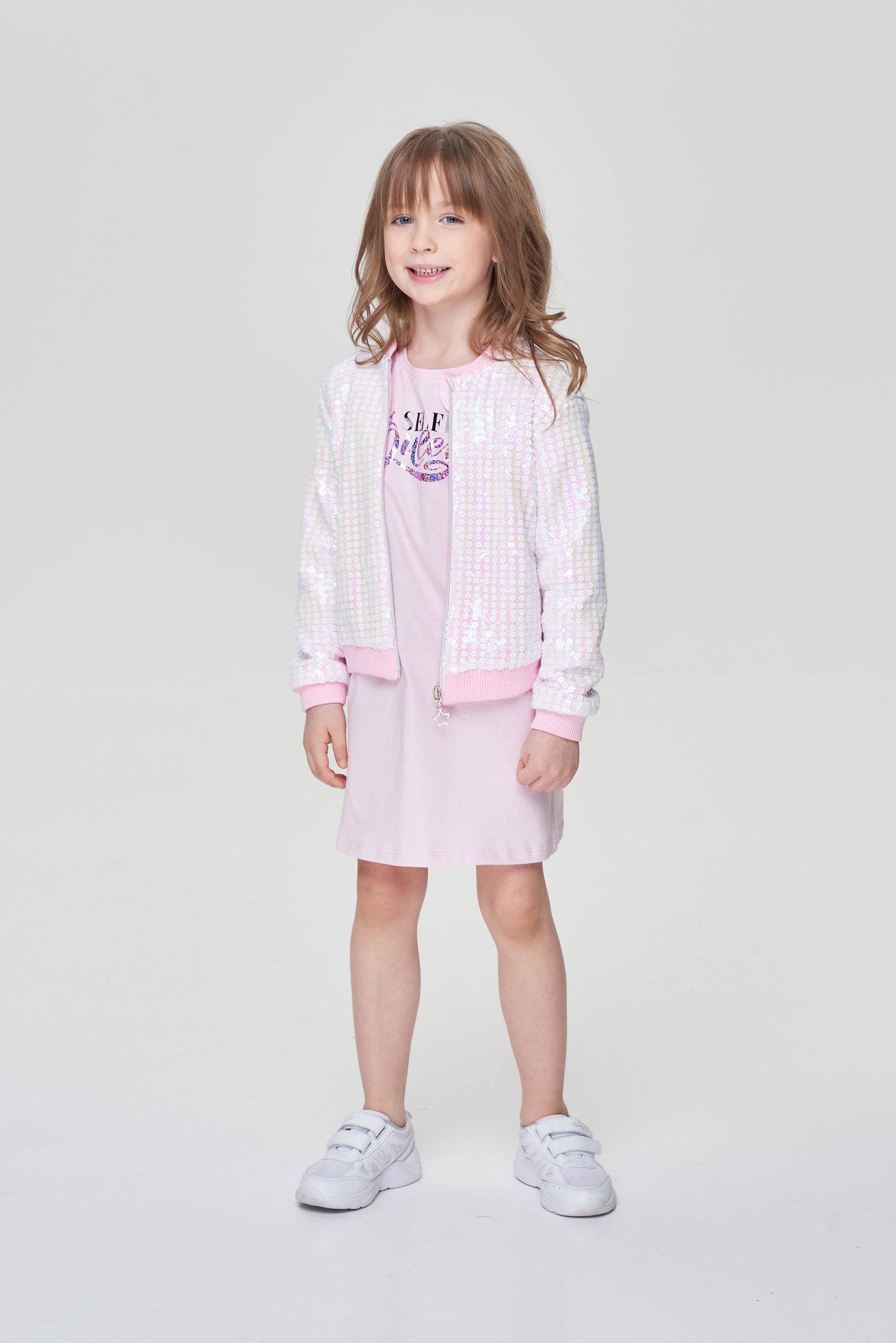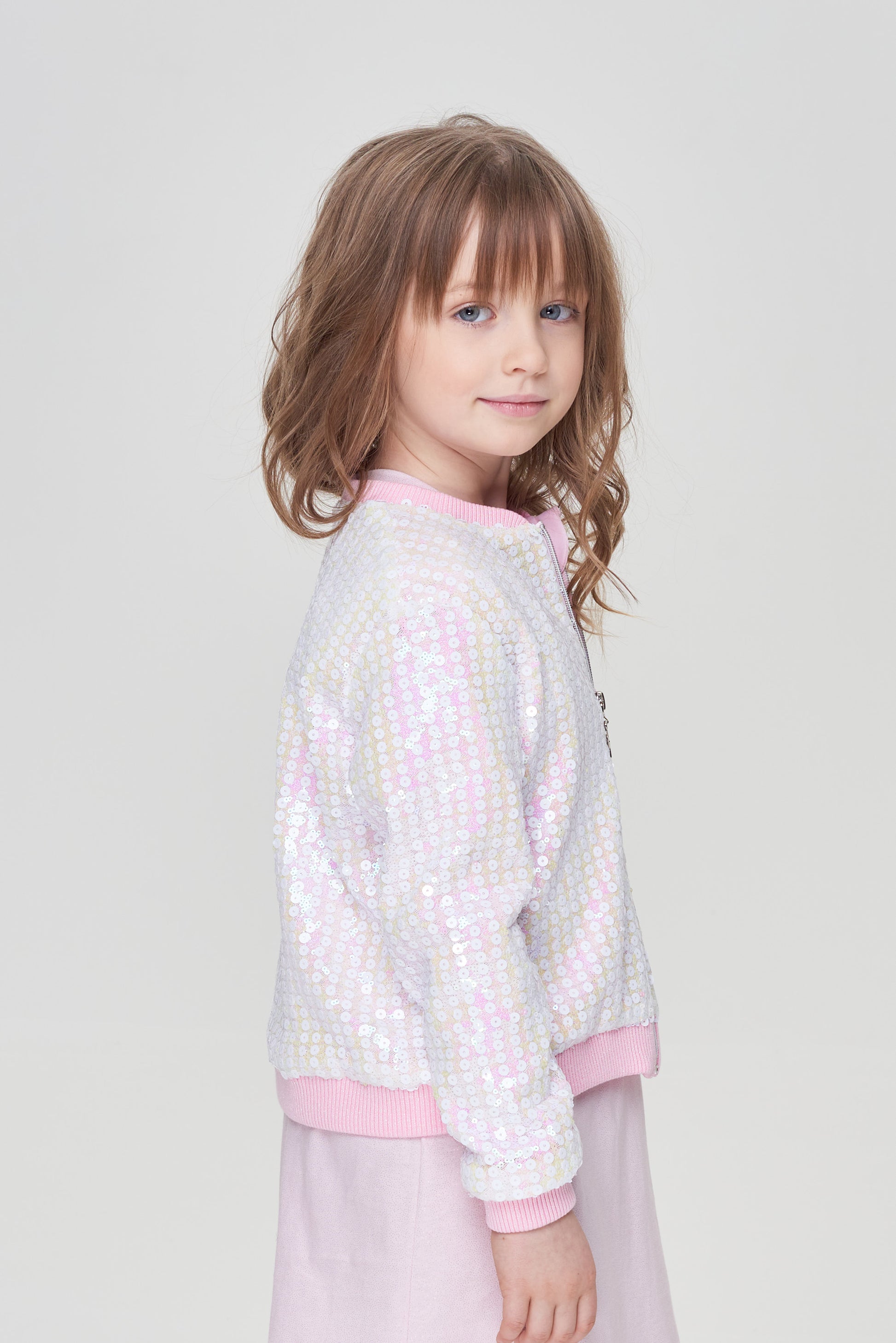 Comfort in pearl pink tones. The original bomber jacket for the girl does not restrict movements and is ideal for walking in cool weather. Model of medium volume, straight silhouette, with zip. A small stand collar, edge and cuffs are made of elastic knitwear in a white and pink stripe.