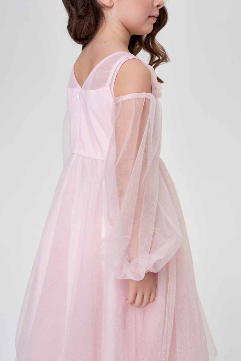 Gentle splendor for the young queen of any ball. A long dress in a charming nude palette is created for girls who prefer outfits with a slight shade of retro. The cut-off bodice with short puffy sleeves and a semicircular neckline on the front is decorated with rich embroidery. A long corrugated skirt with crinoline is decorated with two rows of ruffles. The waist is emphasized by a narrow satin belt.