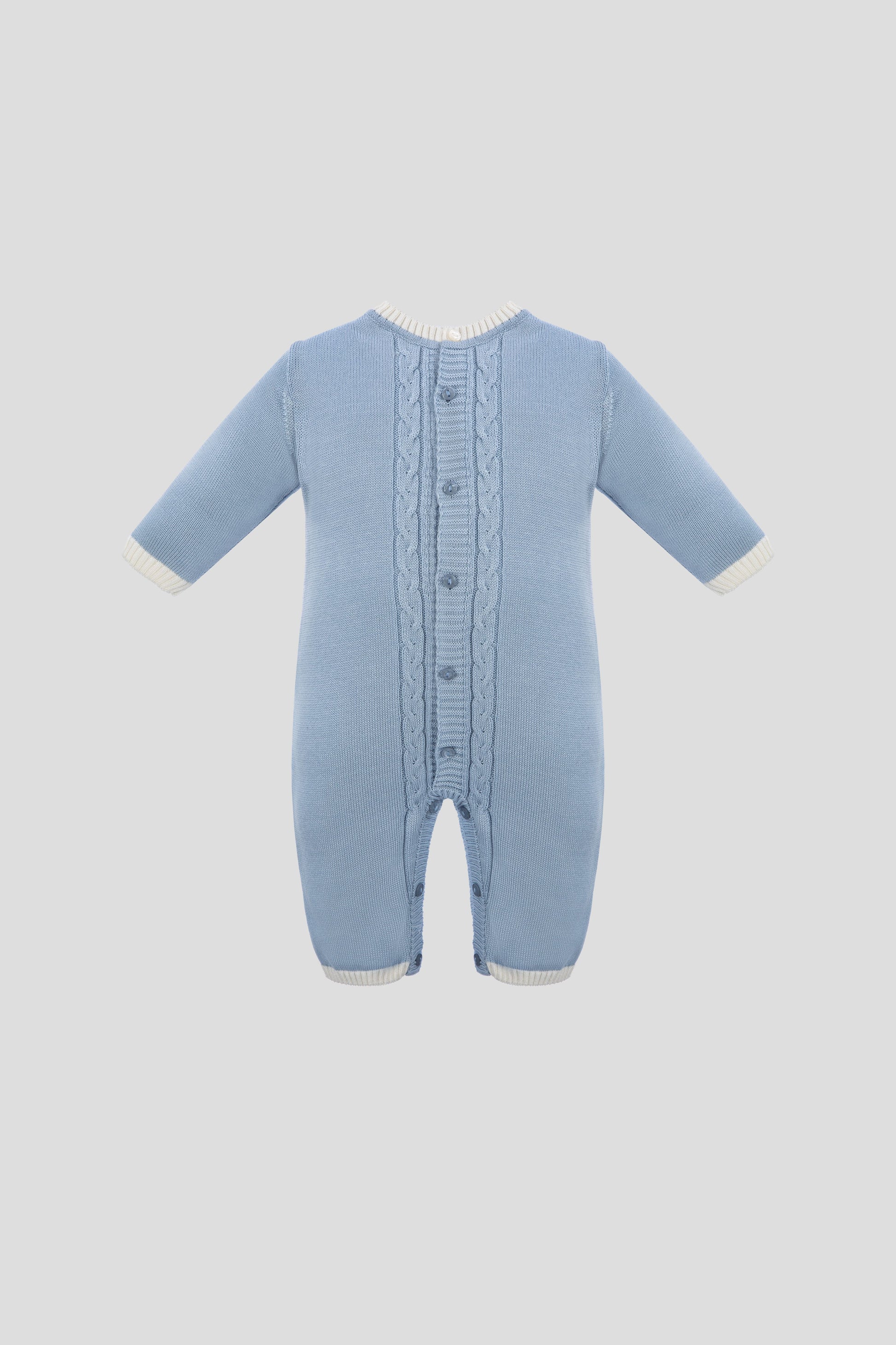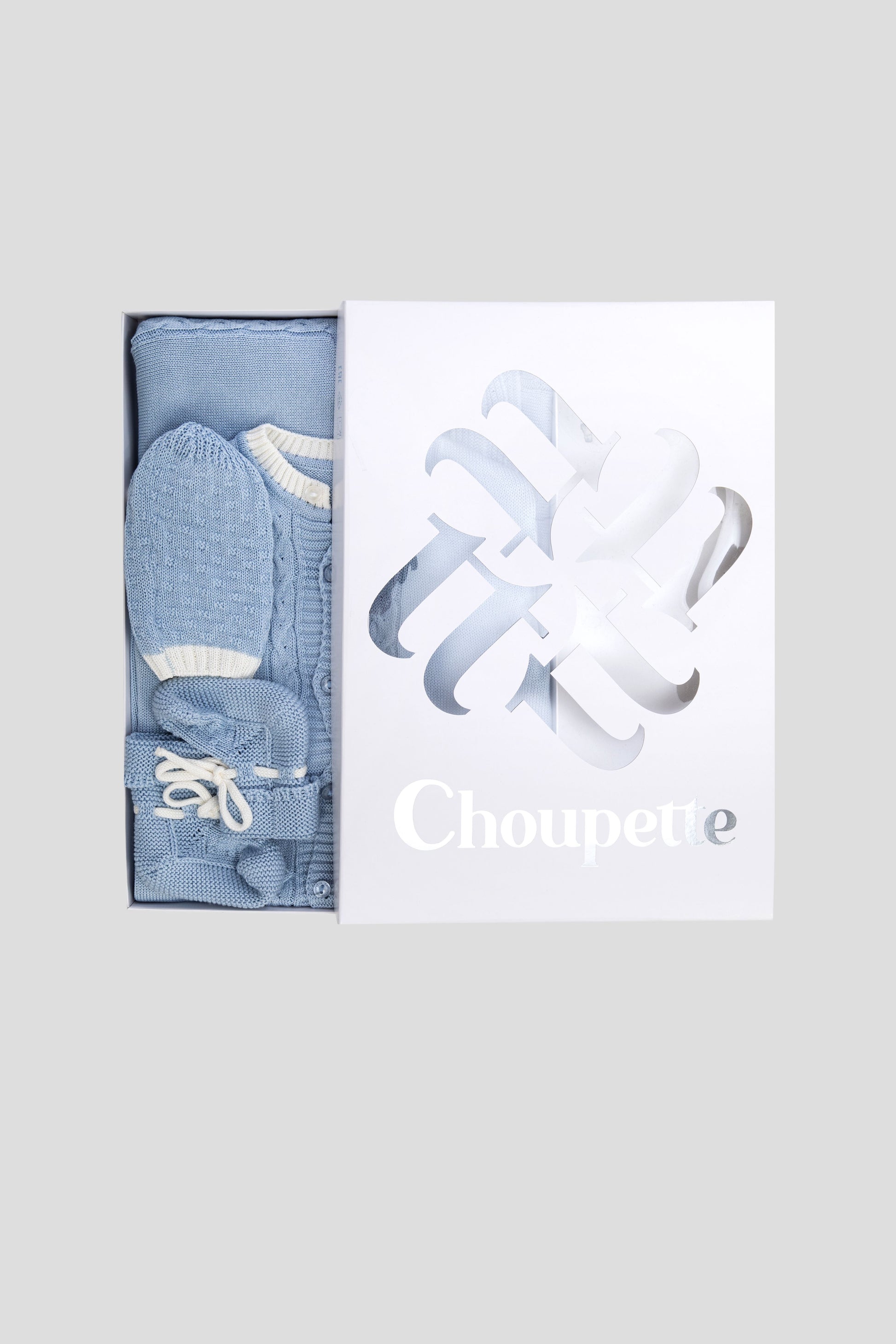 This unique set includes a blanket, jumpsuit, hat, and booties, all crafted in delicate knitting technique, creating a distinctive look and providing a sense of comfort and warmth.