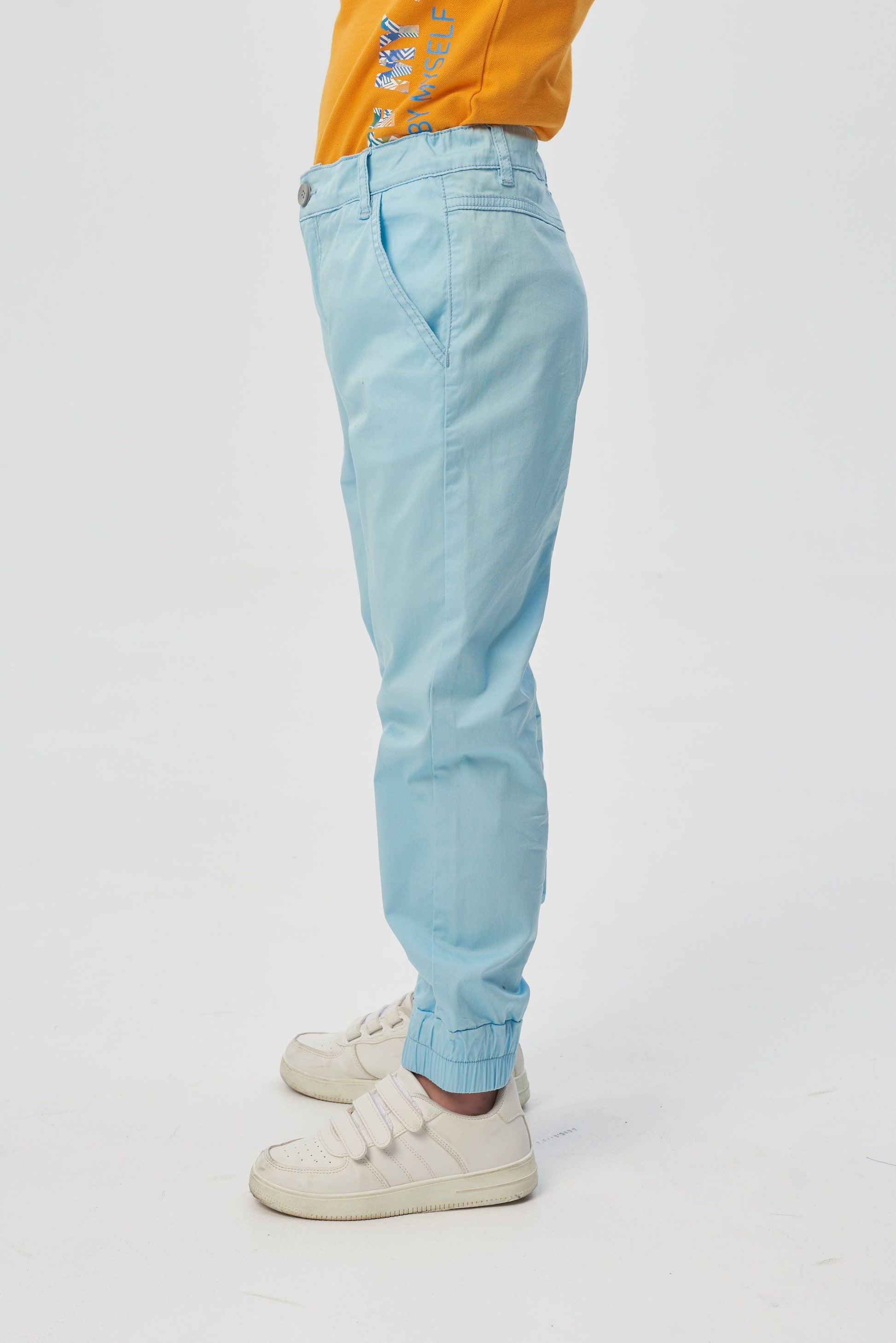 The basic trousers of a comfortable direct silhouette are made of high -quality mixed fashionable turquoise color. A cotton -based model passes the air well, allows the child body to breathe, so trousers are well suited for the summer and spring period. You can modify the trousers with the help of a belt - for it. Zip and button pants are fastened.