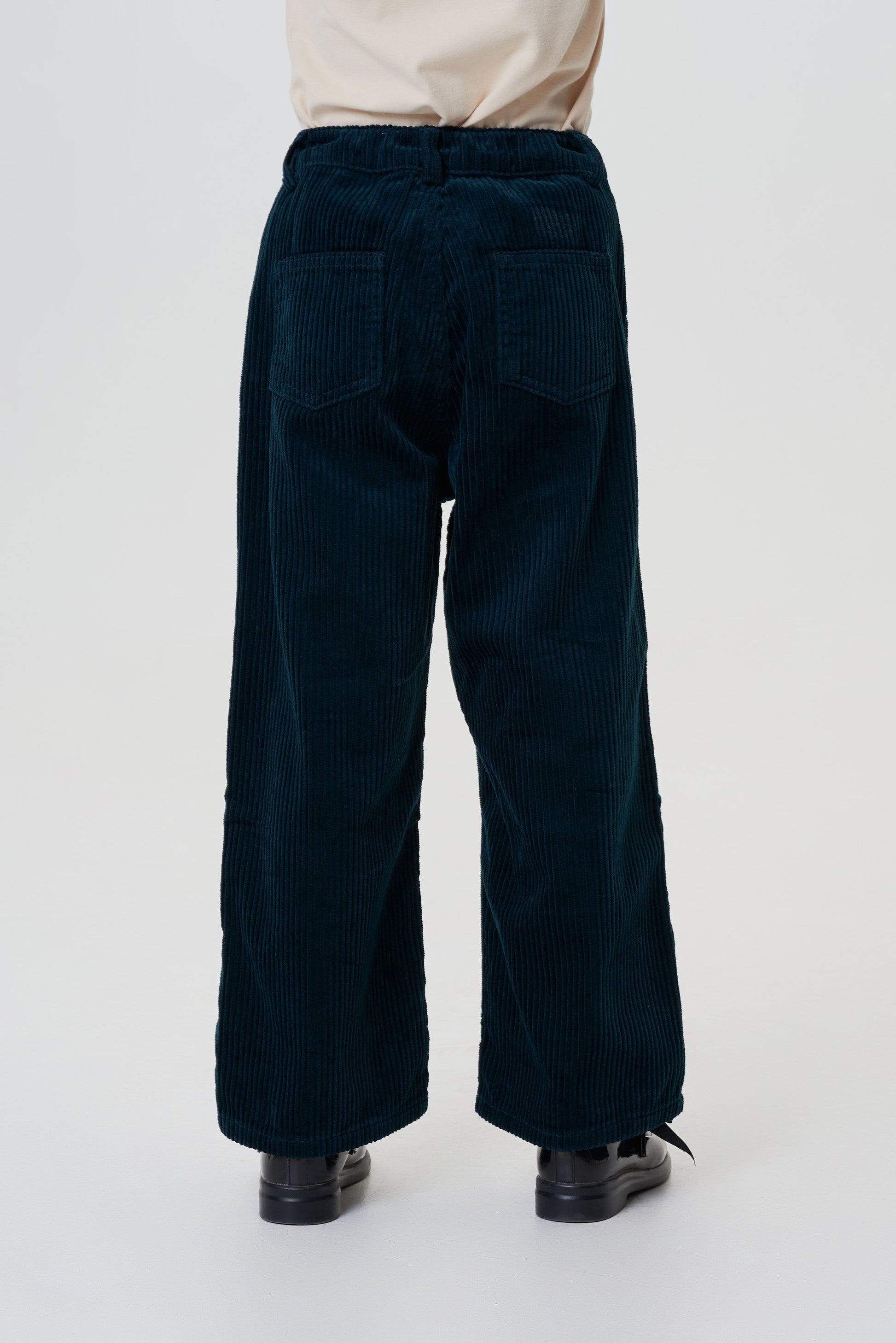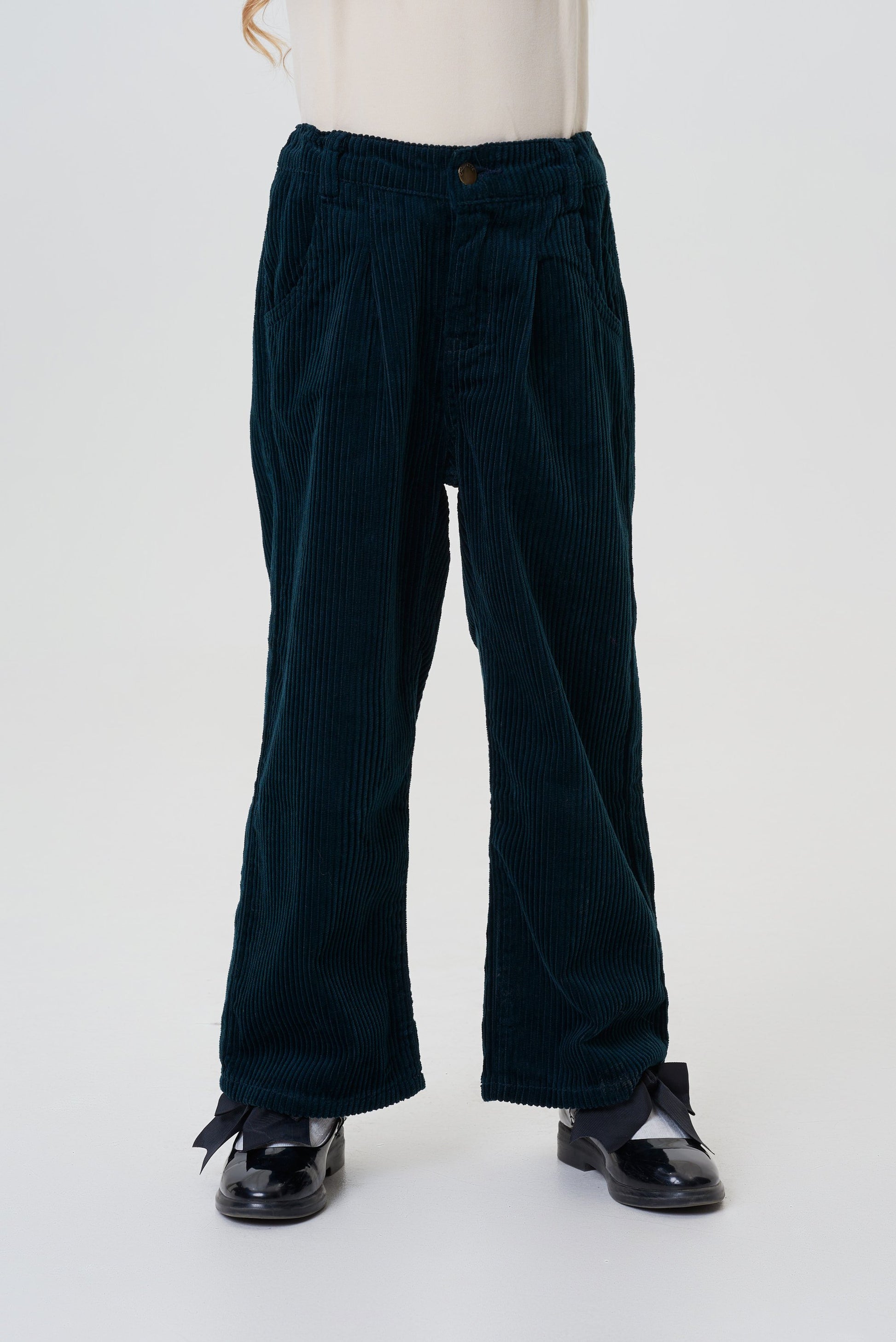 Stylish wide cargo pants with a high waist are an excellent choice for a girl who prefers comfortable vintage-style clothing. The straight-cut model is made of soft velvety fabric in an exquisite dark emerald color with a ""boiled"" effect that gives it a noble vintage look. There is a flap pocket with a flap on the left leg. Belt loops help achieve the perfect fit.