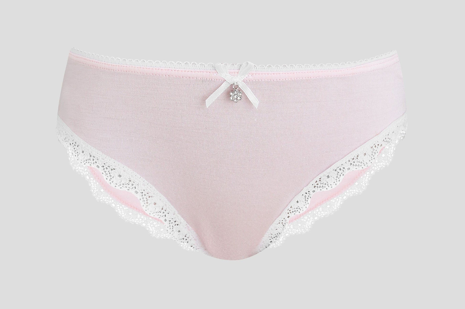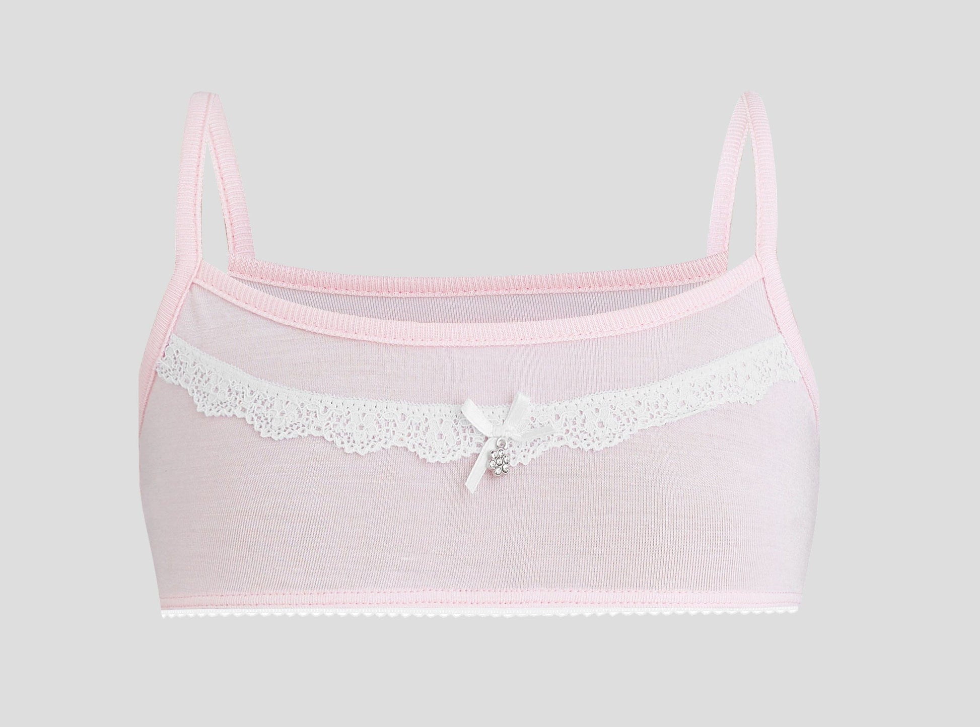 Set of underwear for girls. Tight fitted top on the narrow straps with a bow and lace along the top edge and panties with a classic fit with a broad sideways, bow and lace trim around the edges. Set is made of soft modal with elastane.