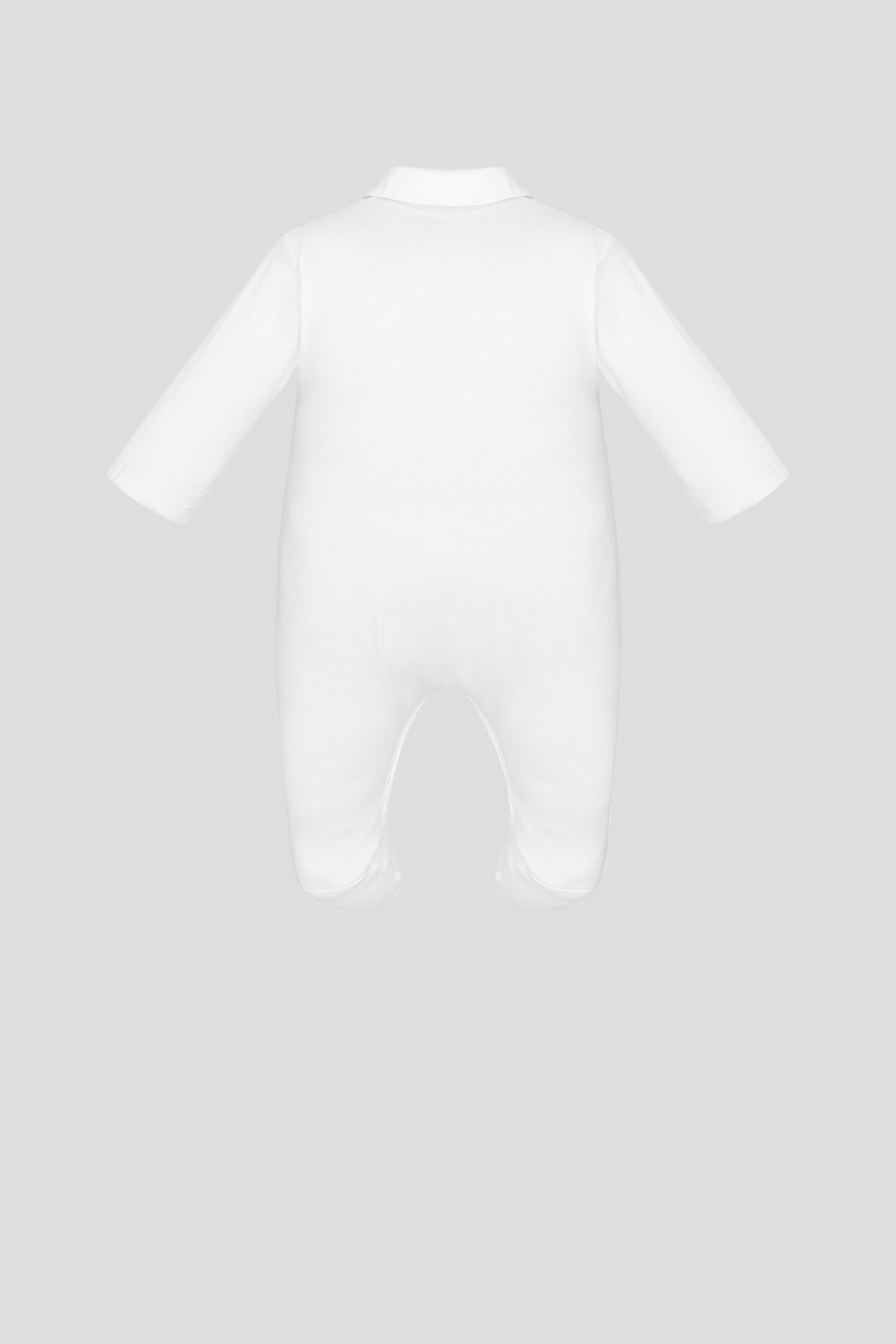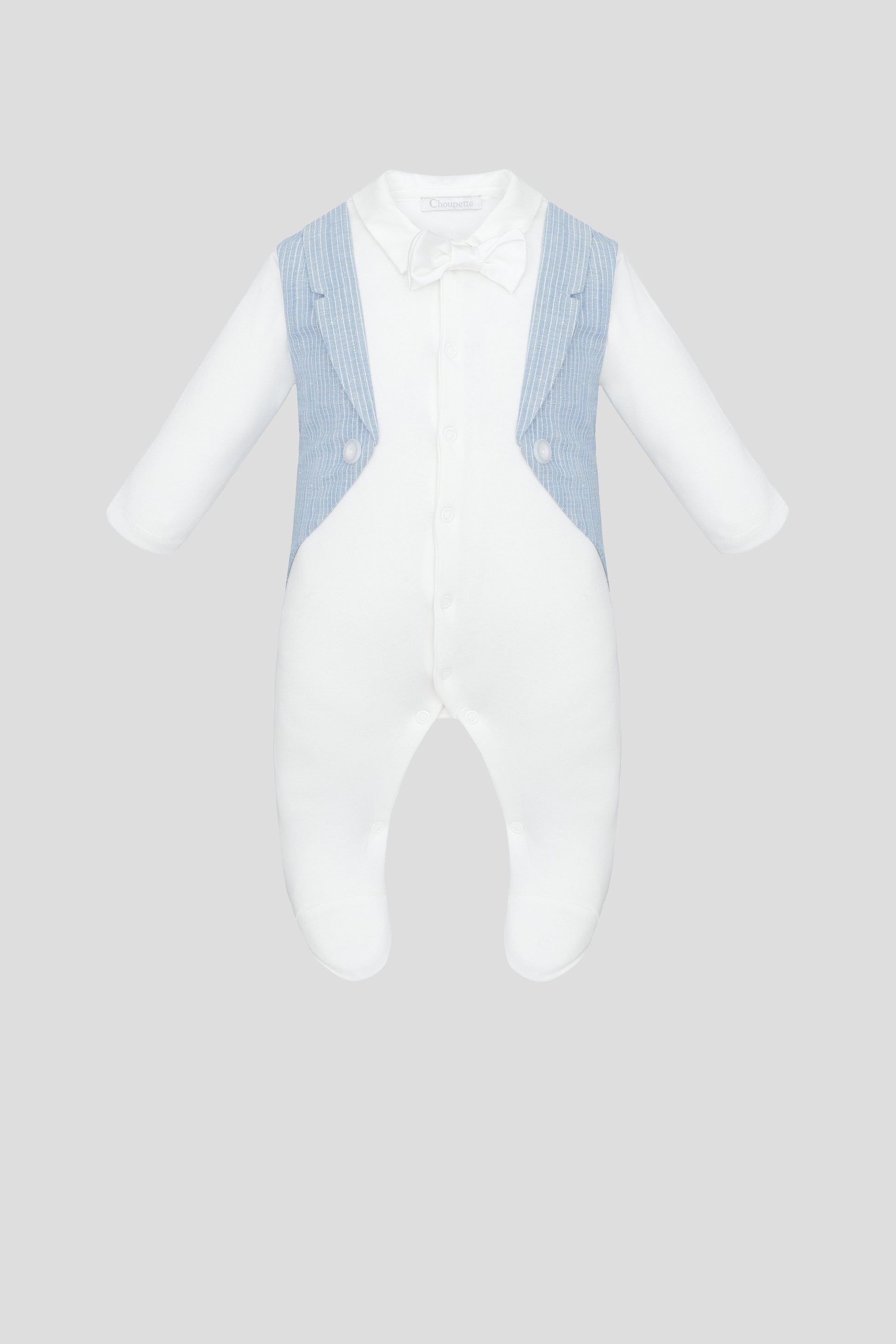 The underlying overalls with closed sleeves and legs of 100% of the ecrew color is complemented by imitation of a vest of blue fabric in a white strip. The neckline is decorated with a striped textile insert, near the neck-a bow tie. The central button fastener will allow you to quickly change your baby away. A round cotton cap with ties is made of delicate knitwear by the seams out.