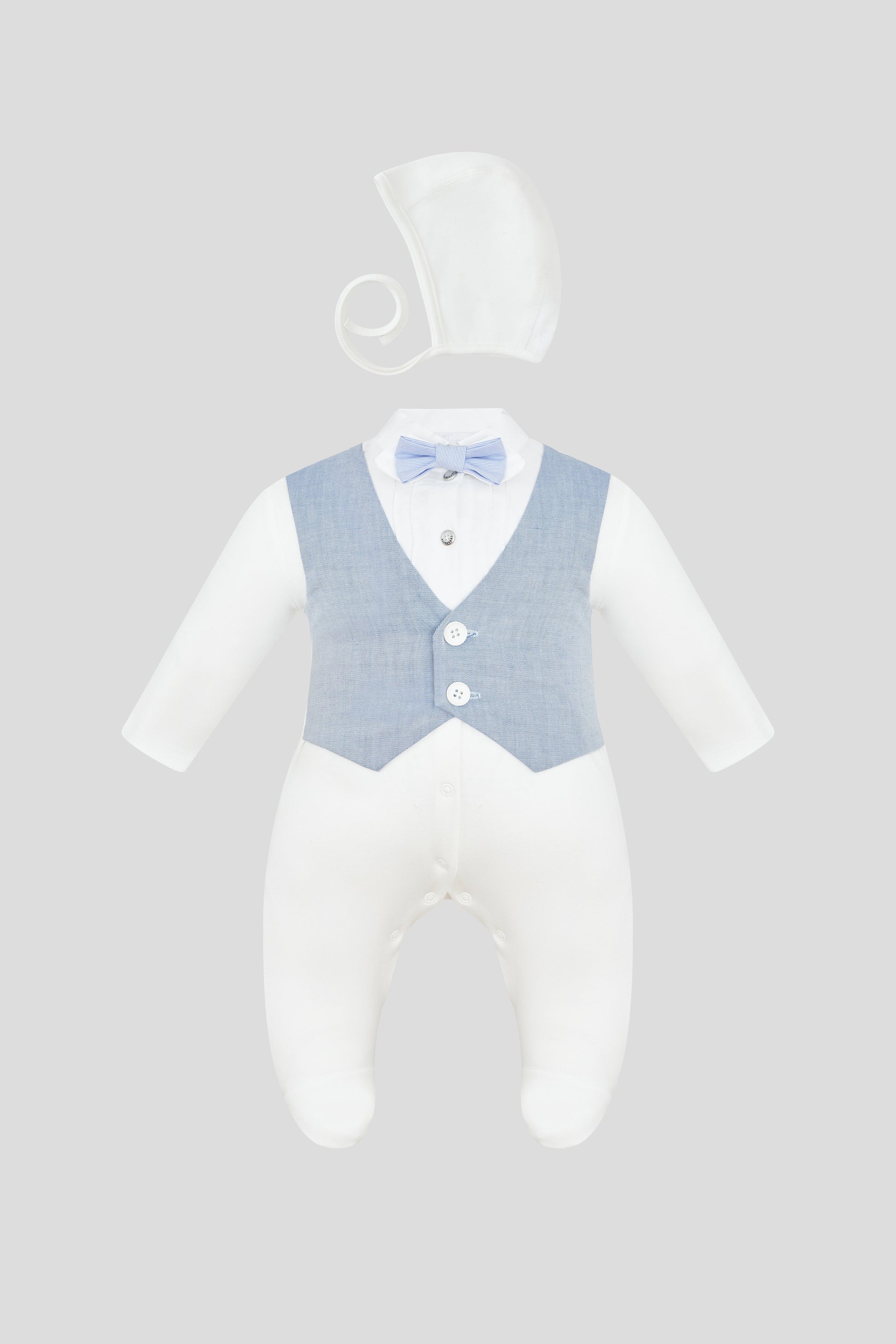 In this formal set for boys, your little one will look particularly charming, thanks to the adorable vest imitation. The romper with closed feet and a central button fastening is made of solid ecru-colored cotton, while the vest imitation is made of blue fabric with fine ribbing. The neckline is decorated with striped fabric, and there's a bowtie near the collar. The set is completed with a bonnet. Material: 100% cotton.