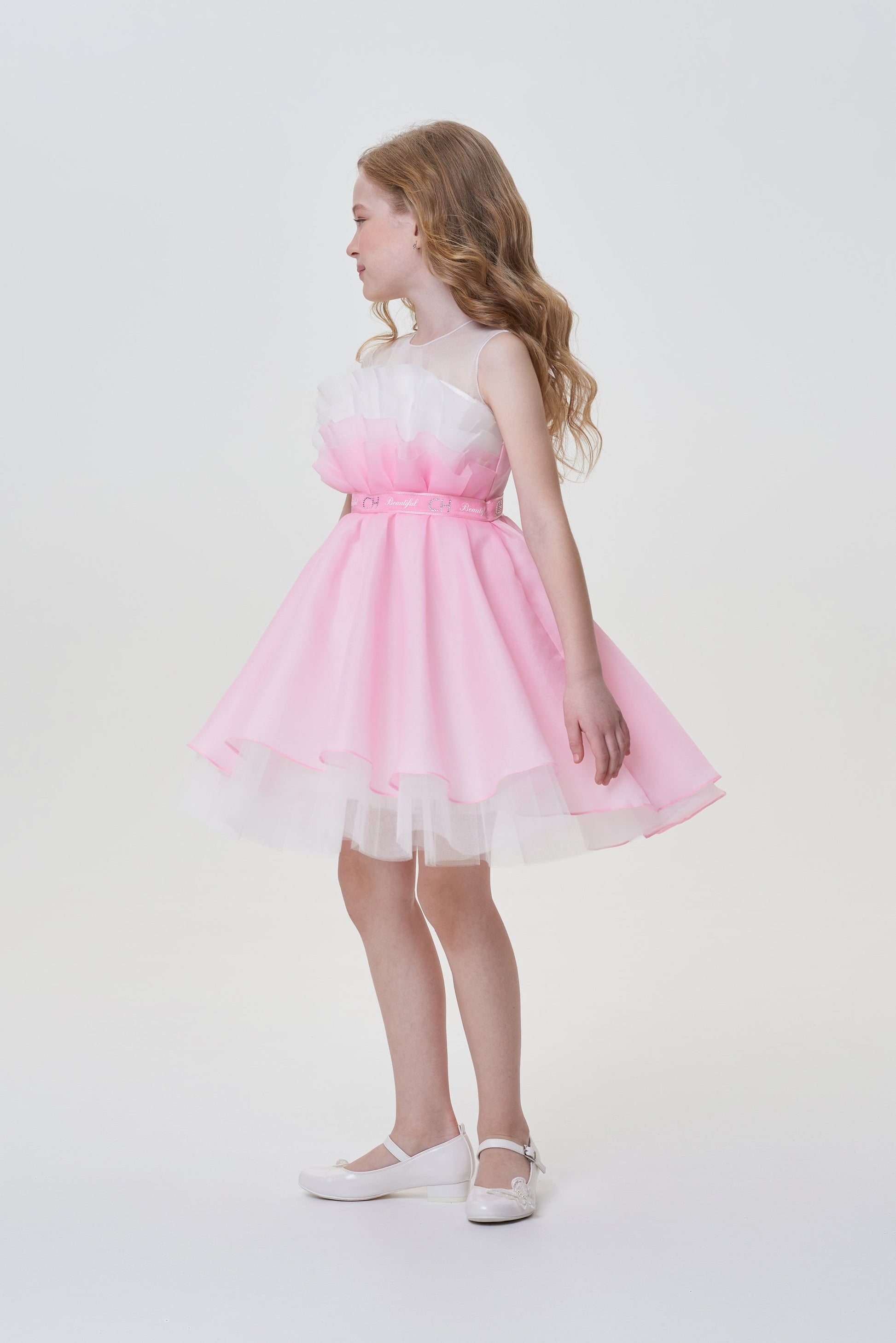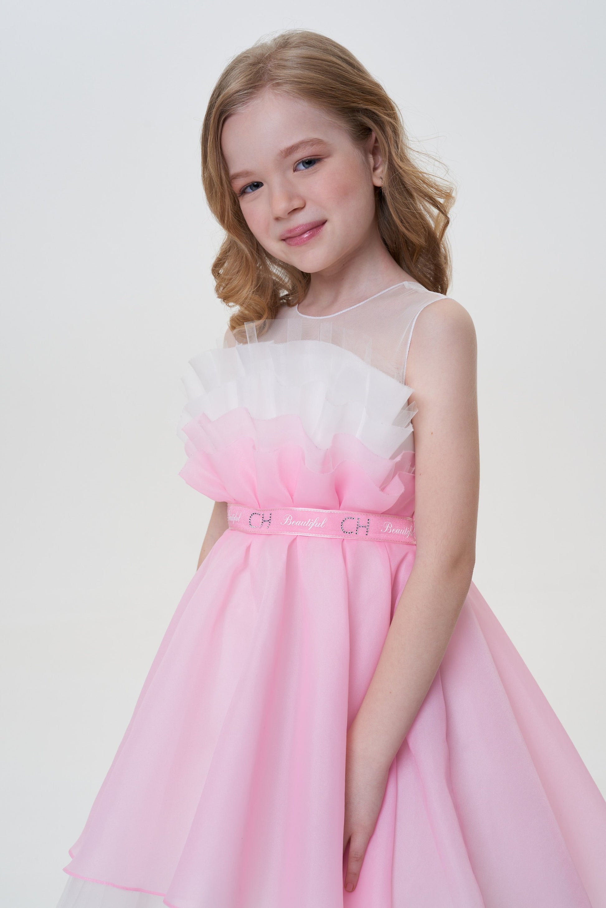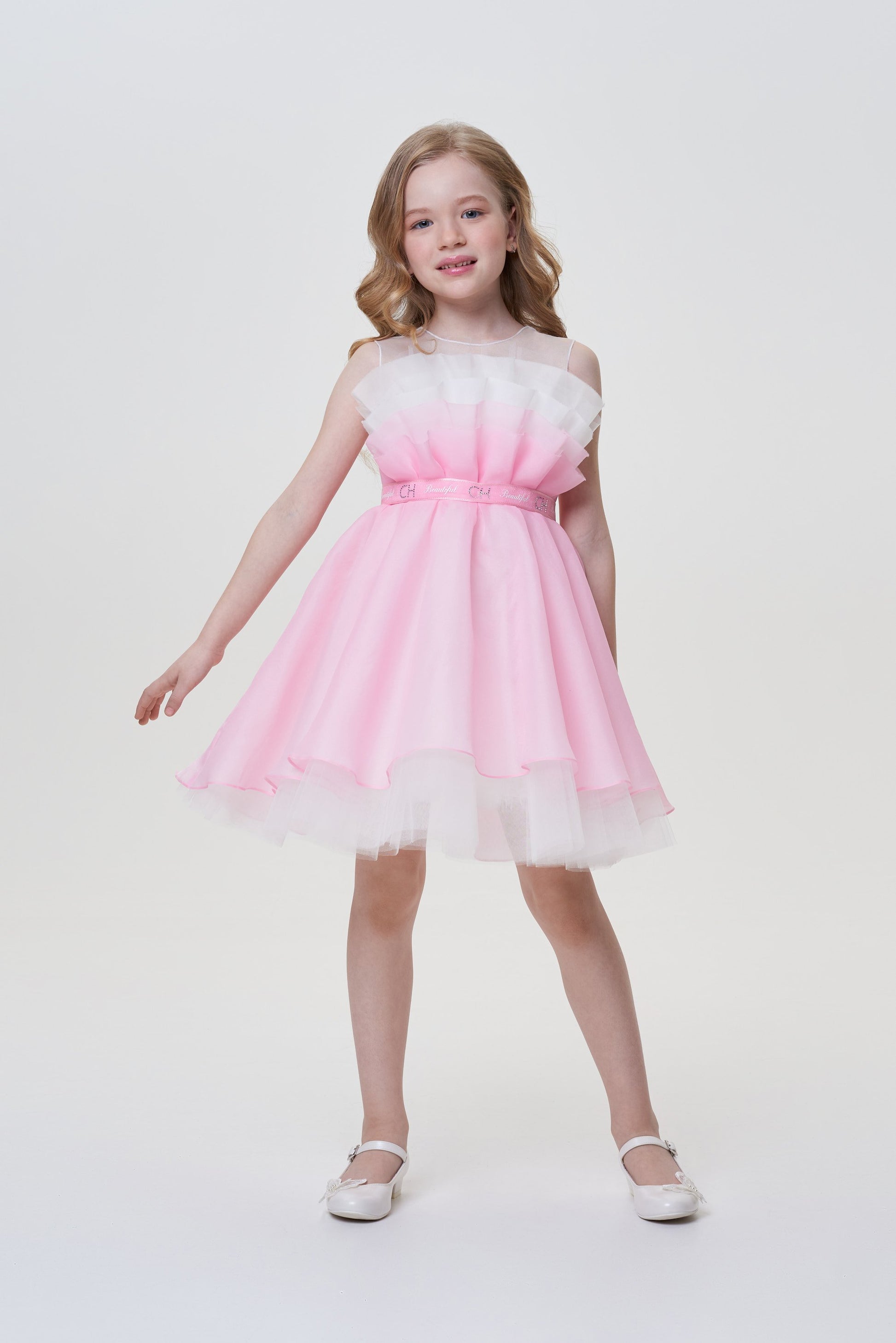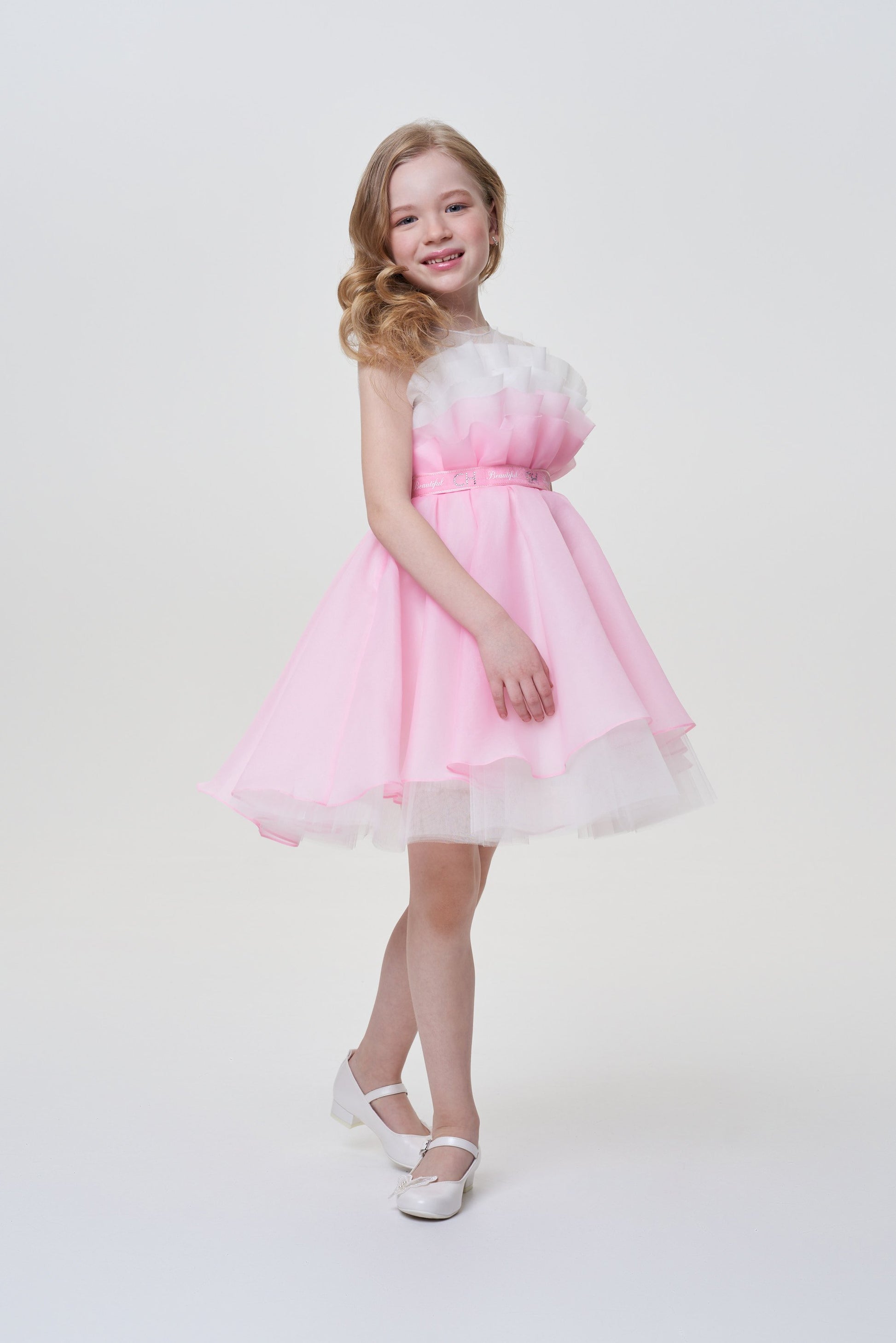 The style of this elegant dress with outstretched shoulders for the girl resembles an inverted downy tulip bud. The basis of the product is made of white cotton comfortable for skin. The upper skirt of brilliant pink fabric is supplemented by a hem from the translucent tulle, whose edge flirtingly opens up to the eyes. The dress is held on the shoulders with the help of wide transparent straps. The waist emphasizes the belt from the satin tape.