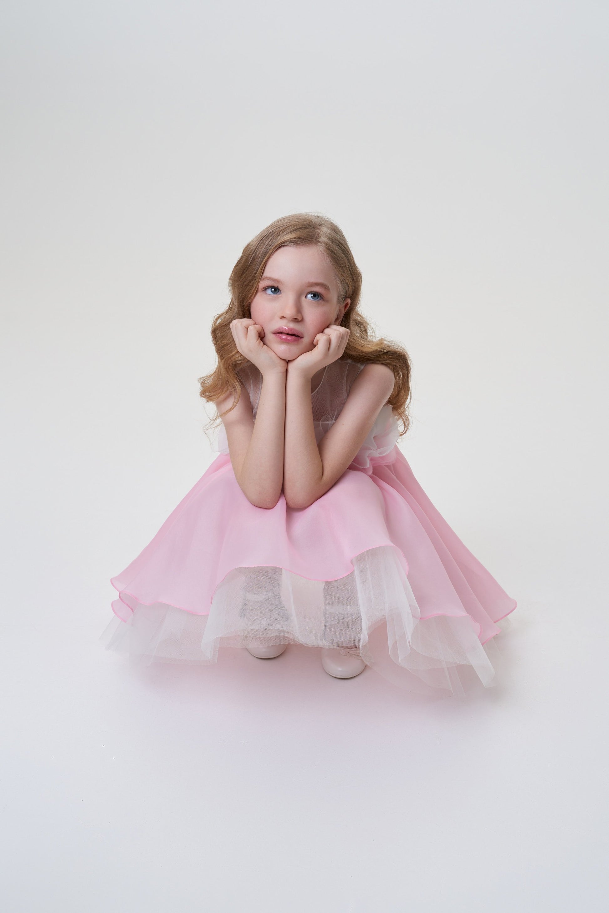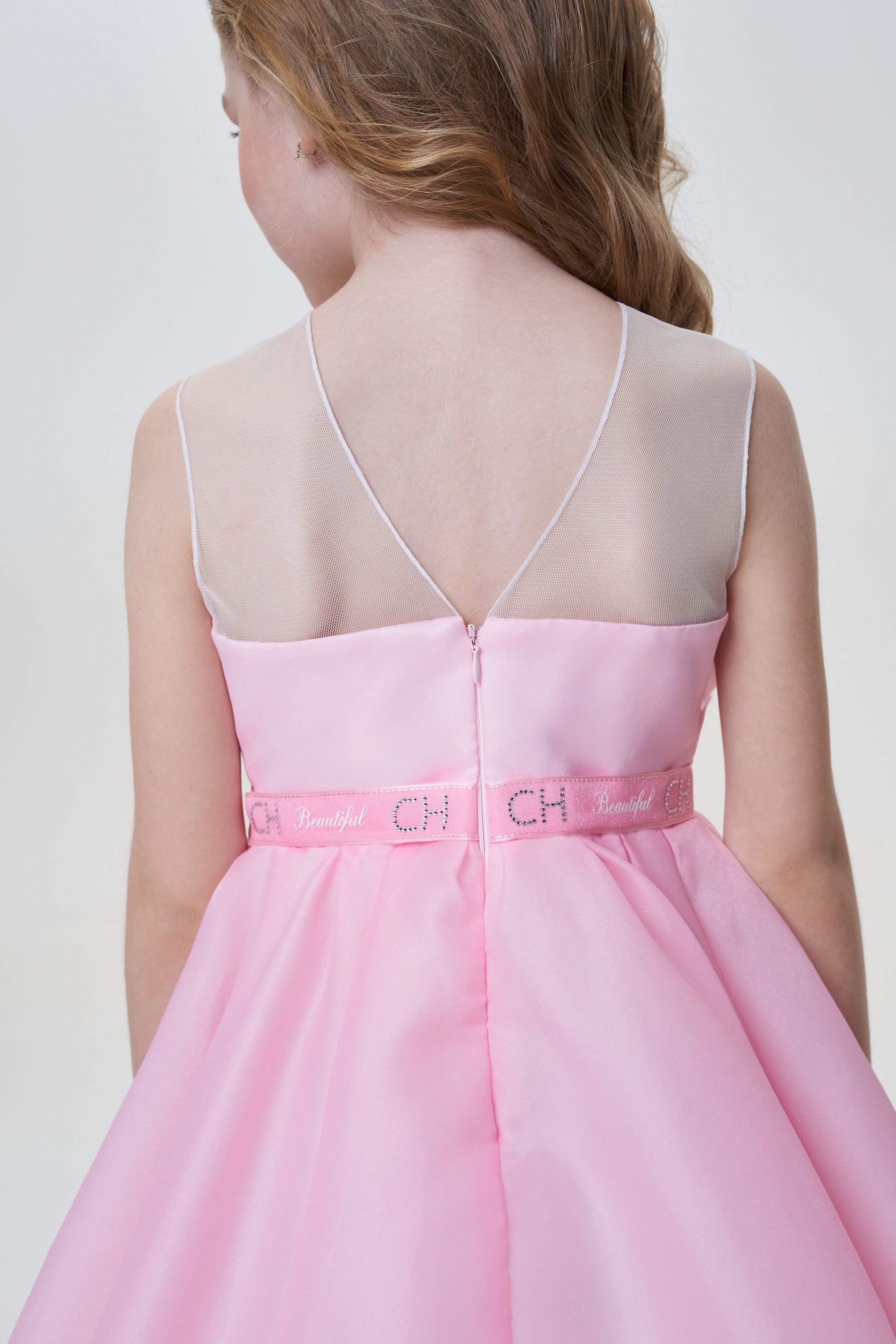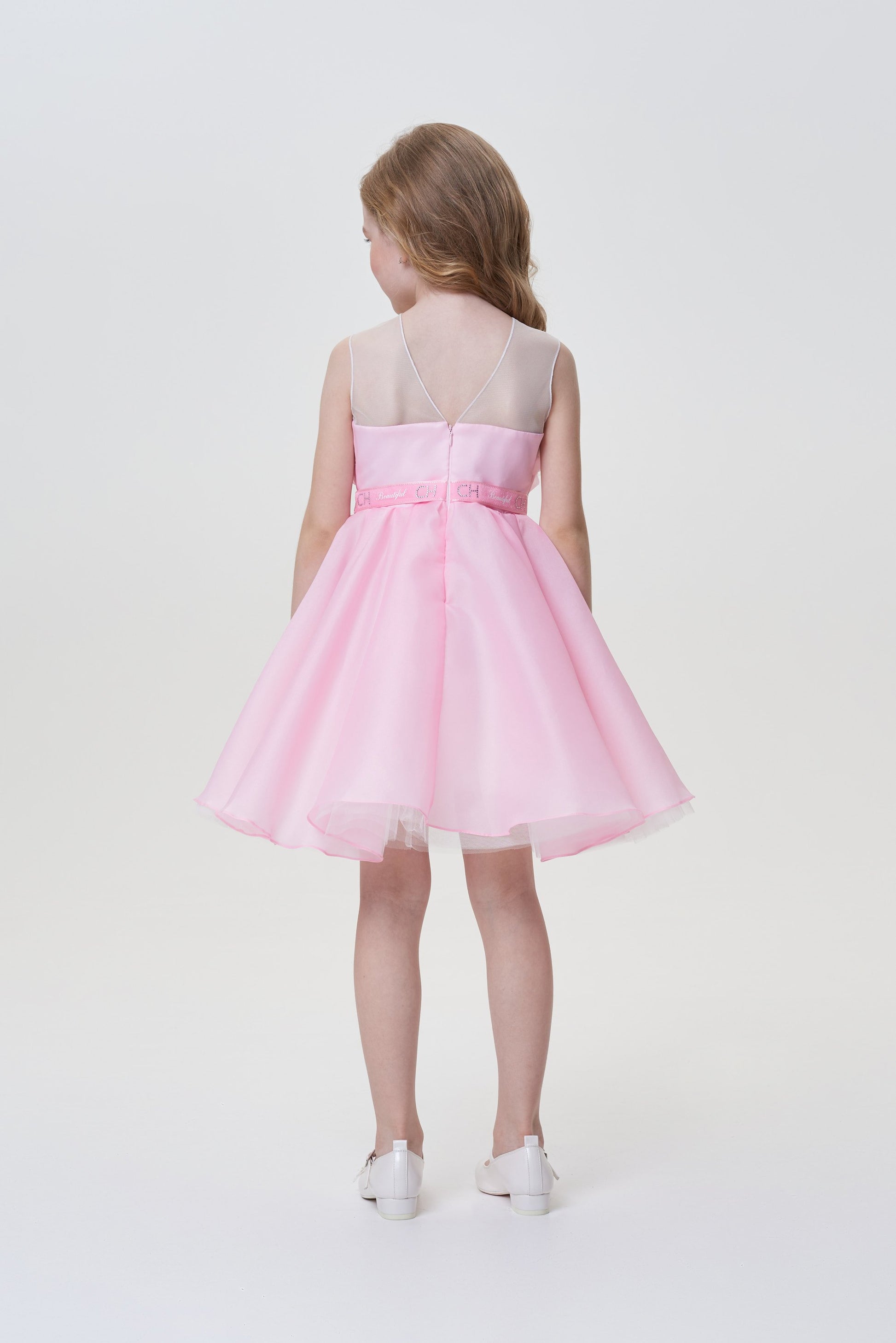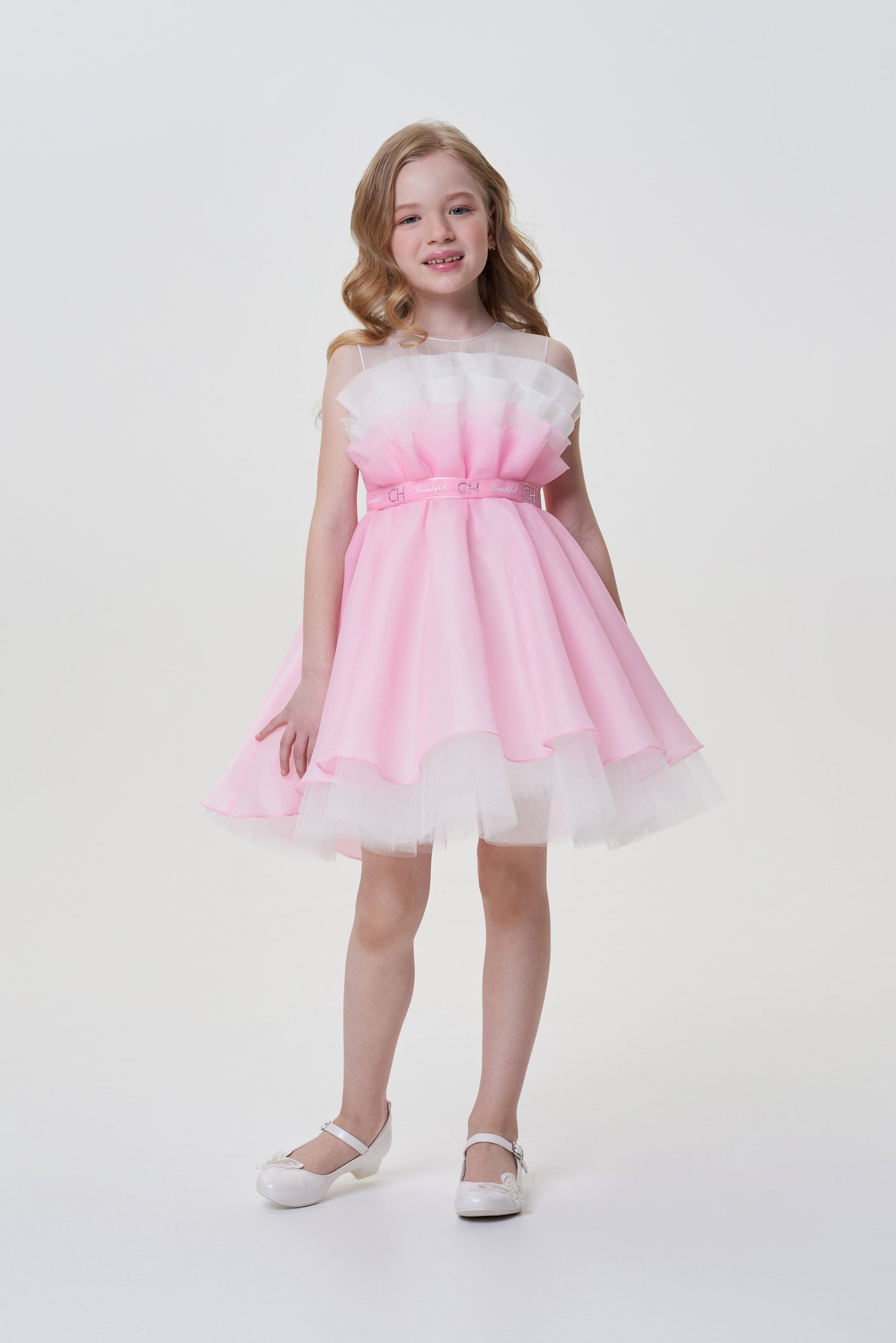 The style of this elegant dress with outstretched shoulders for the girl resembles an inverted downy tulip bud. The basis of the product is made of white cotton comfortable for skin. The upper skirt of brilliant pink fabric is supplemented by a hem from the translucent tulle, whose edge flirtingly opens up to the eyes. The dress is held on the shoulders with the help of wide transparent straps. The waist emphasizes the belt from the satin tape.