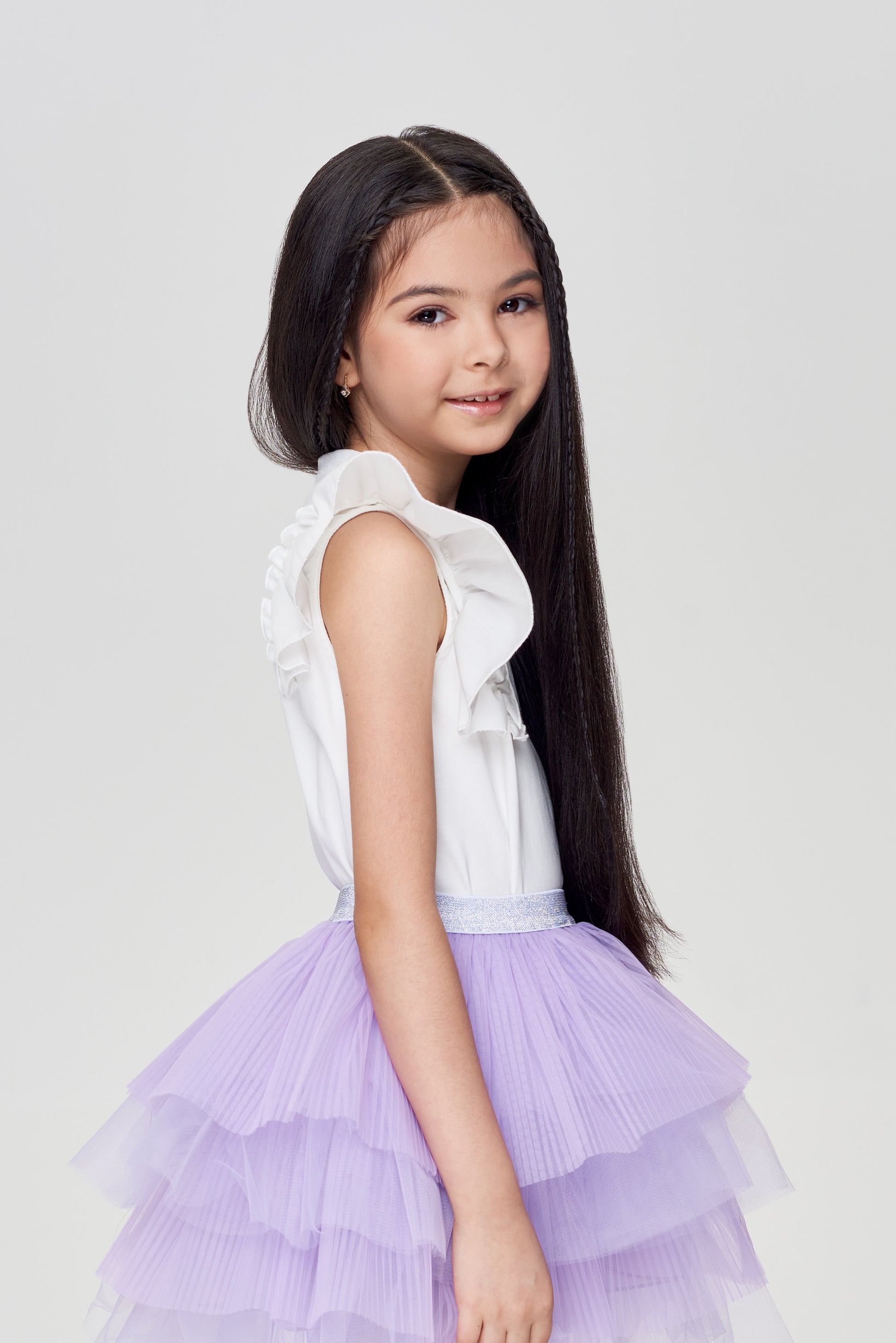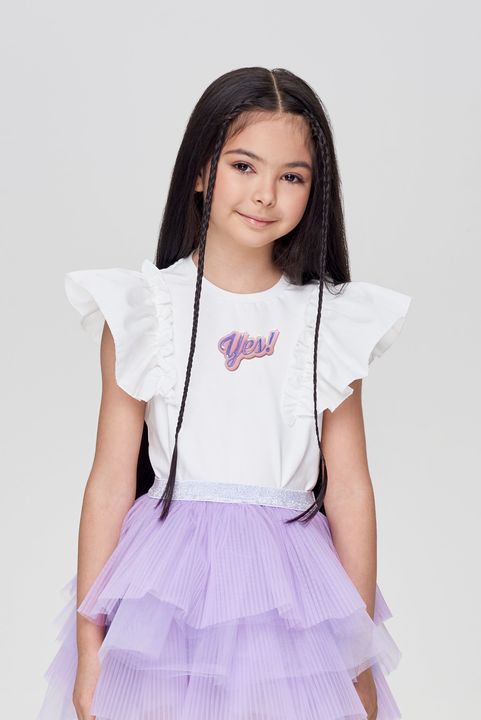 A beautiful and comfortable T-shirt with sleeves-wings is created for girls who love stylish things, but do not like to sit still for a minute. The monochromatic straight-cut model is made of elastic cotton of ecru color. On the front, the product is decorated with a small print with the image of a shimmering sapphire.