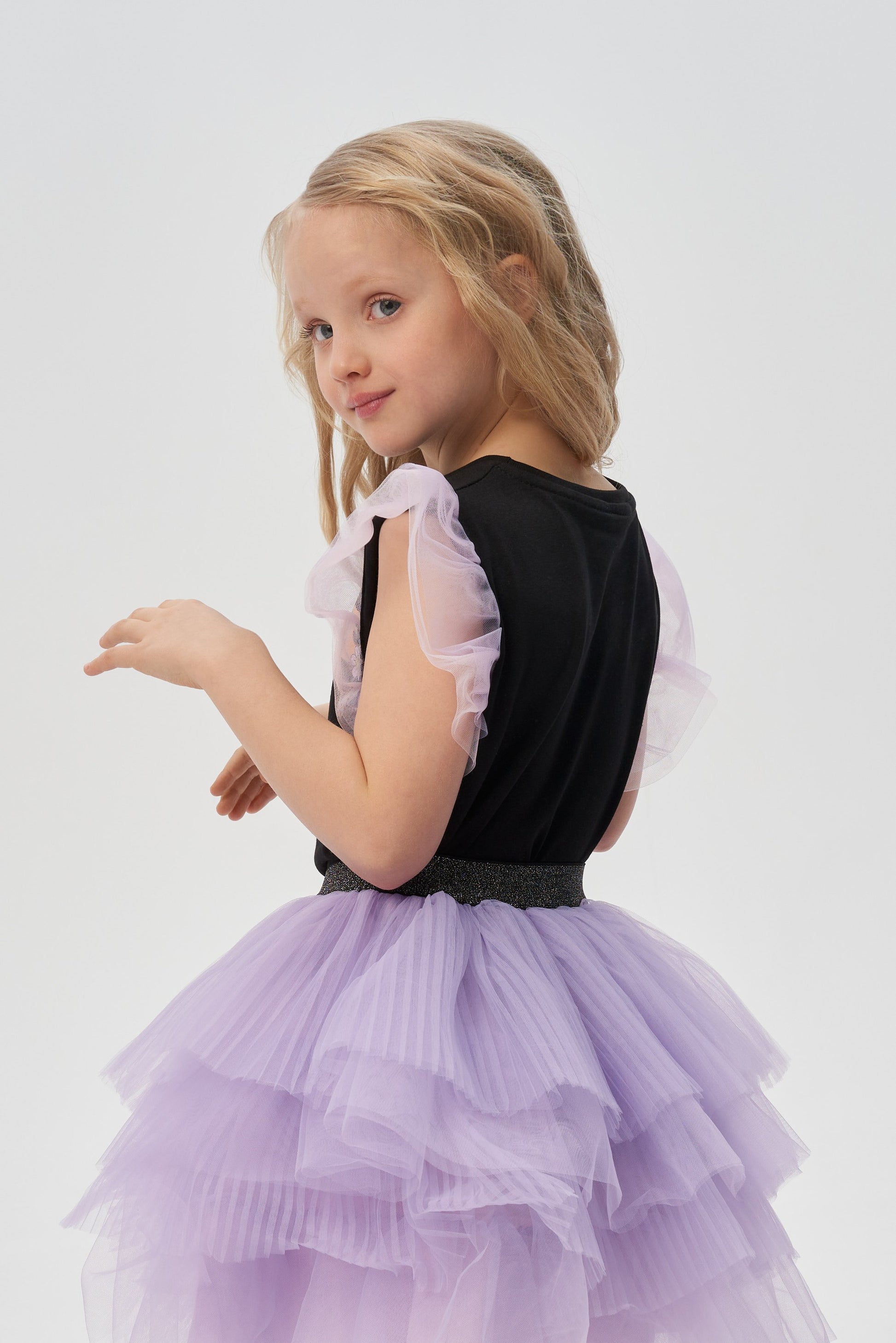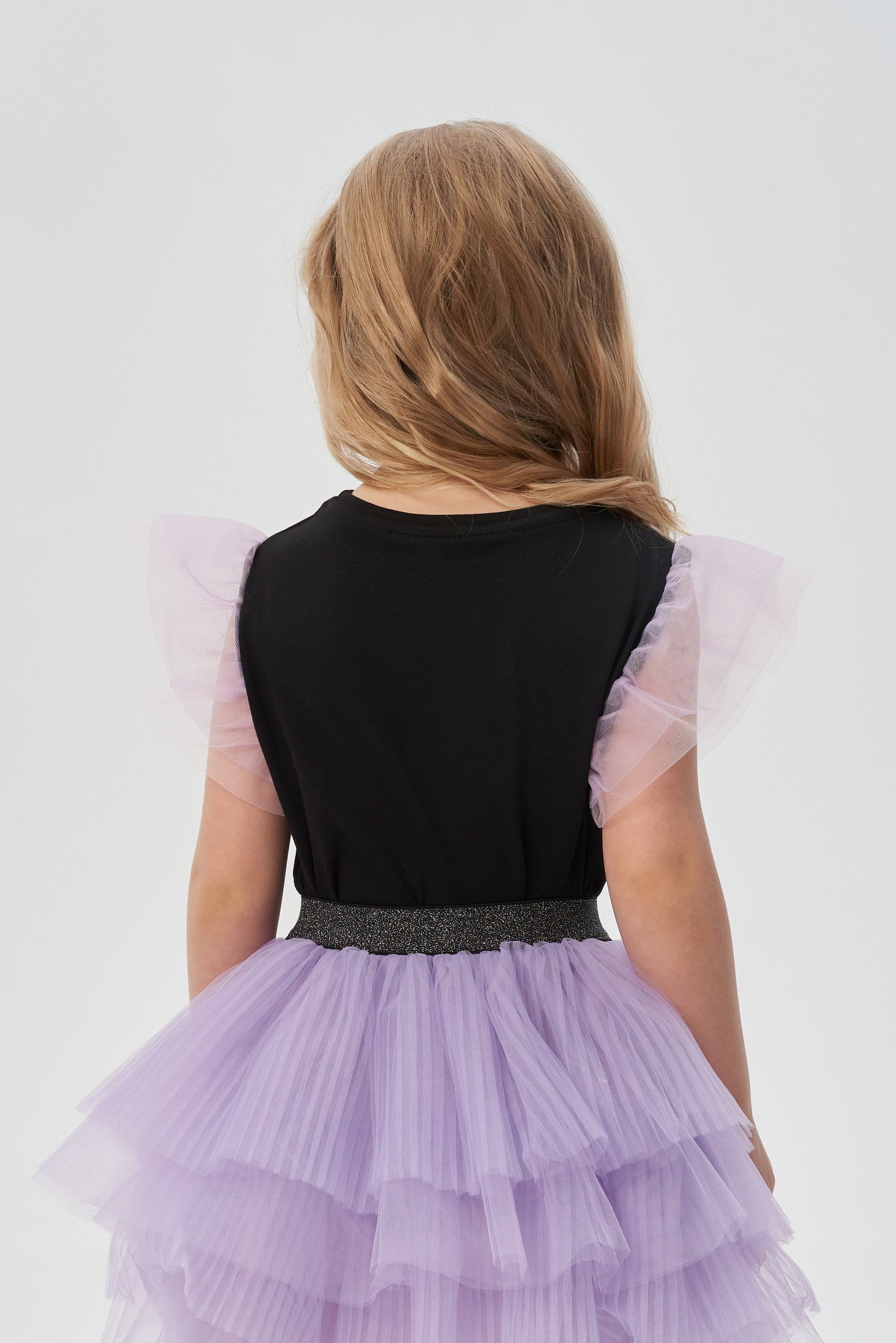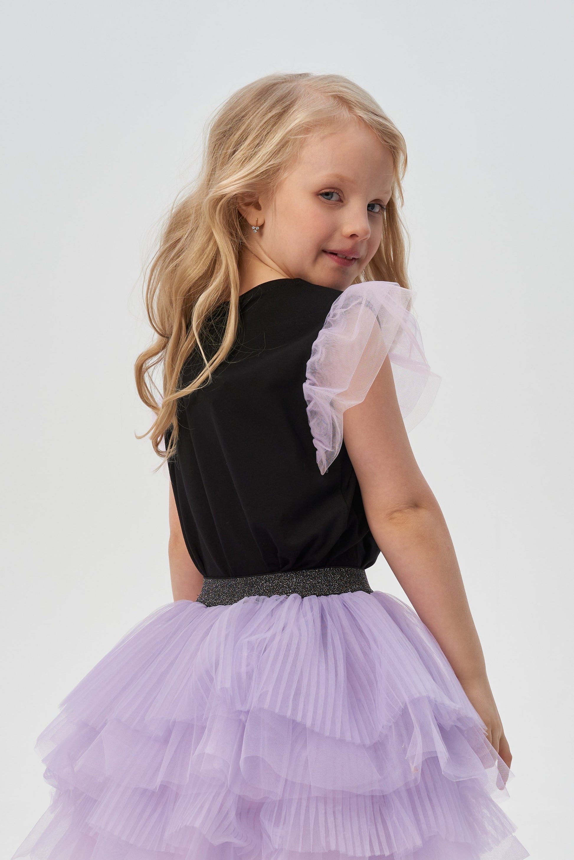 . A direct cut model of plain knitwear is complemented by playful holes from pink grid. In front, a print with the inscription ""Change"" of multi -colored letters.